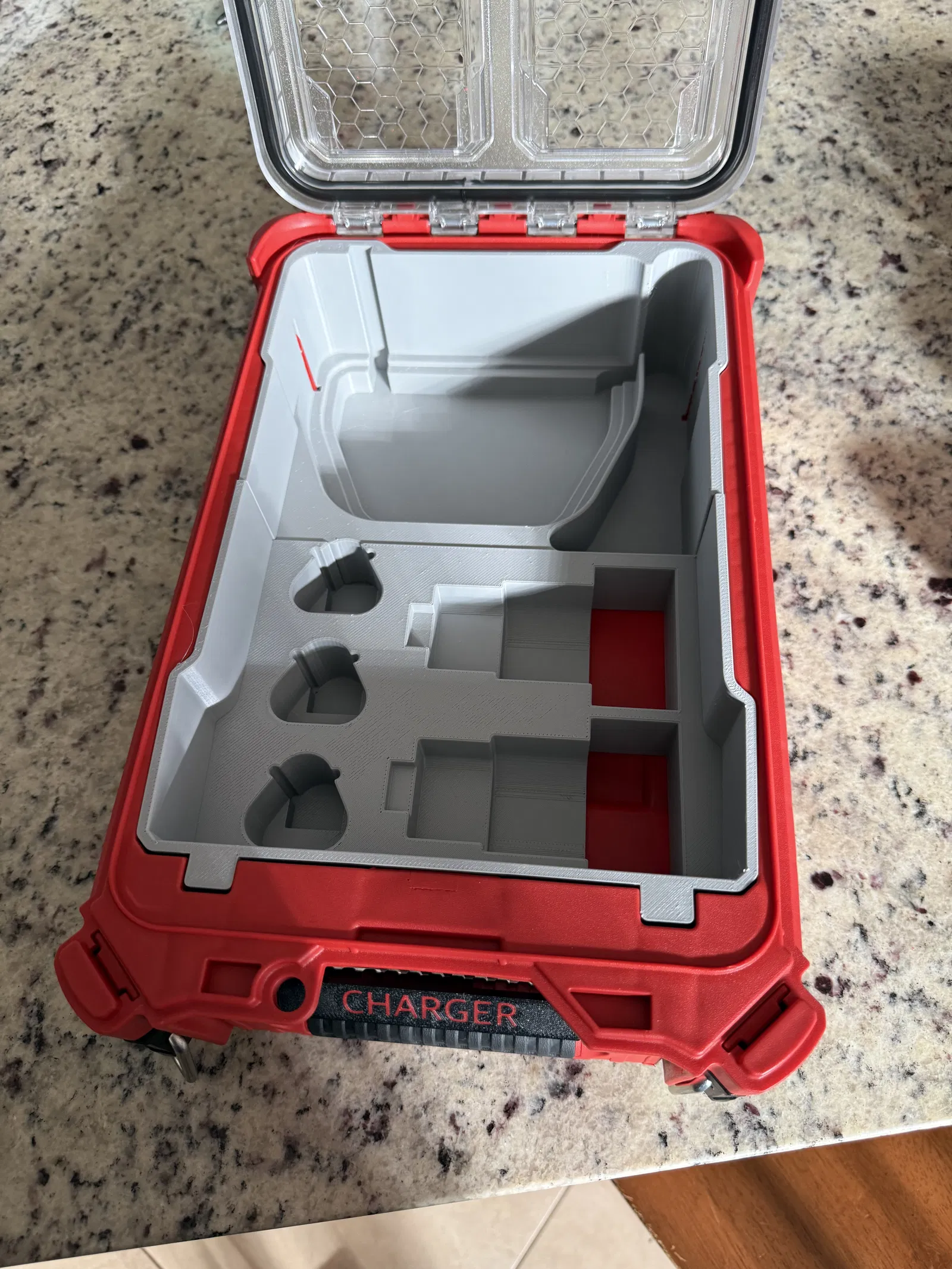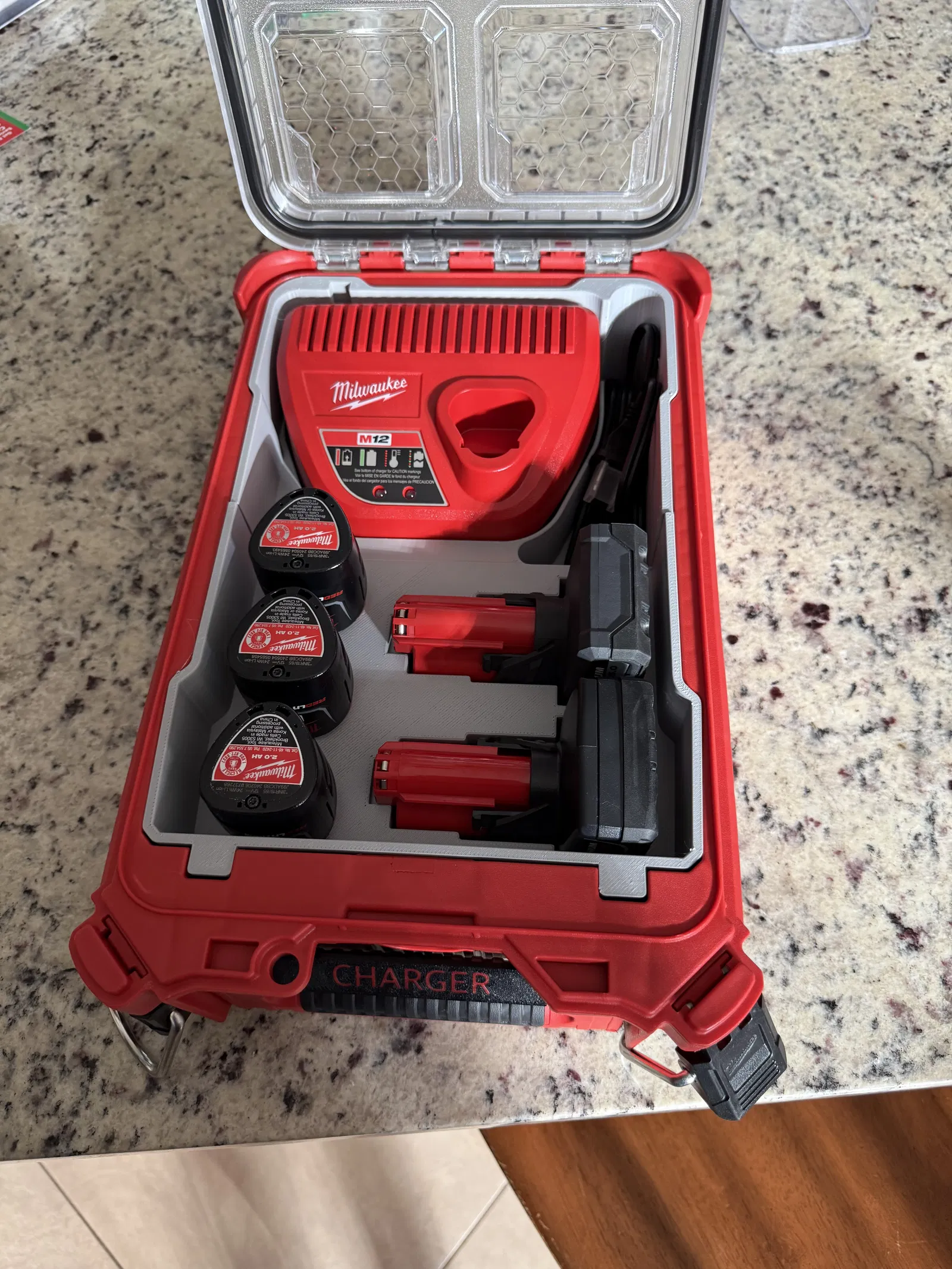 Cái khay này sẽ đựng 5 viên pin M12 (3 loại CP và 2 loại XP) cùng với bộ sạc M12 tiêu chuẩn trong một cái thùng Milwaukee 48-22-8435 Packout.