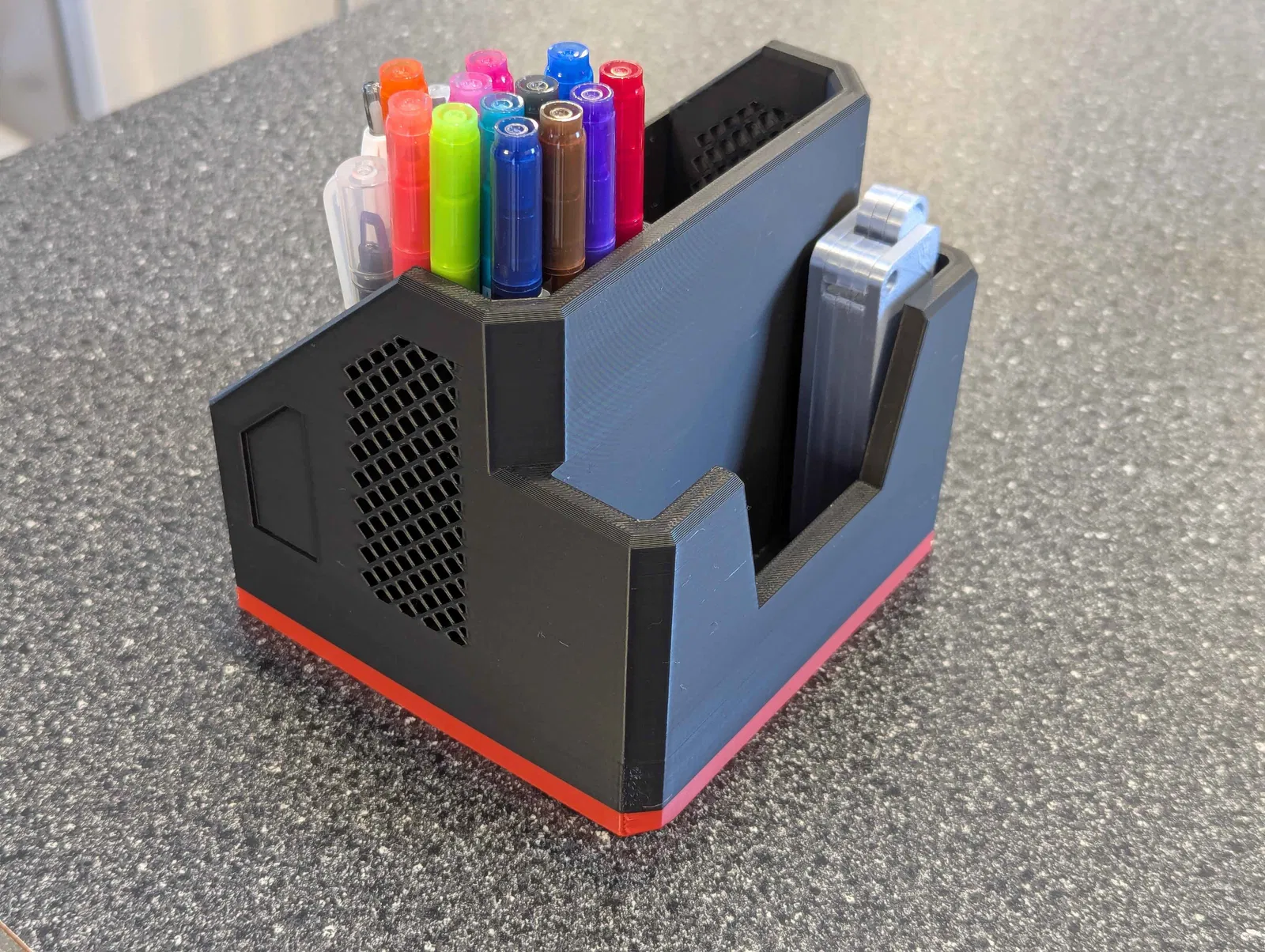 Phiên bản kệ đựng đồ lớn hơn 150%, gộp làm một cho đỡ tốn vật liệu in, thêm khe USB, bỏ khe thẻ nhớ SD/microSD. Sửa lỗi mô hình, không cần giá đỡ.