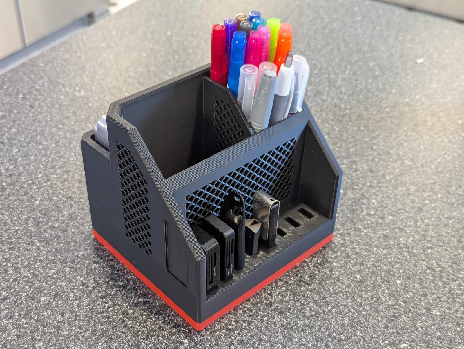 Tôi muốn có một phiên bản lớn hơn của chiếc kệ đựng đồ này để có nhiều chỗ hơn để cất đầu đọc thẻ USB của mình vì chúng không vừa với kệ gốc. Ngoài ra, tôi thích in các vật thể thành 1 bộ phận thay vì 2. Nó loại bỏ sự cần thiết của giá đỡ và giúp di chuyển dễ dàng hơn. Tôi đã loại bỏ các khe cắm thẻ nhớ microSD và SD vì tôi không cần chúng.