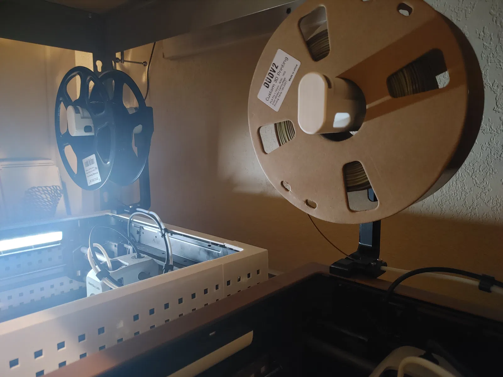 Mẫu này xài cái cục giữ cuộn dây dạng filler https://www.thingiverse.com/thing:3020026 á, nhưng mà hông có kèm theo file của nó đâu nha, nên tự mầy mò chọn cái nào hợp với mình nha, có nhiều mẫu remixed lắm để phù hợp với mọi loại cuộn dây luôn.