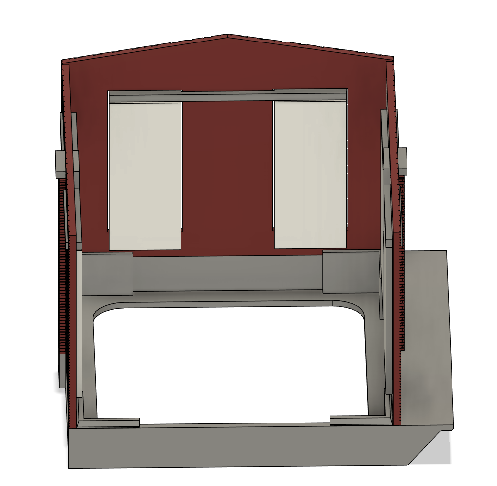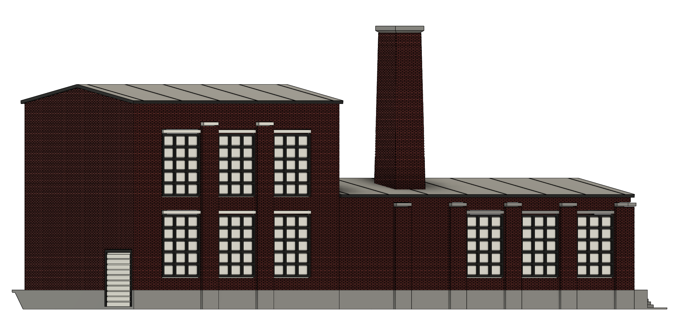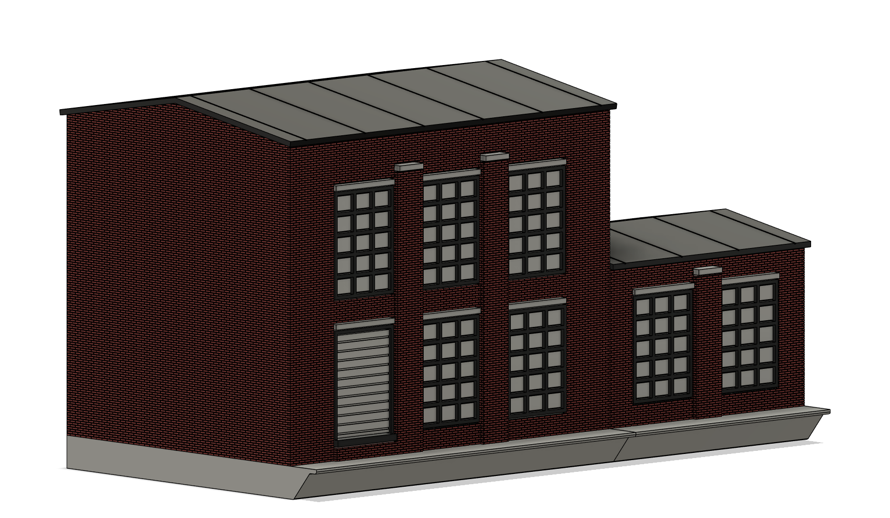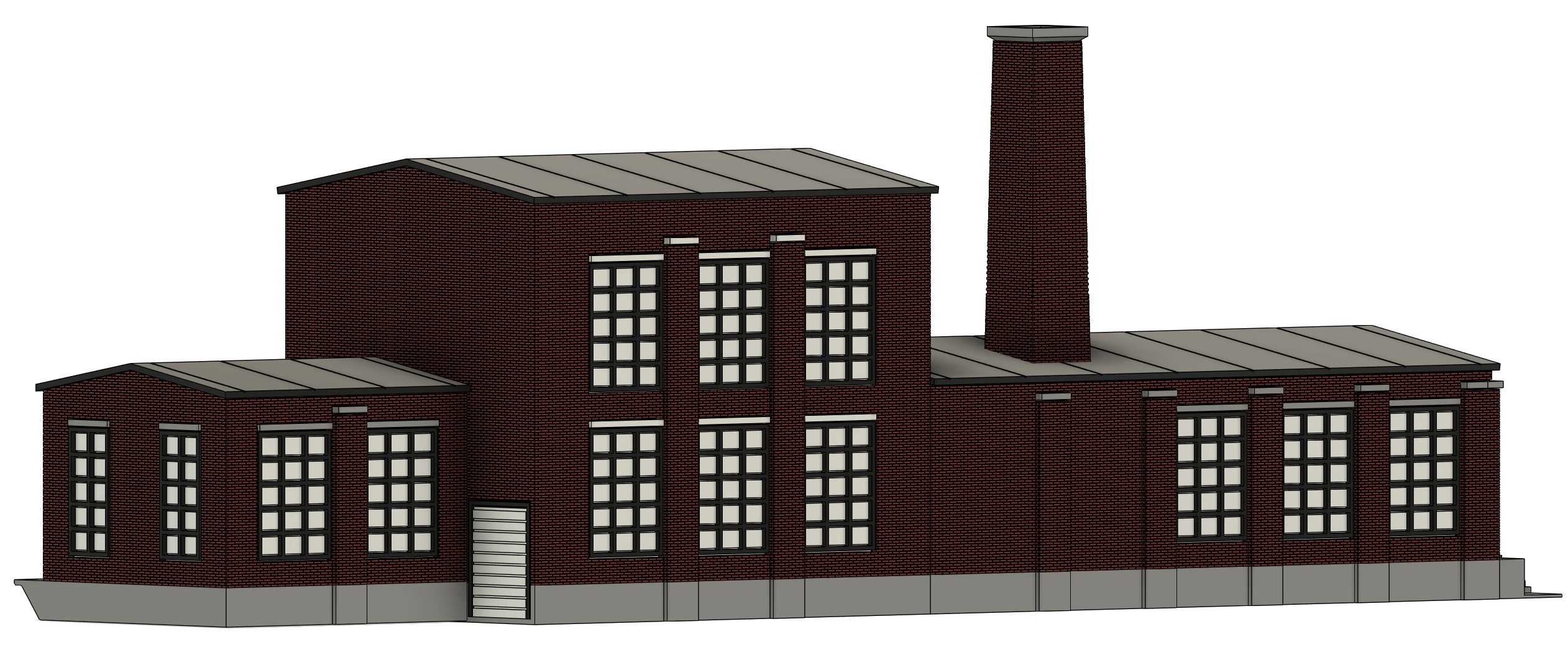 Cái tòa nhà công nghiệp bên đường ray bằng gạch này được thiết kế để khớp đại khái với cửa của những toa xe hộp dài 50 feet, cho hai cửa bên đường ray của nó. Các viên gạch có kích thước gần với tỷ lệ nhất có thể in được (~15% lớn hơn so với gạch thật). Cấu trúc này không có thật ngoài đời mà được mô hình hóa để trông giống về mặt hình ảnh với nhiều loại cấu trúc gạch khác nhau. Khi phóng to, các phần có chiều rộng đầy đủ sẽ có chiều rộng khoảng ~40 feet (bên trong); với phần có chiều rộng từng phần là ~26 feet (bên trong). Phần 2 tầng có gạch ở cả bốn mặt và có thể được sử dụng như một cấu trúc độc lập hoặc kết hợp với các phần sắp xếp khác.