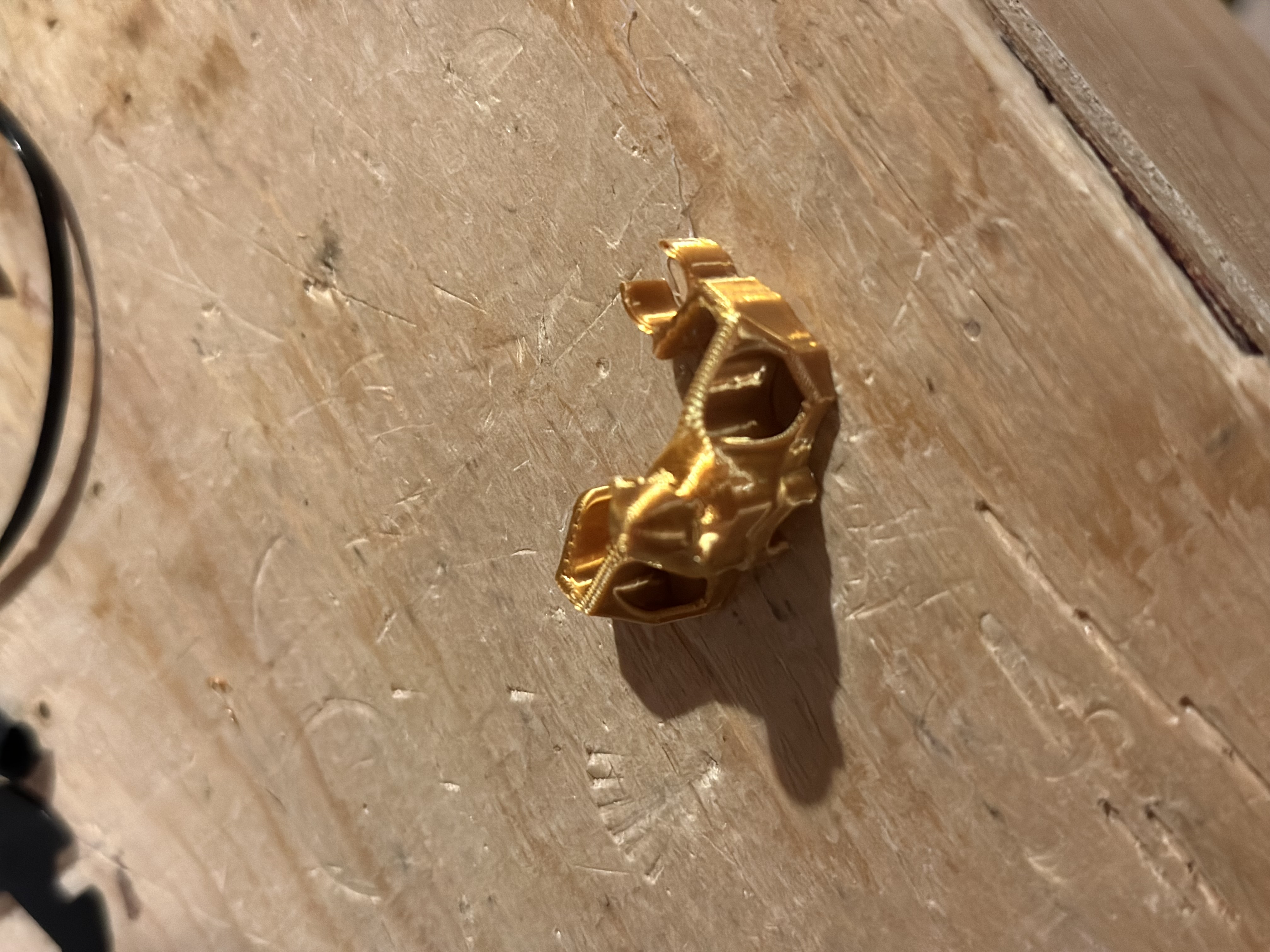 Mọi thứ trong dự án này đều có thể in được mà không cần support ngoại trừ bộ phận chân đế cáp giường máy in. Bộ phận này nên được in, như trong hình dưới đây, với một support nhỏ được vẽ lên cho khớp nối hình cầu.
