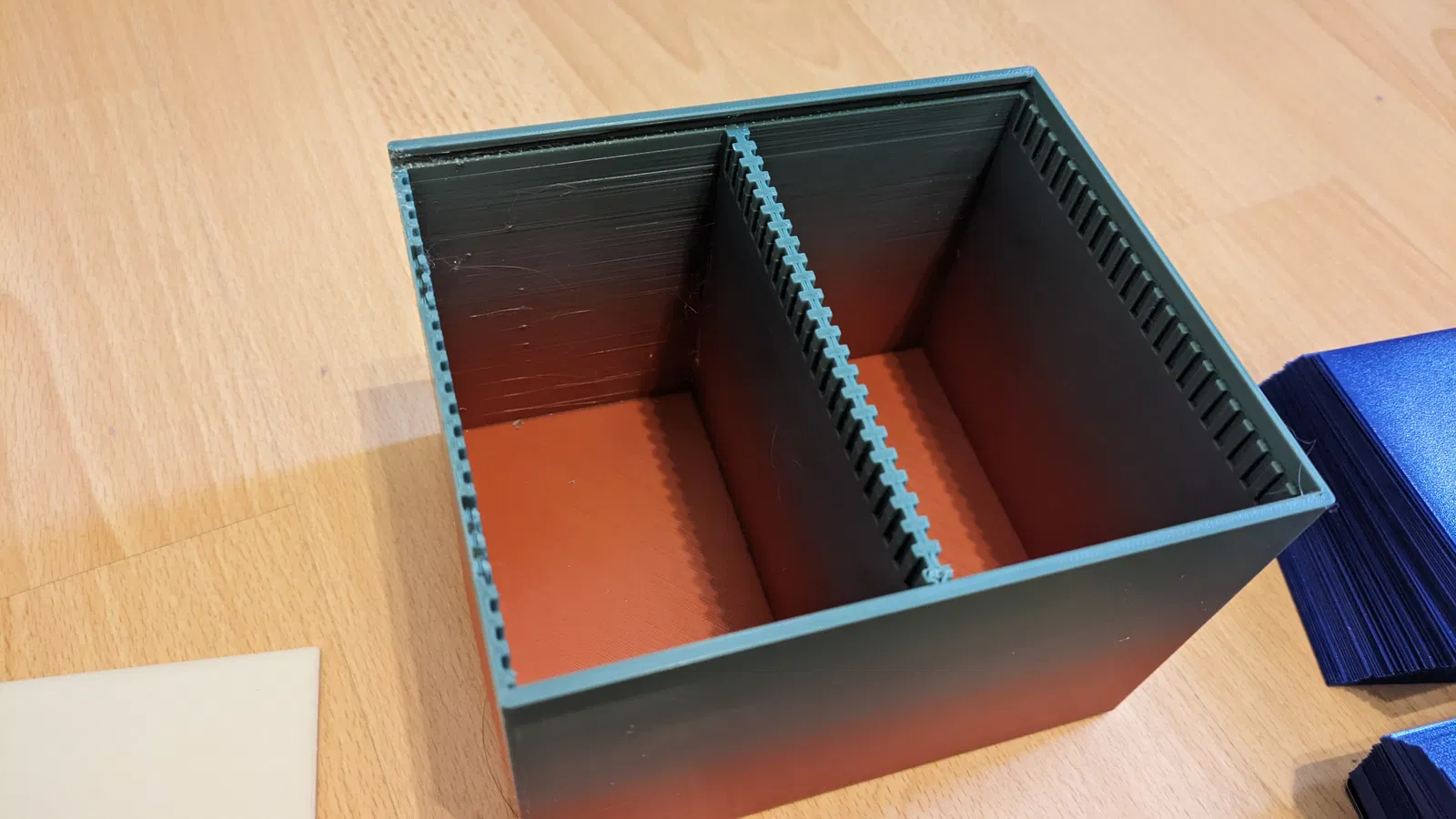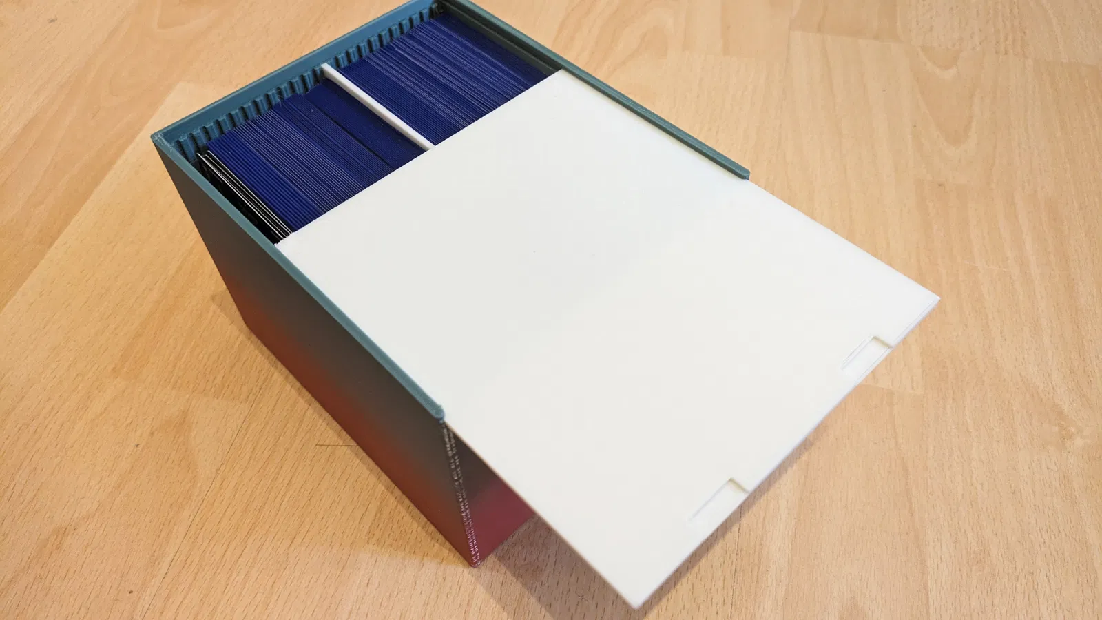 Hộp đựng bài này có thể chứa khoảng 400 lá bài có bao bọc, với cơ chế đóng mở trượt đơn giản, chắc chắn, không bị bung khi để trong túi.