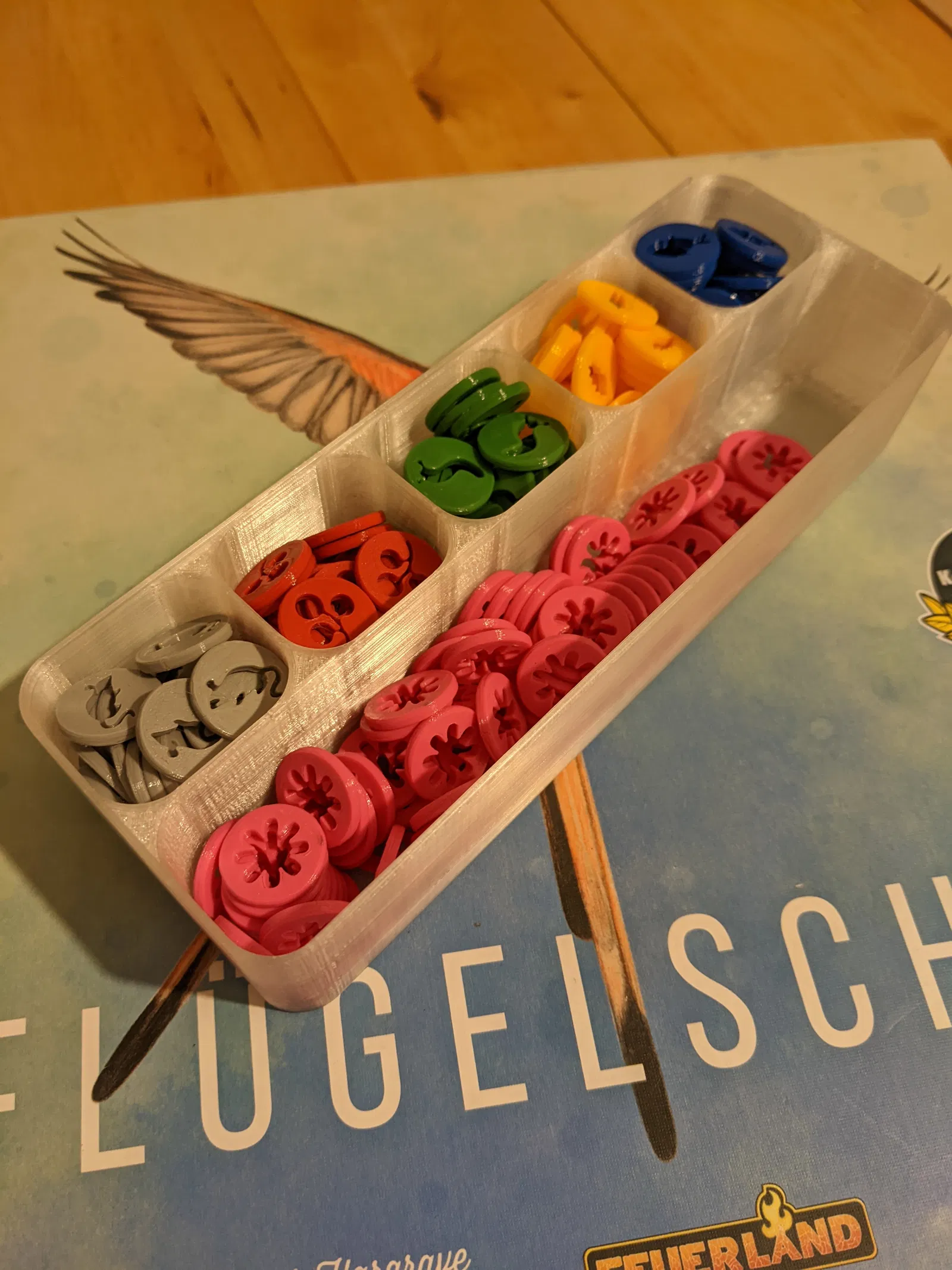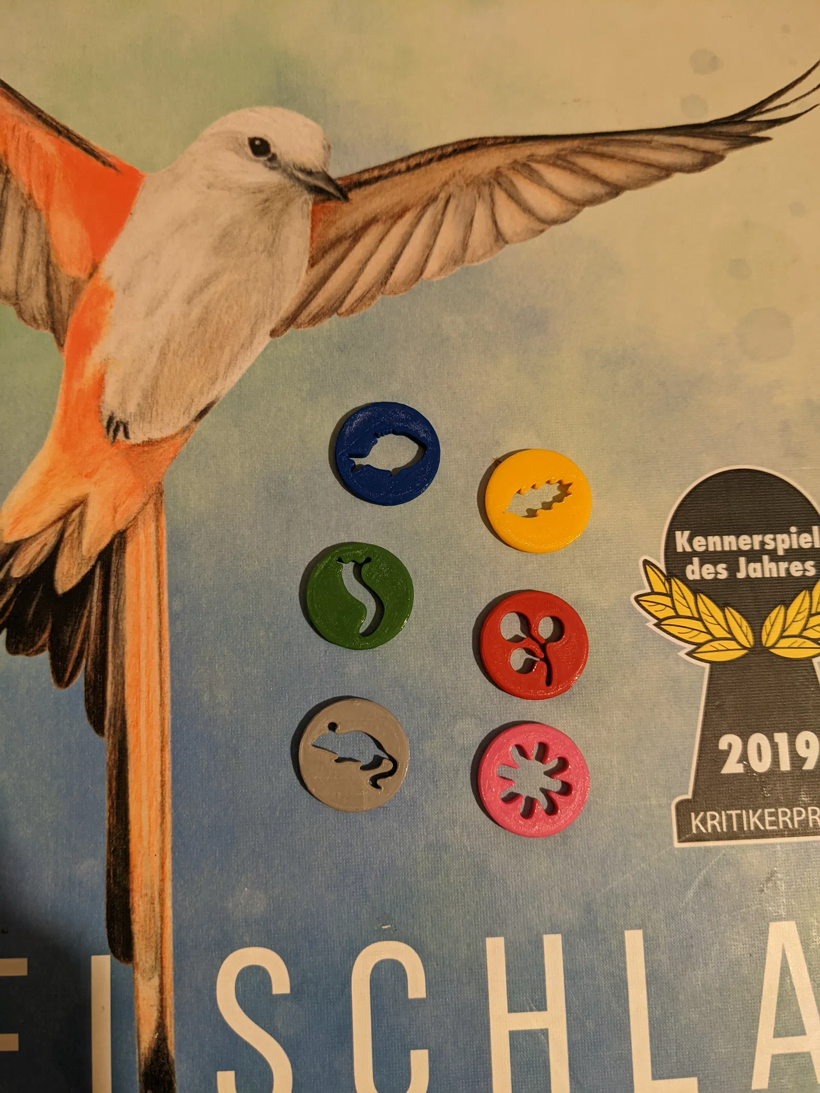 Để thay thế các token trong game Wingspan, bạn cần in 29 token tài nguyên cơ bản (tôi làm 30 để cho tròn số) và 70 token mật hoa. Nếu có thể, bạn nên dùng các màu filament khác nhau. Theo tôi, việc sơn chúng không khả thi lắm vì kích thước nhỏ và khó để sơn bám dính tốt khi bạn cầm nắm chúng trong lúc chơi.