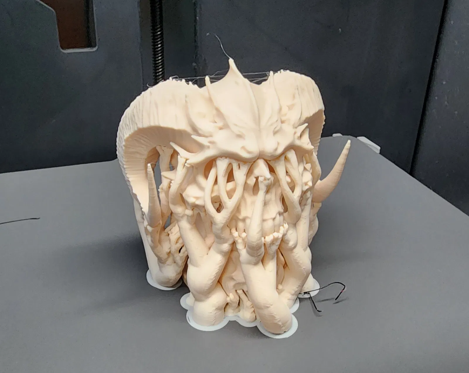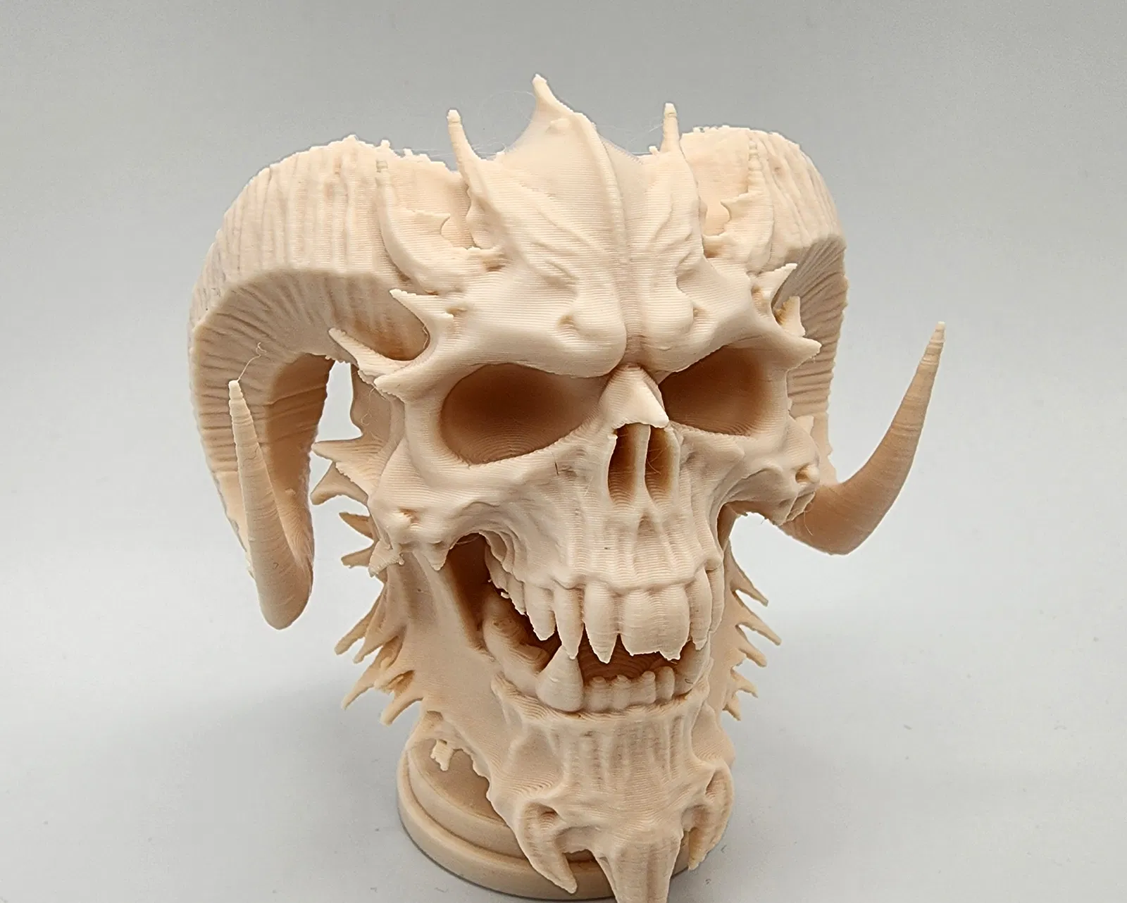 Mô hình đầu lâu quỷ có sừng độc đáo, đặt trên bệ đỡ đơn giản. Phù hợp làm đồ trang trí Halloween, trưng bày hoặc bổ sung vào bộ sưu tập. Mô hình được tạo ra từ công nghệ image-to-3D của MakerWorld, đảm bảo chi tiết sắc nét.