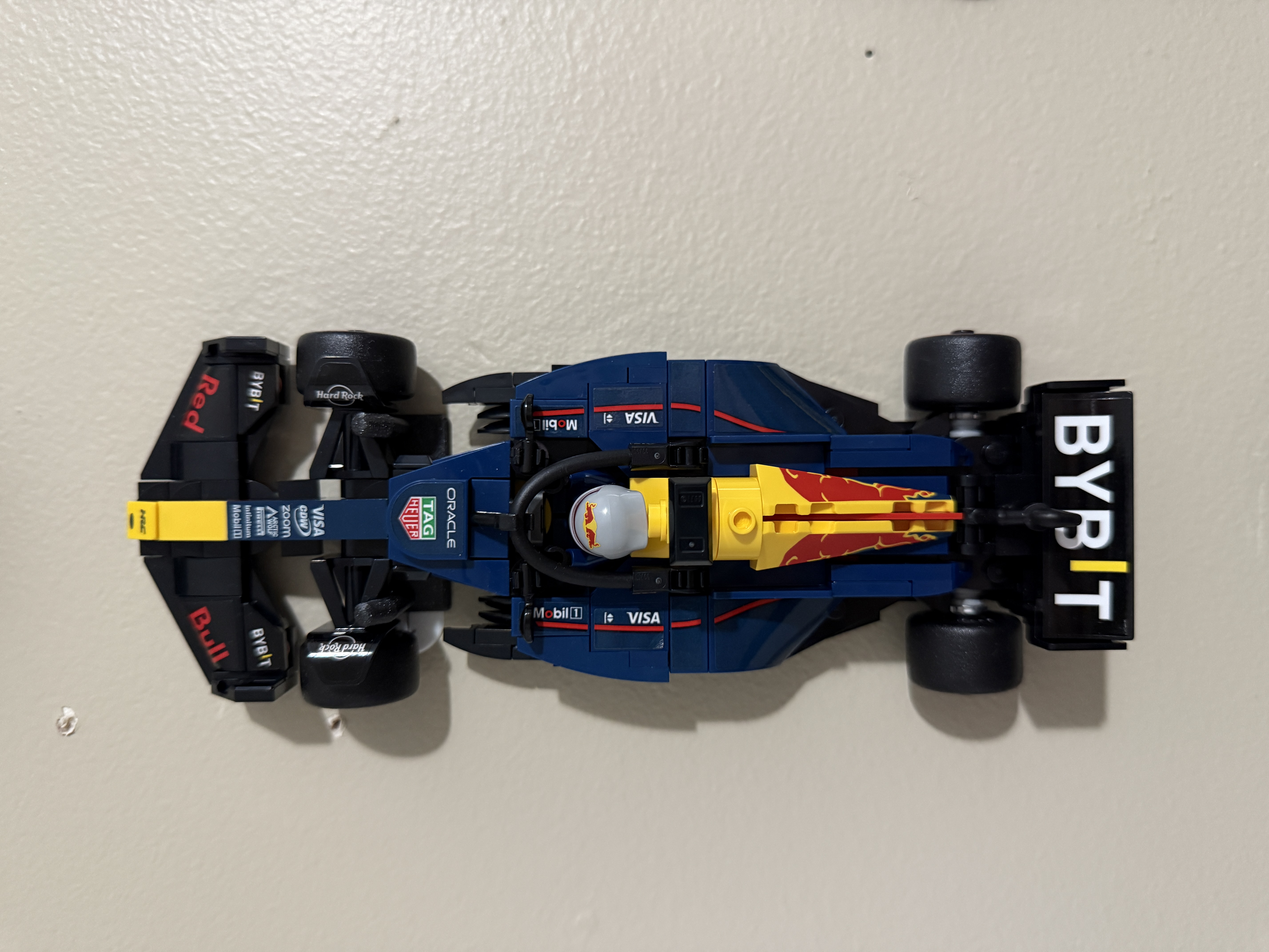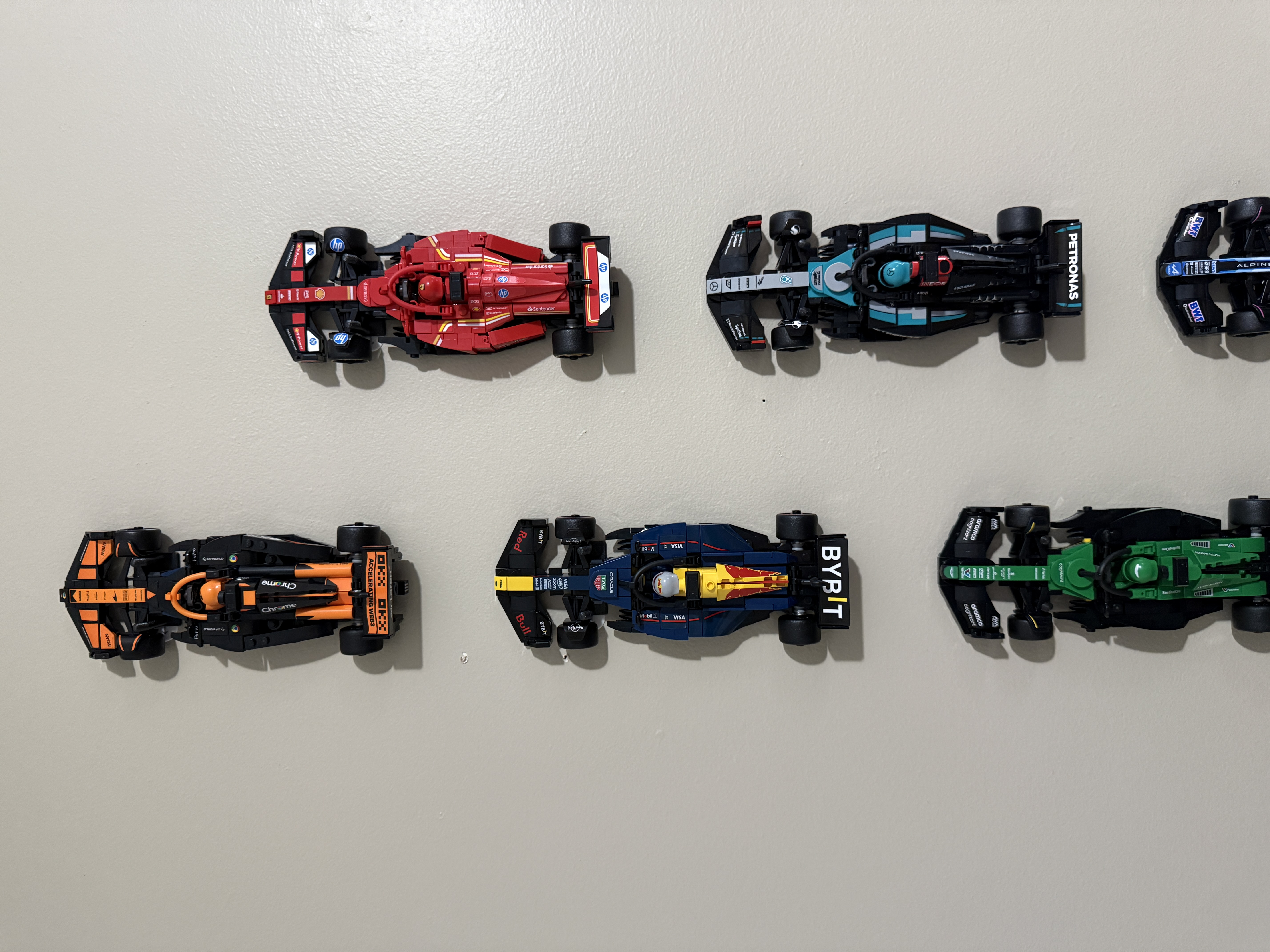 Cái này sẽ giúp bạn treo những chiếc xe F1 Lego của mình lên tường. Tui có treo mấy chiếc theo thứ tự xếp hạng của các đội đua. Nó được làm để dùng với miếng dán Command nhỏ, và cái đế cùng miếng dán thường sẽ bị xe che khuất nên trông như tàng hình vậy.