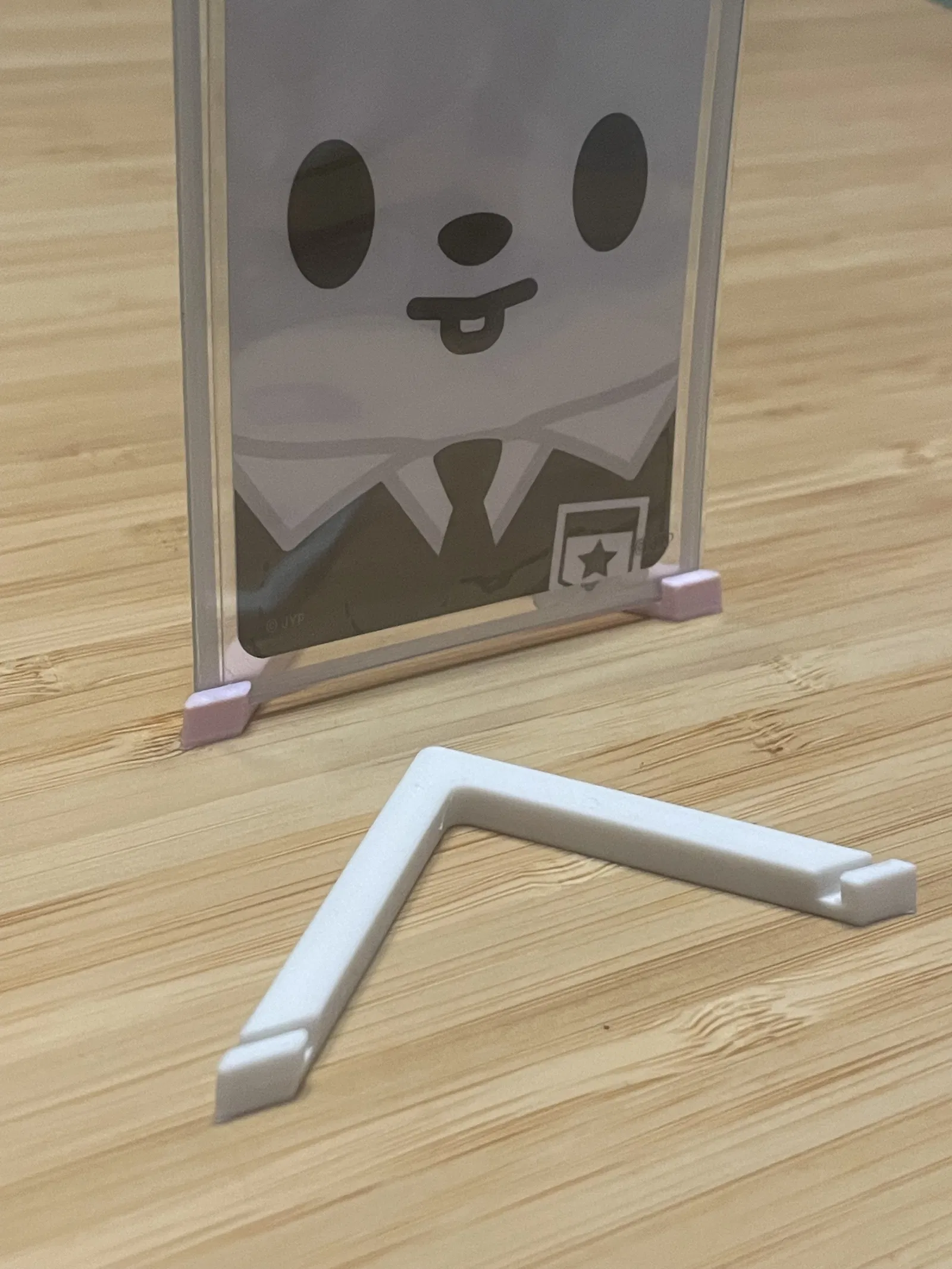 Thiết kế để giữ một cái toploader đựng thẻ ảnh ở một góc hơi nghiêng và sử dụng rất ít nhựa in khi vẫn giữ được sự tinh tế. Cũng có thể dùng để trưng bày ảnh hoặc bưu thiếp khi phóng to lên một chút.