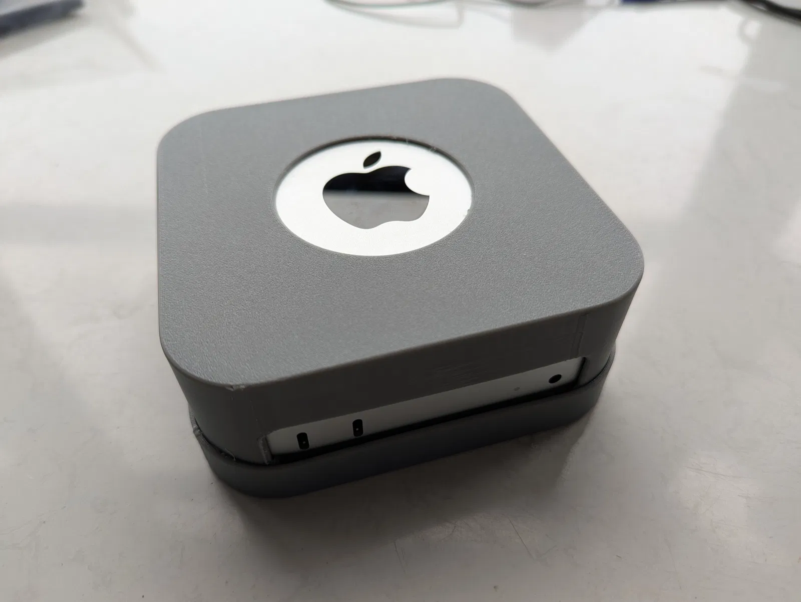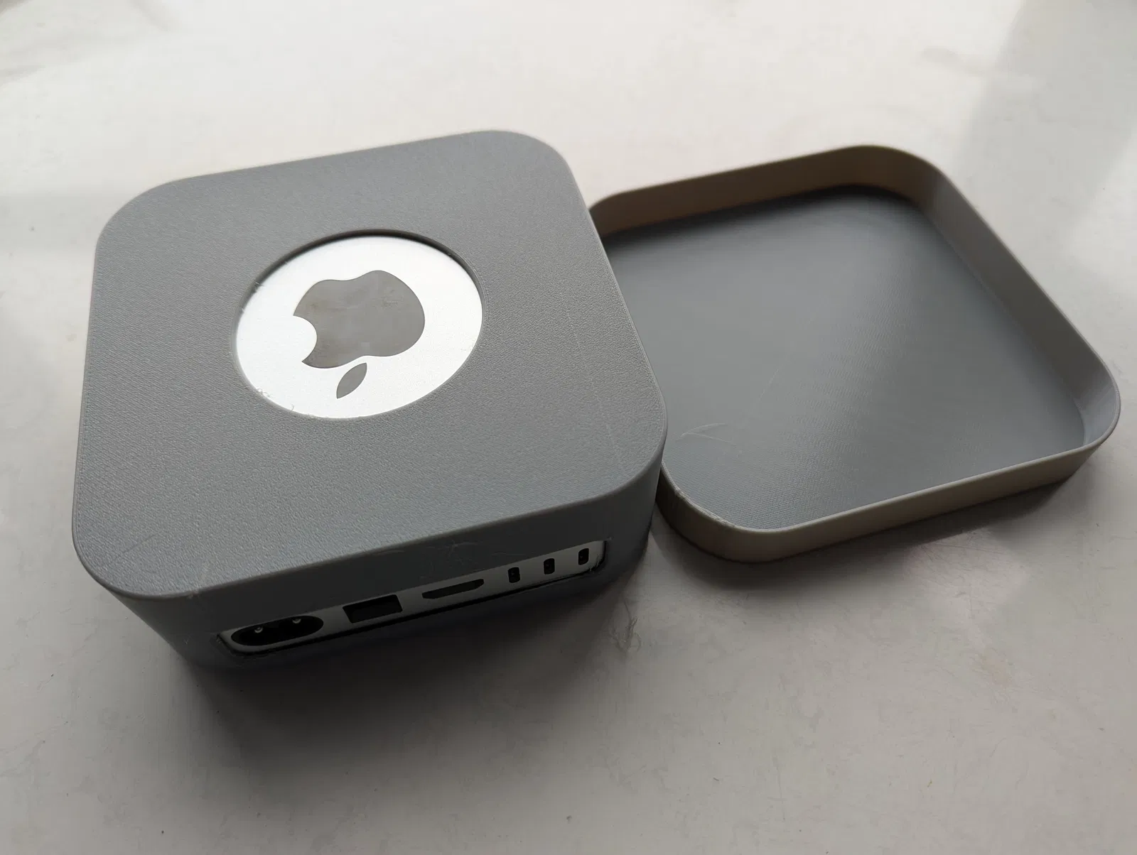 Vỏ bảo vệ cho Mac Mini M4 (2024). Chiếc vỏ này được thiết kế để bảo vệ Mac Mini khỏi các cạnh sắc và trầy xước dễ dàng. Có hai phần trên và dưới, cùng với phần mở lớn cho cáp và phần mở trên cho logo. Góc bo tròn đã được cập nhật và đã có bản in thử nghiệm bằng TPU Xám.