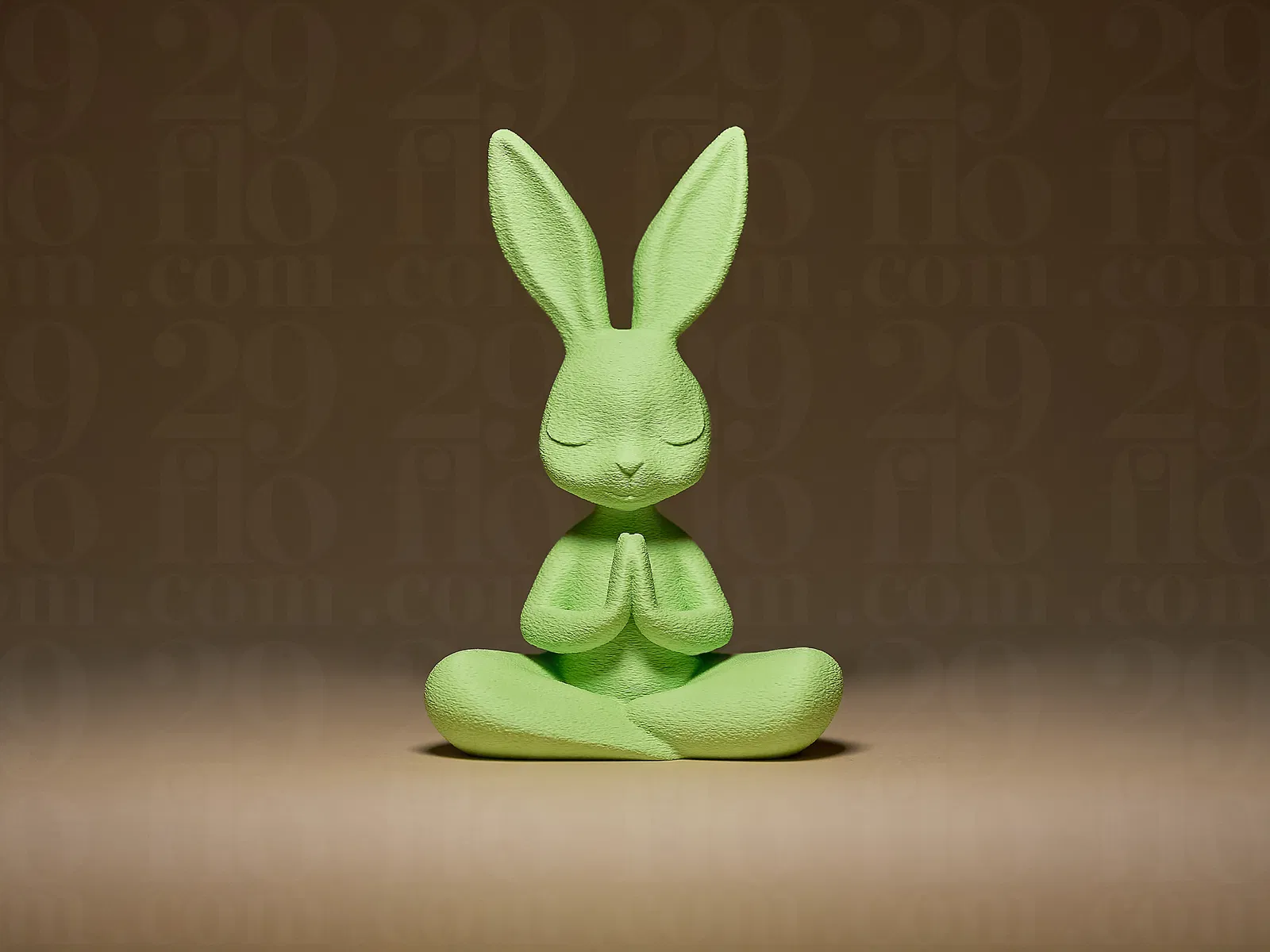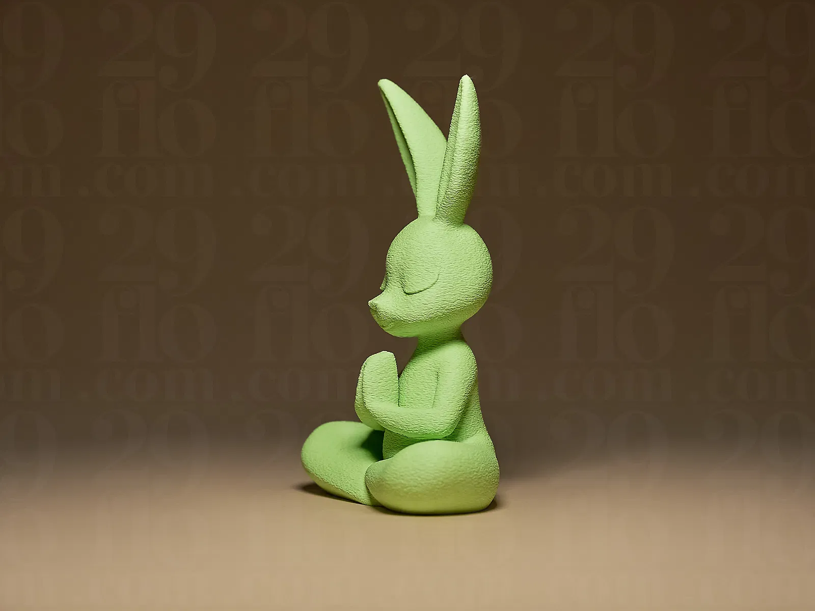 Mô hình tượng thỏ đang thiền định, được in với hiệu ứng Fuzzy Skin độc đáo. Lưu ý quan trọng về độ bám khay in và chất lượng filament để có bản in hoàn hảo. Hoàn hảo làm quà tặng hoặc trang trí.