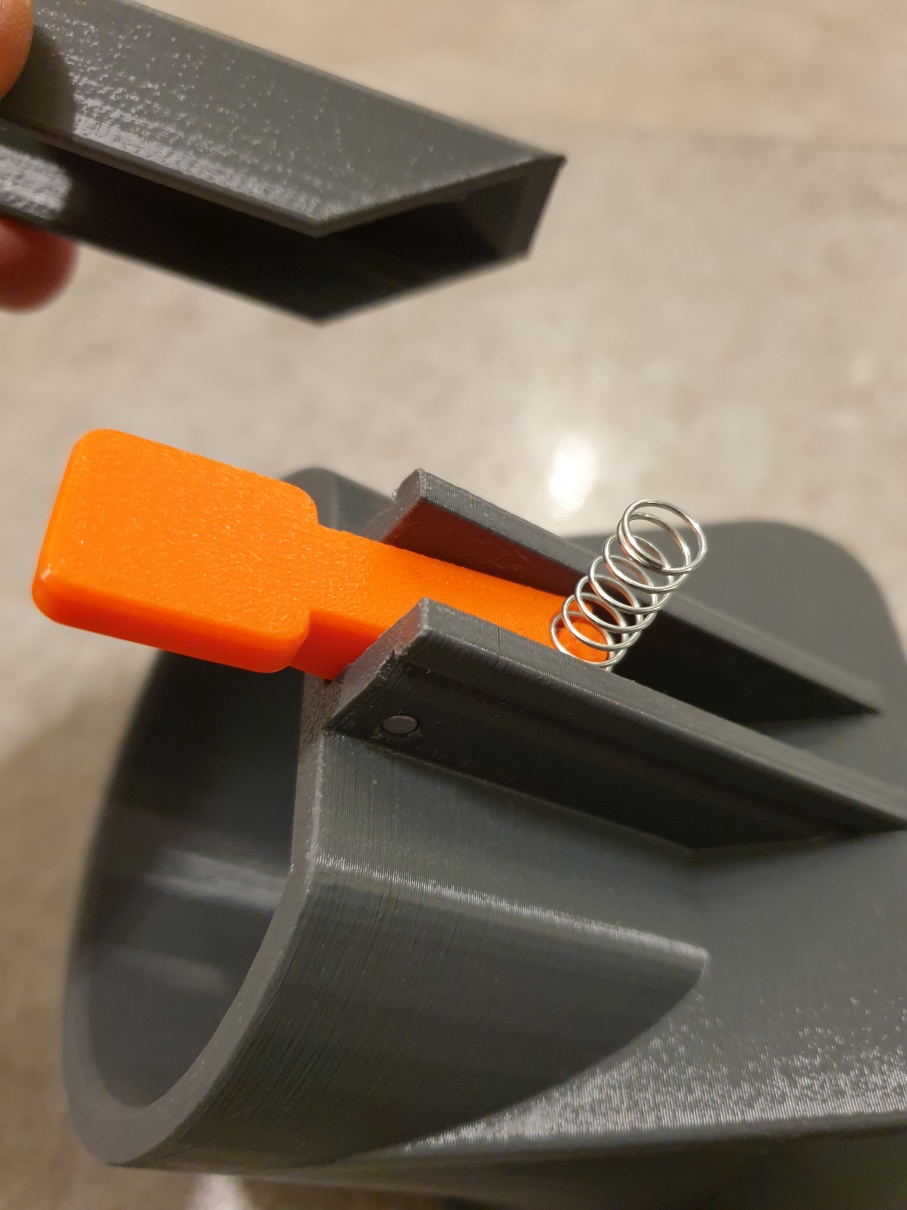 Thiết lập máy in Độ dày lớp: 0,2mm Chân đế (Supports): không Ruột (Infill): 20% Lớp vỏ (Perimeters): 3 Raft: không Cân nặng: khoảng 5 gram Thời gian in: khoảng 30 phút (Prusa MK3) ### Trục Bạn cần một thanh kim loại đường kính ø3 mm. Dài 18 mm. Bất cứ thứ gì như dây thép hoặc đinh đều có thể dùng được, thanh ren cũng vậy. Khoan lại lỗ trên cần gạt để đảm bảo nó di chuyển dễ dàng trên trục. ### Lò xo Tôi có một bộ lò xo sẵn có mà tôi đã sử dụng: dài 20 mm; đường kính ngoài ø7,2 mm; độ dày dây 0,6 mm Miễn là nó dài từ 15 đến 20 mm thì sẽ hoạt động. Bạn có thể phải sửa đổi lỗ trên đỉnh cần gạt để phù hợp với lò xo của mình. Mặc dù tôi chưa thử nghiệm, nhưng tôi nghĩ một chiếc lò xo từ bút bi tiêu chuẩn có thể dùng được.