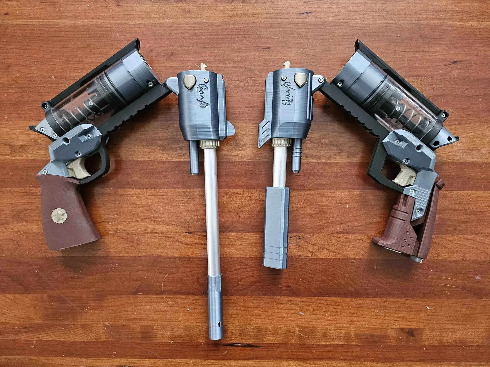 Vaguely inspired by the Colt Buntline, the Earp takes the mechanism of the nerf homemade Samson and uses its genuinely impressive 64cm³ plunger volume to push darts through an up to 10 inch barrel, using a very satisfying break action for reloading.