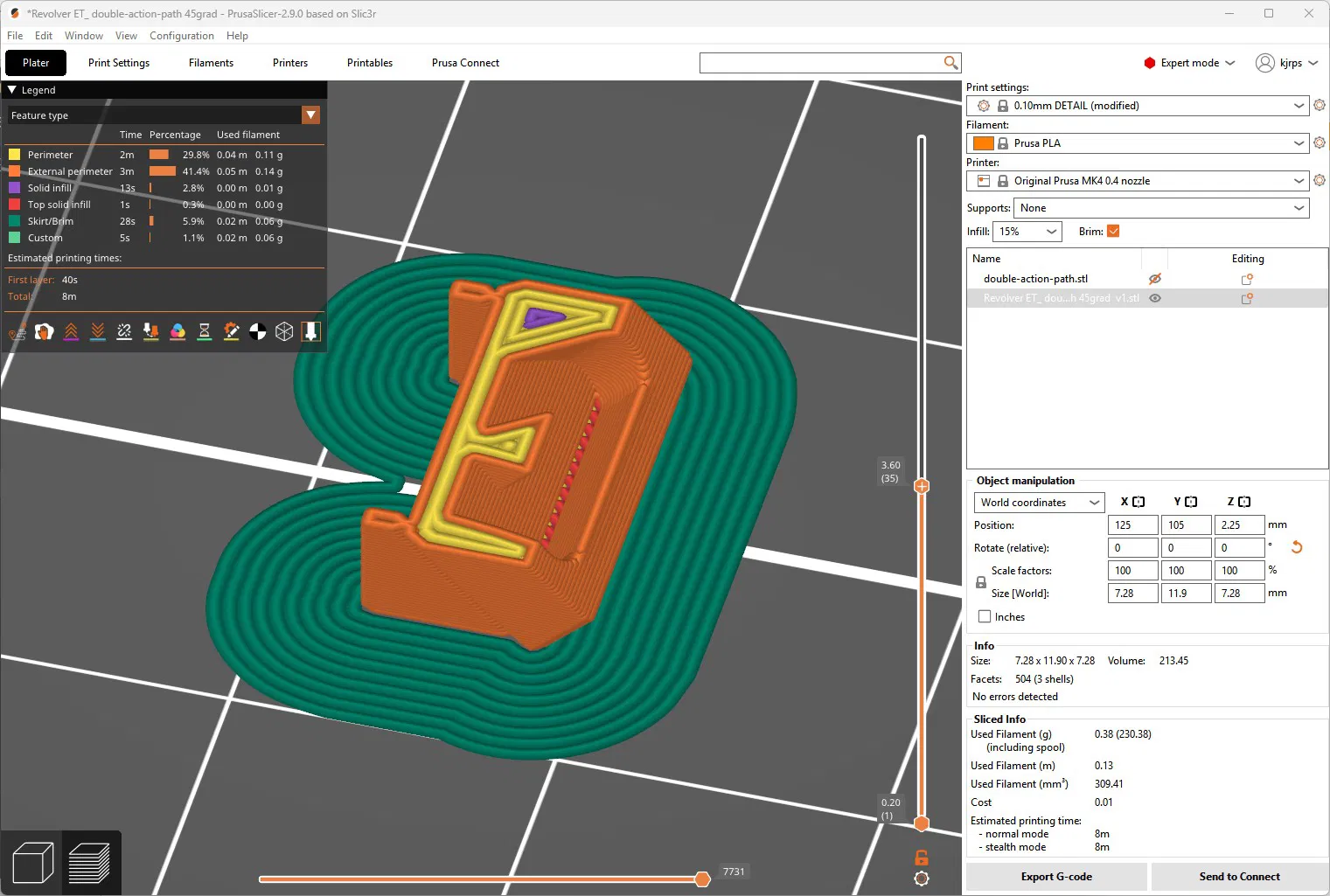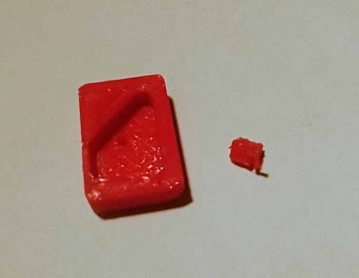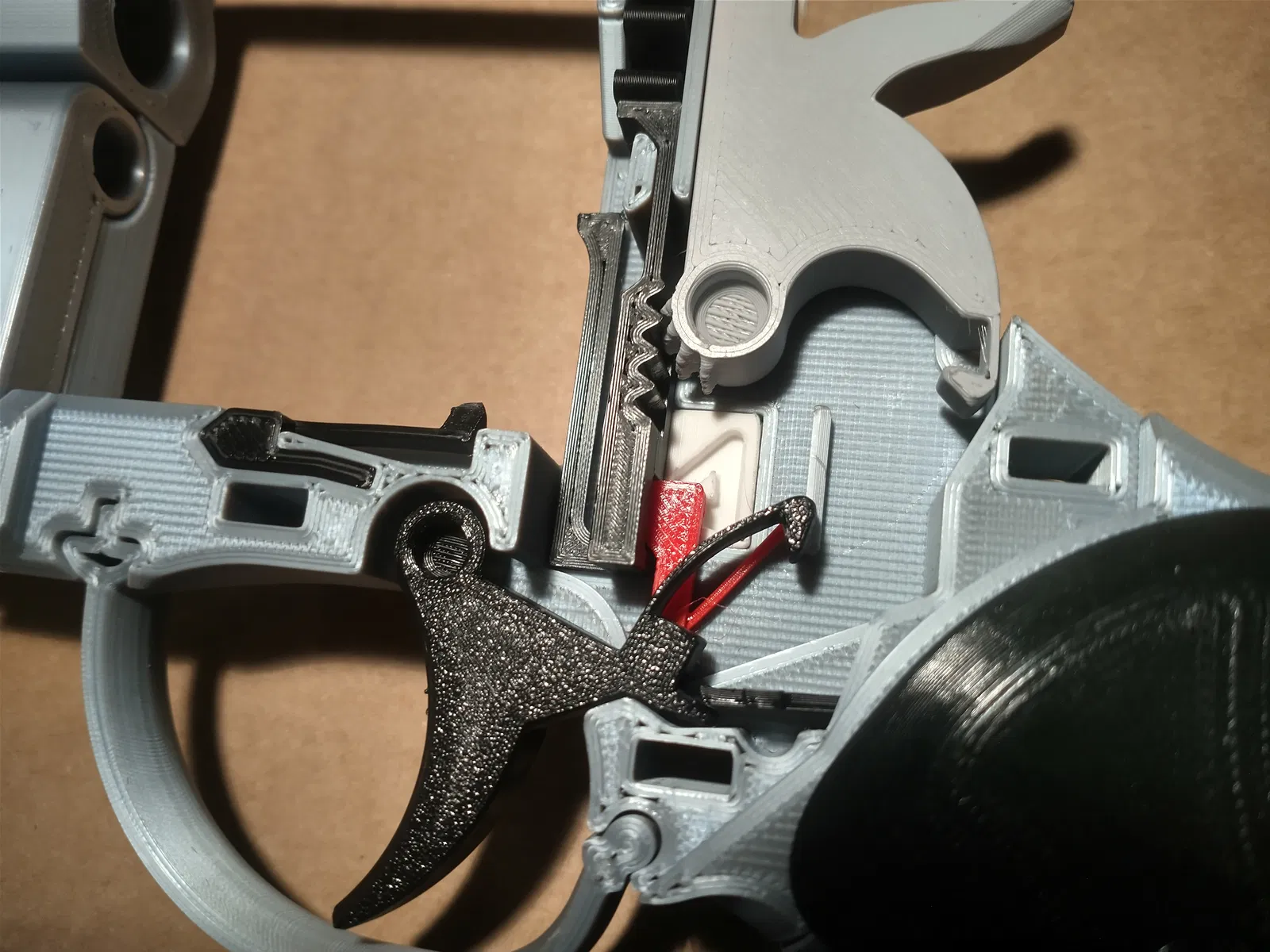 Cái núm nhỏ trên "double-action-path" bị gãy ba lần. Tui đã thử in nó nghiêng 45 độ để lớp dính tốt hơn, tui có thêm mấy cái support, mà mấy bồ phải gỡ ra sau khi in.