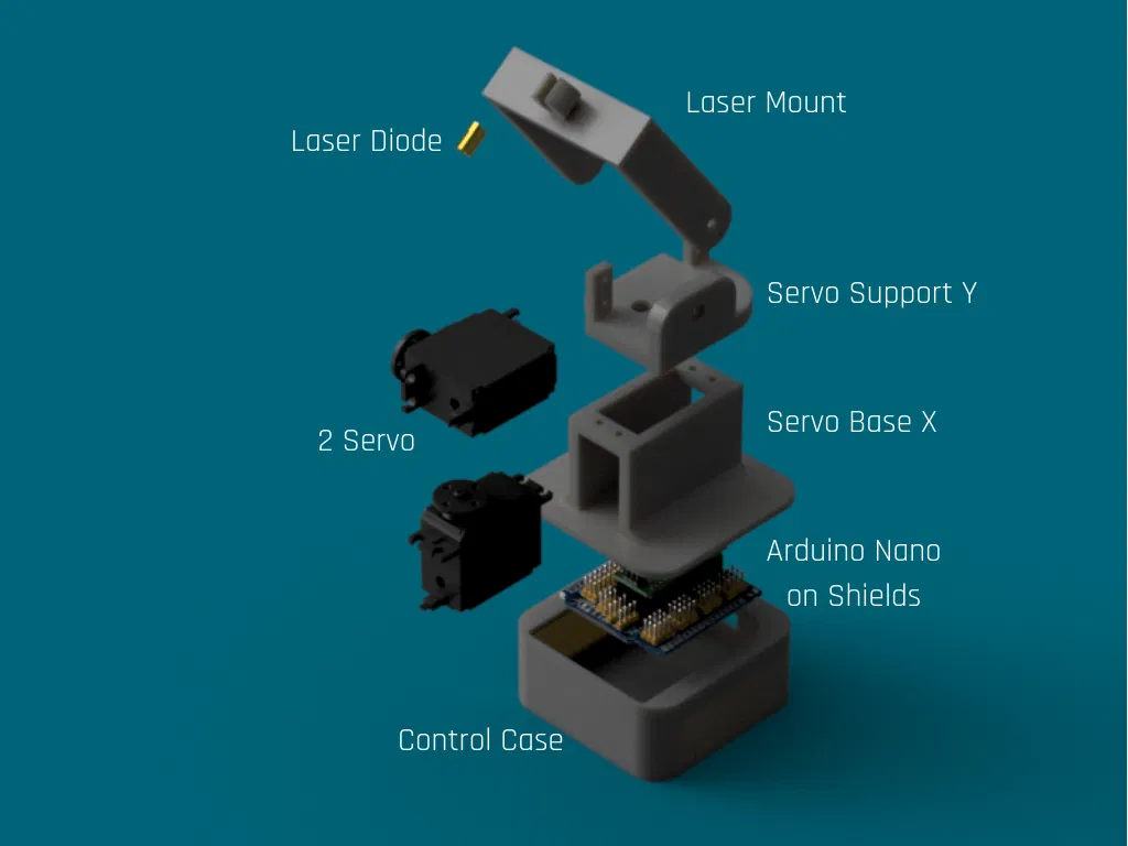 Cốt lõi của dự án này là Arduino Nano, điều khiển hai động cơ servo để di chuyển tia laser trên hai trục, tạo ra các mẫu ngẫu nhiên giữ cho thú cưng hứng thú. Thuật toán có thể được tùy chỉnh trong mã để sửa đổi hành vi của tia laser, điều chỉnh tốc độ, góc di chuyển và quỹ đạo.