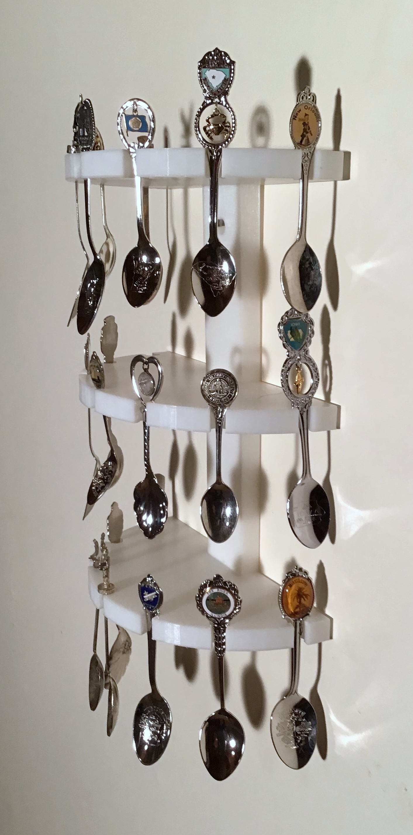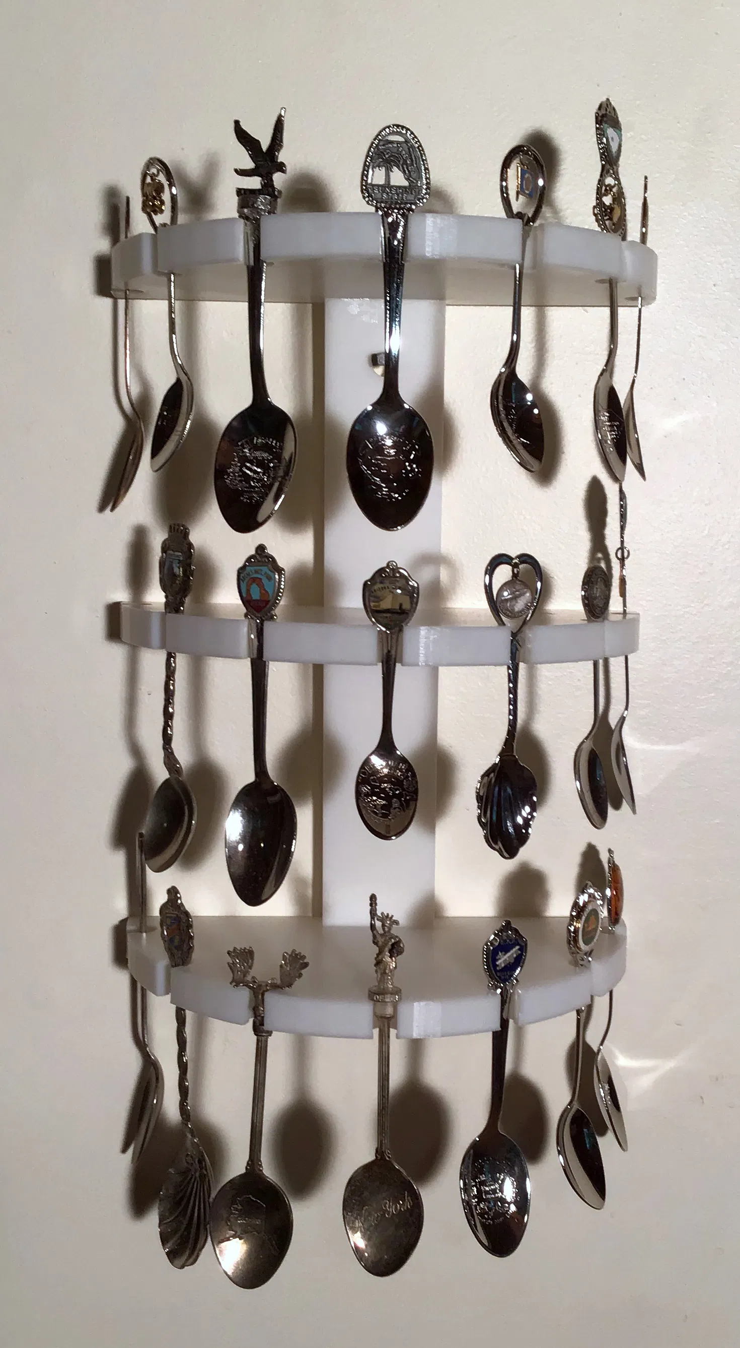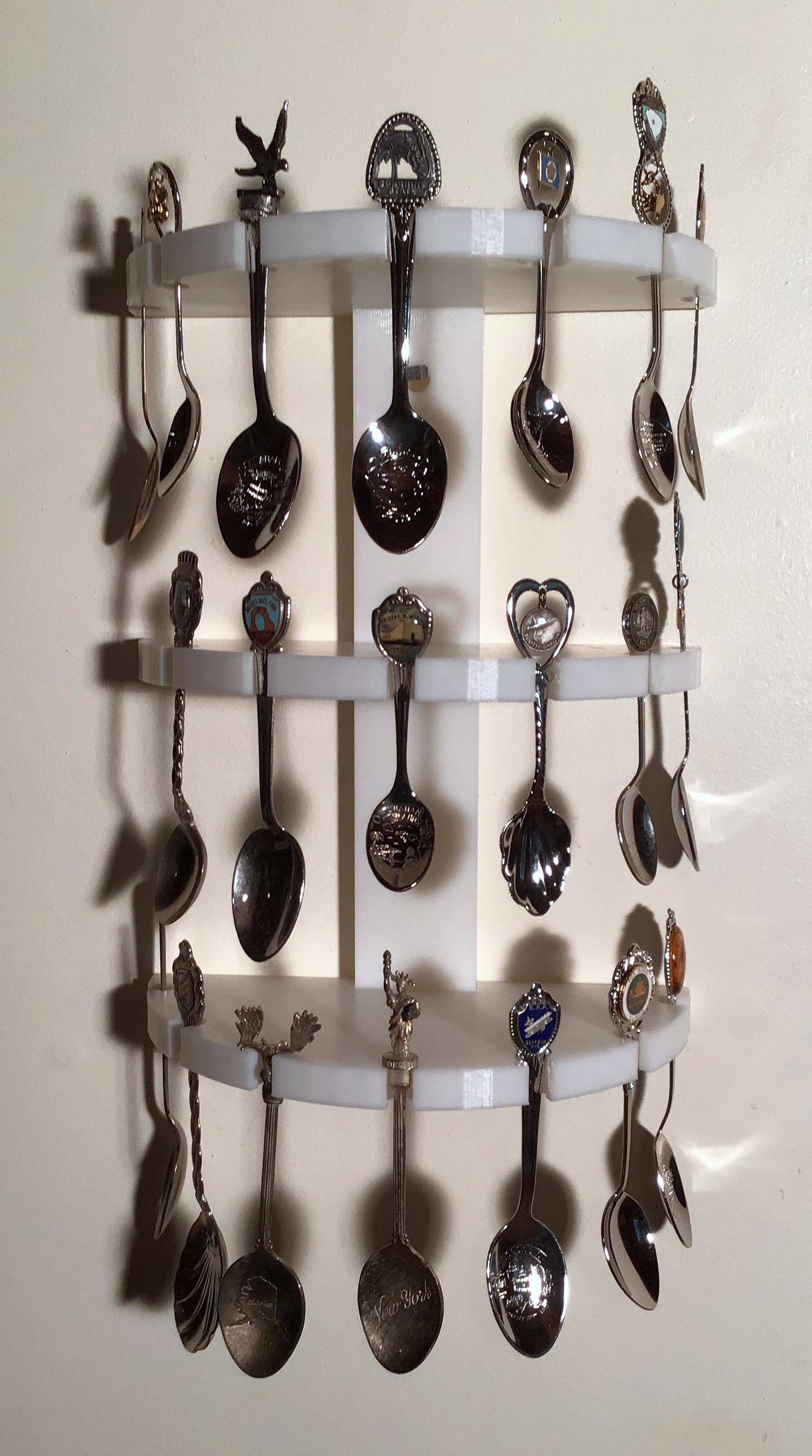 Trưng bày bộ sưu tập muỗng kỷ niệm của bạn với kệ treo tường này. Kệ có thể giữ 21 muỗng, làm bằng PLA, lắp ráp dễ dàng với ốc M3 và miếng đồng thau. In có vành giúp chống cong vênh hiệu quả.