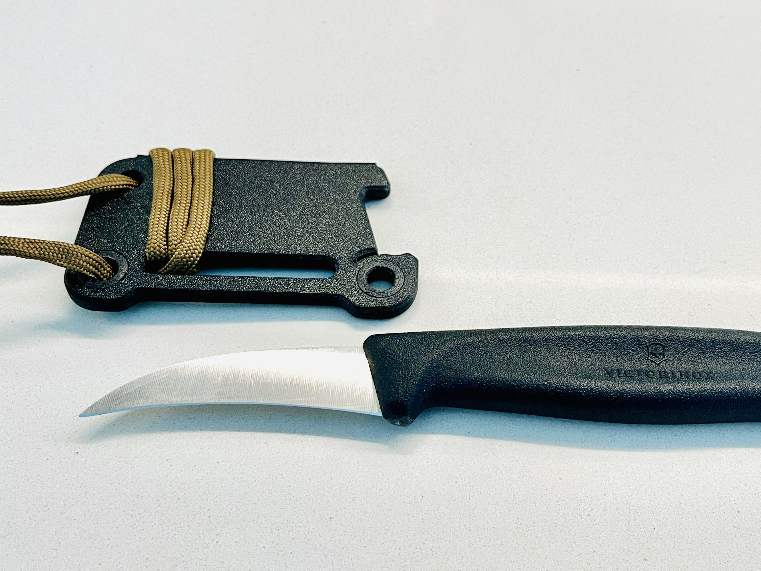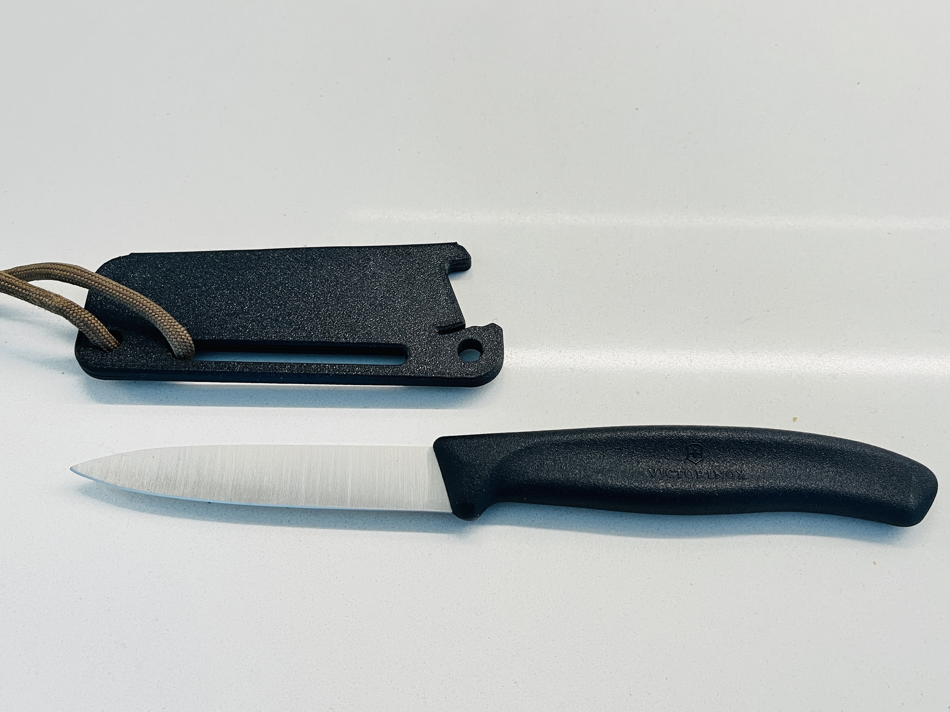 Tạo bao đựng dao gọt trái cây Victorinox bằng kỹ thuật "Fake Kydex" độc đáo. In phẳng rồi dùng nhiệt gấp lại, gắn bằng khuy bấm, cho sản phẩm chắc chắn, đẹp mắt. Có nhiều tùy chọn gắn và tính năng an toàn. Lý tưởng cho camper và người thích đồ dùng tiện lợi.