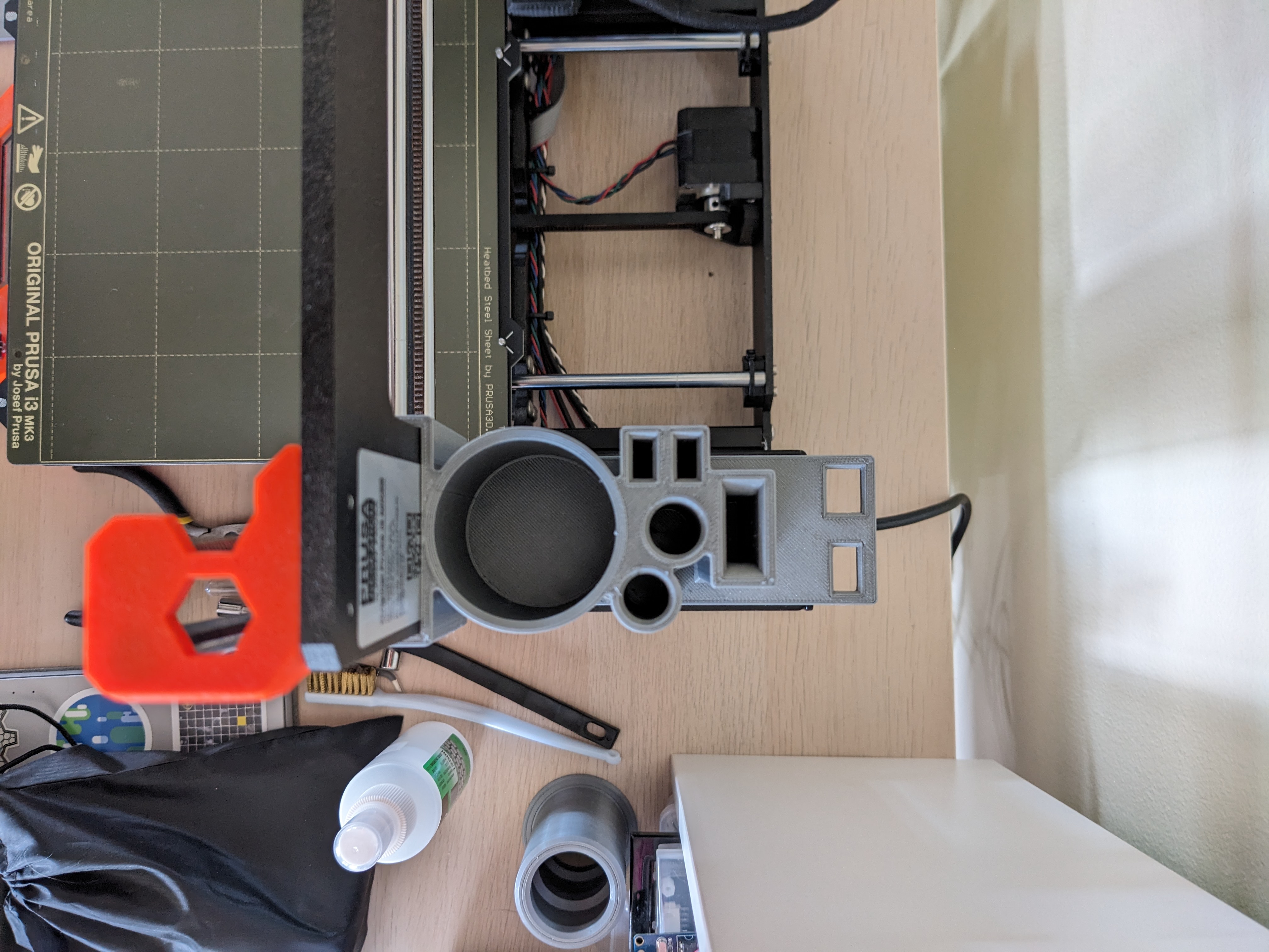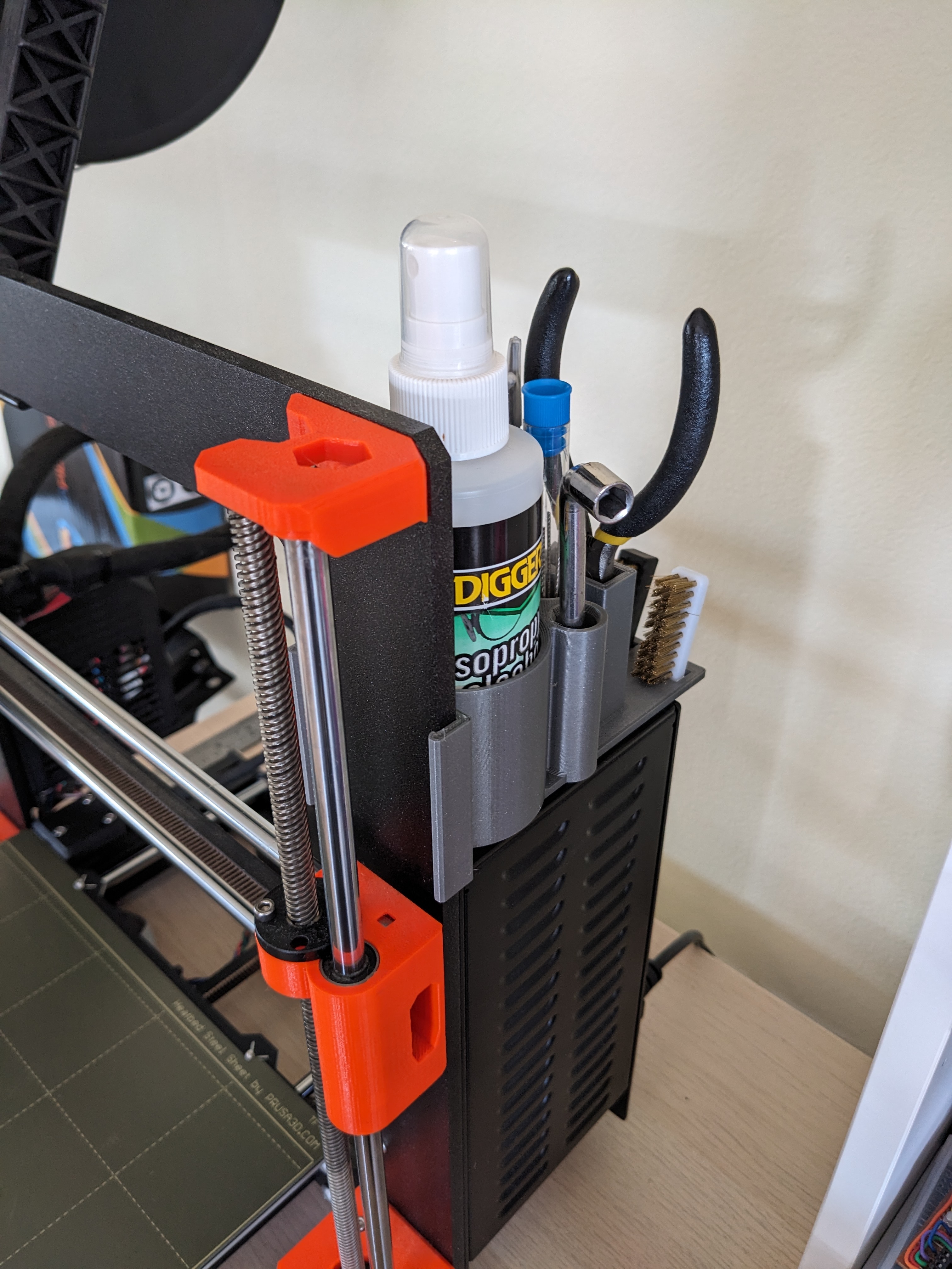 Chỗ cất giữ tiện lợi cho các dụng cụ máy in 3D của bạn, đặt gọn gàng trên bộ nguồn và gài vào khung máy Prusa i3 MK3S. Chứa đầy đủ các món đồ cần thiết như nhíp, kìm, cồn Isopropyl, dụng cụ vệ sinh đầu phun, v.v.