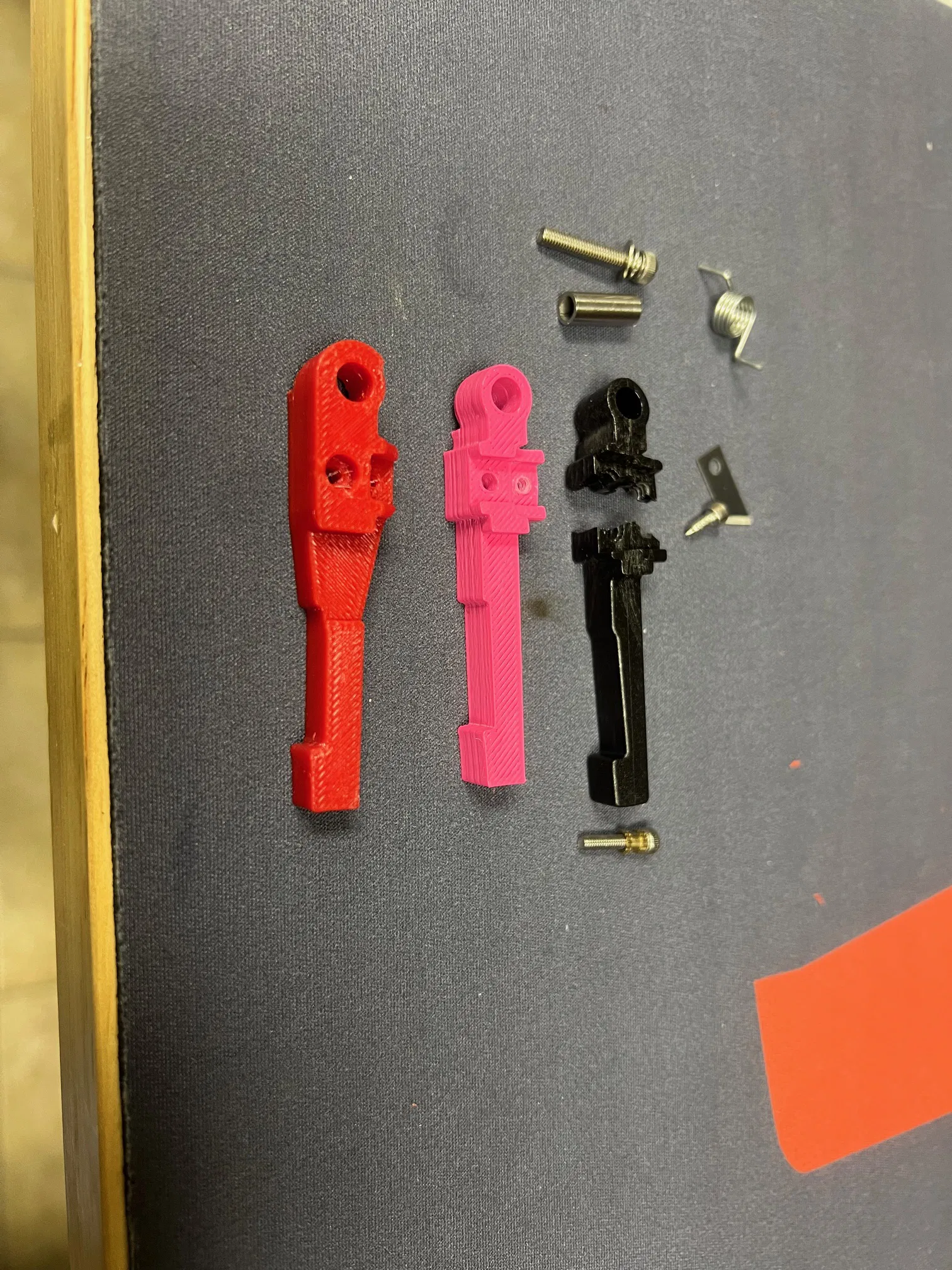 Tôi in bằng PLA (màu hồng) và PETG (màu đỏ). Cả hai đều có vẻ đủ chắc, nhưng cũng đủ yếu để gãy nếu có chuyện gì đó tệ xảy ra. Tôi đã dùng cả hai cho vài chục lần thay dây tóc và chúng vẫn ổn.