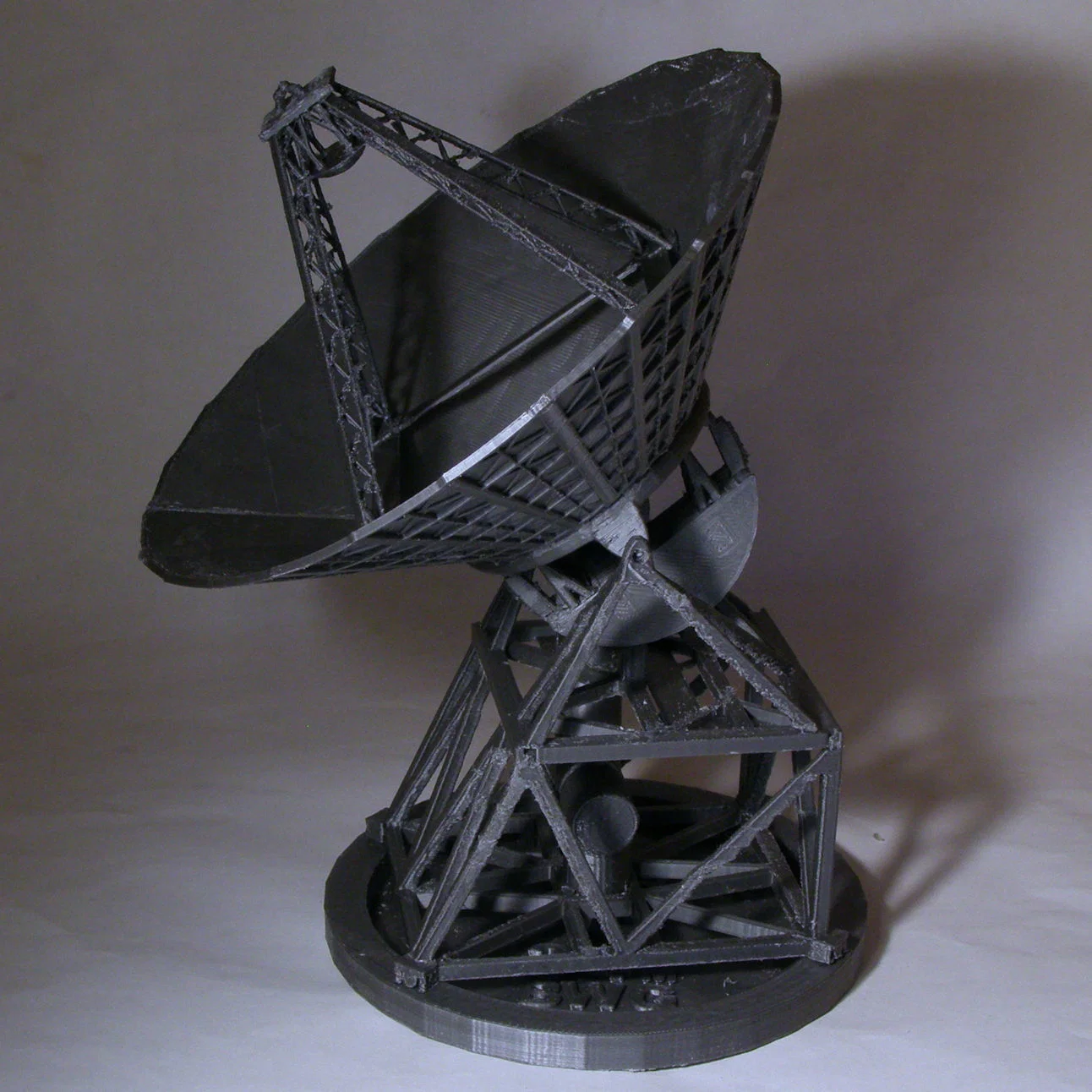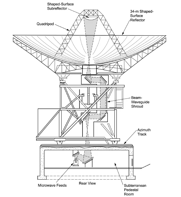 Mô hình ăng-ten dẫn sóng tia đường kính 34 mét này, một phần của Mạng lưới Không gian Sâu (DSN) của NASA, là cầu nối liên lạc với các tàu vũ trụ khám phá hệ mặt trời. Mô hình này tái hiện một phần quan trọng trong hệ thống liên lạc không gian của NASA.