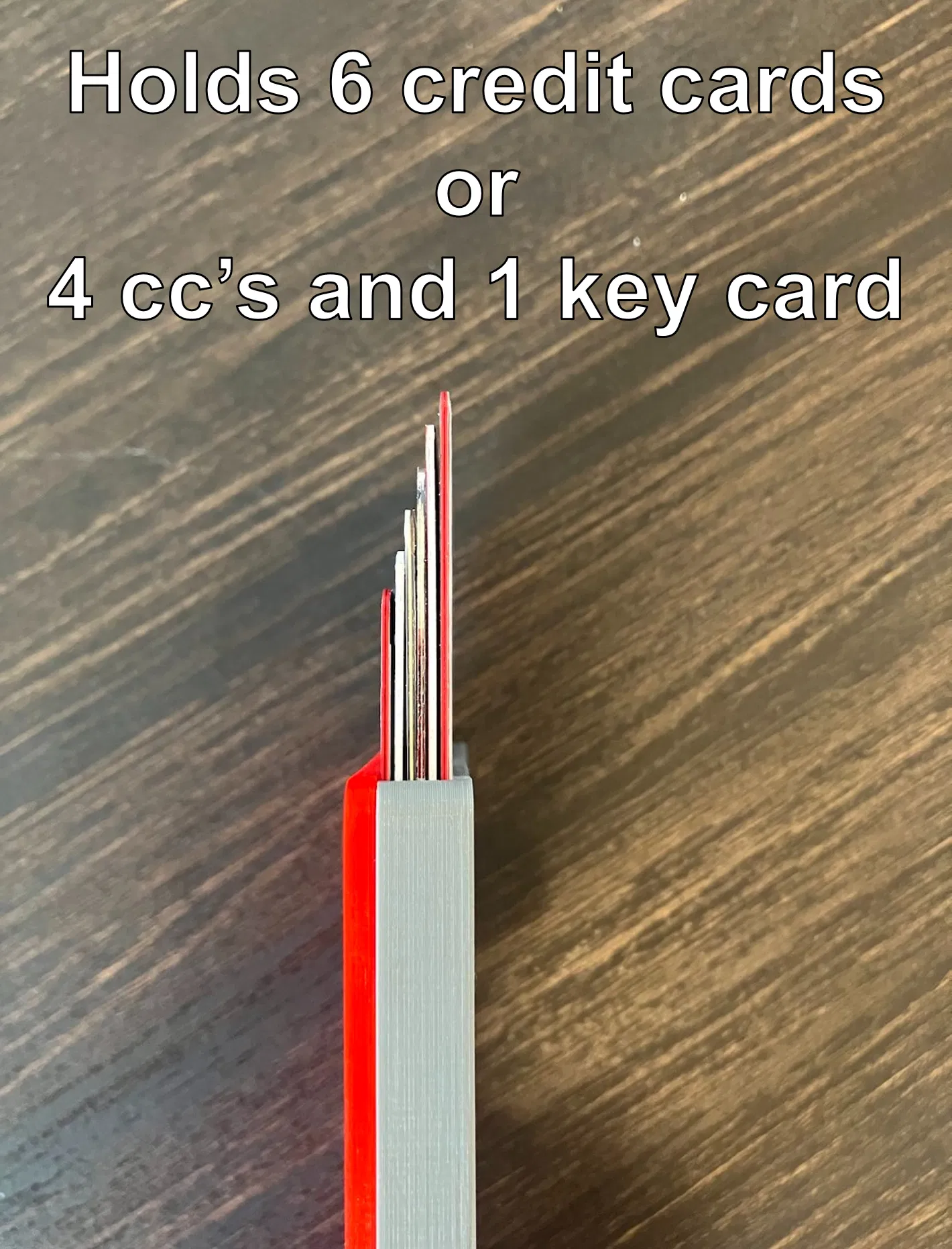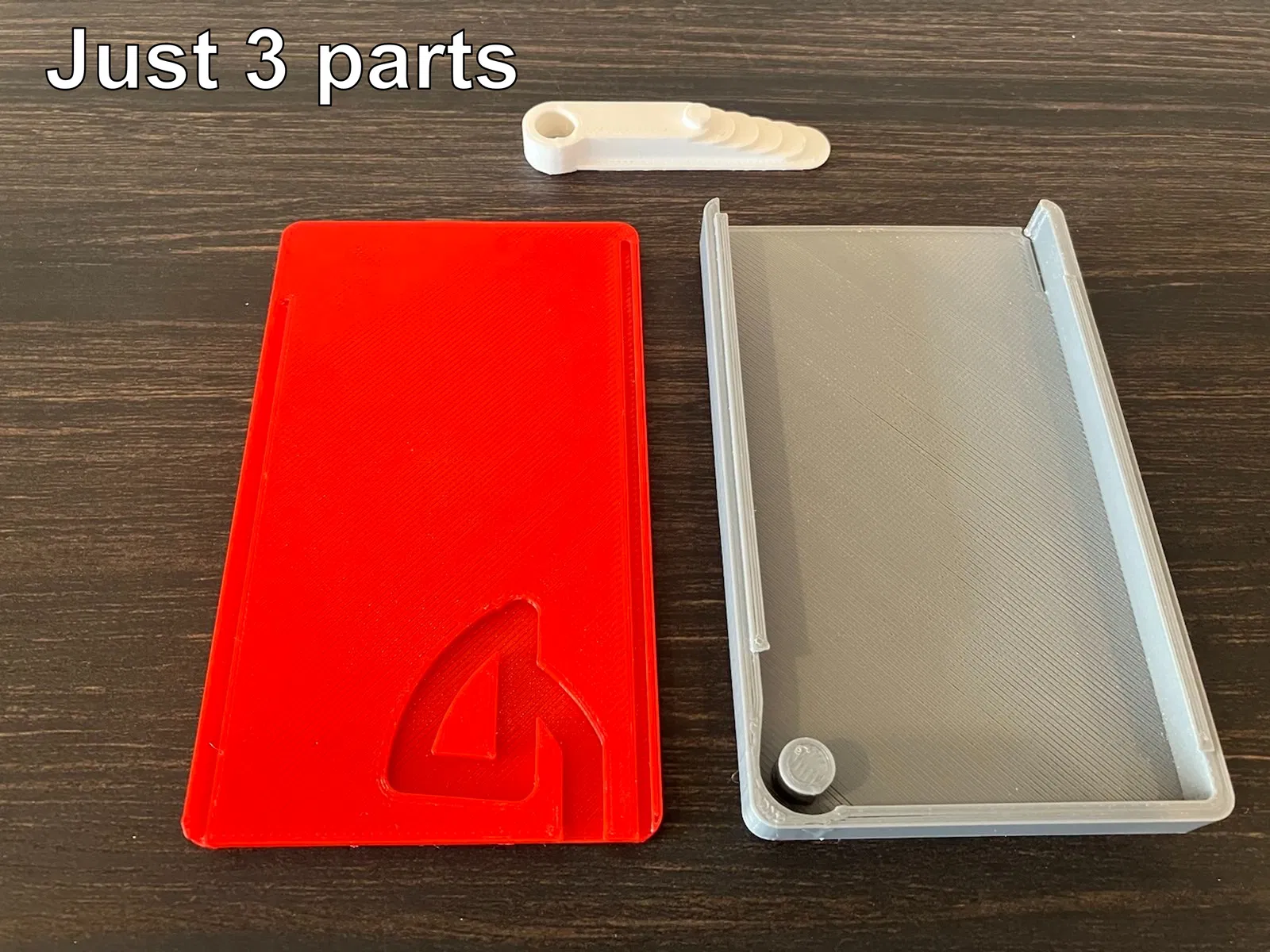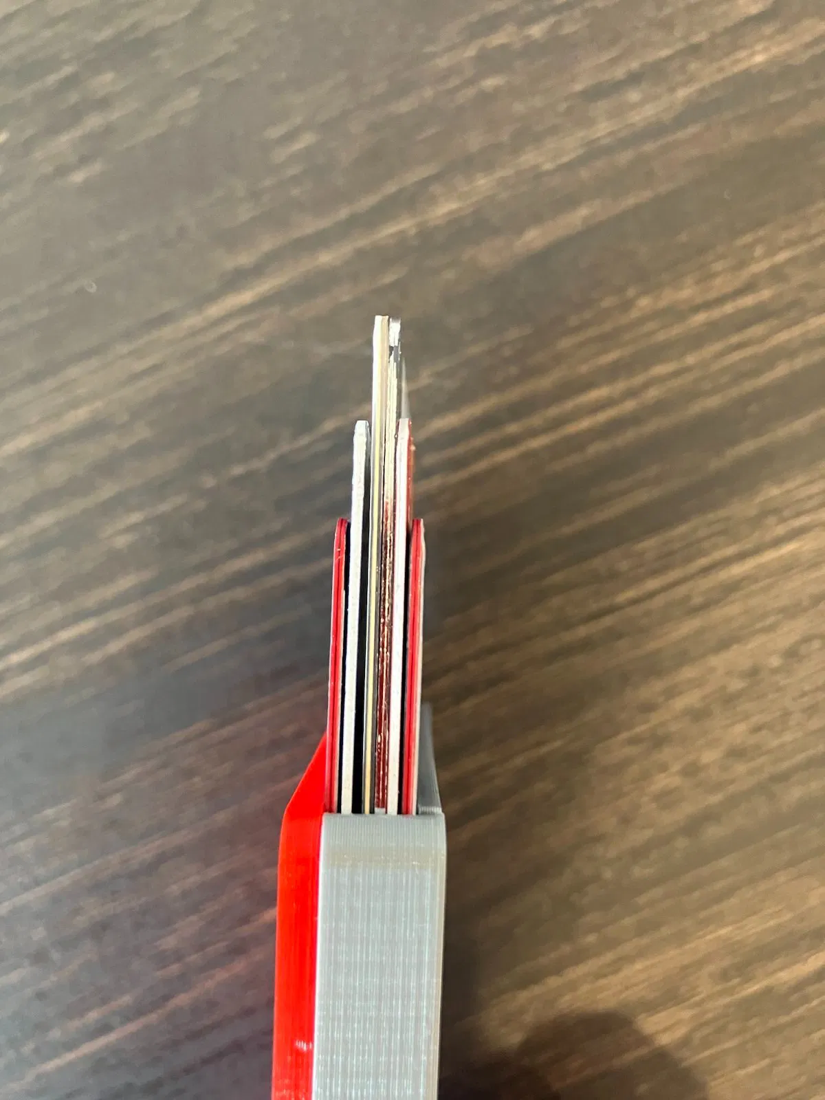 CẬP NHẬT: Tôi đã thêm một phiên bản mỏng hơn được thiết kế để chỉ đựng 4 thẻ - tổng độ dày khoảng 9.5 mm (phiên bản gốc dày khoảng 12 mm). Cũng đã rút ngắn một trong các rãnh trên đế để khớp với rãnh còn lại/tránh bị kẹt ở cuối. Phần đế và nắp của phiên bản 6 và 4 thẻ có thể thay thế cho nhau - nhưng bạn phải đảm bảo có cần gạt đúng loại (cần gạt gốc với đế gốc, và cần gạt 4 thẻ với đế 4 thẻ).