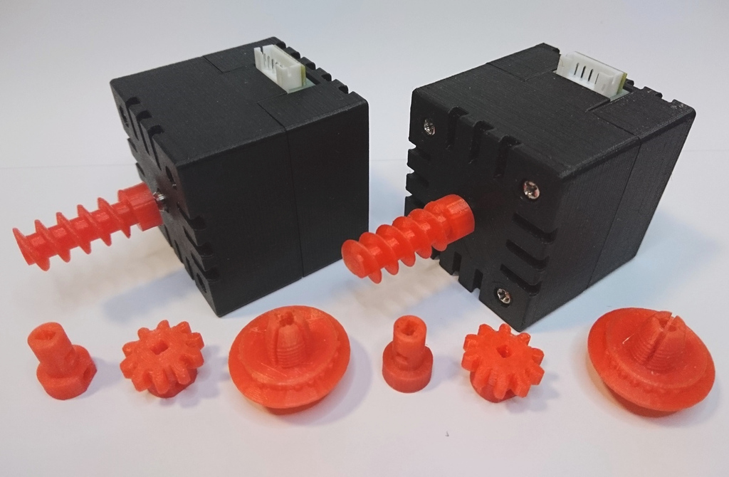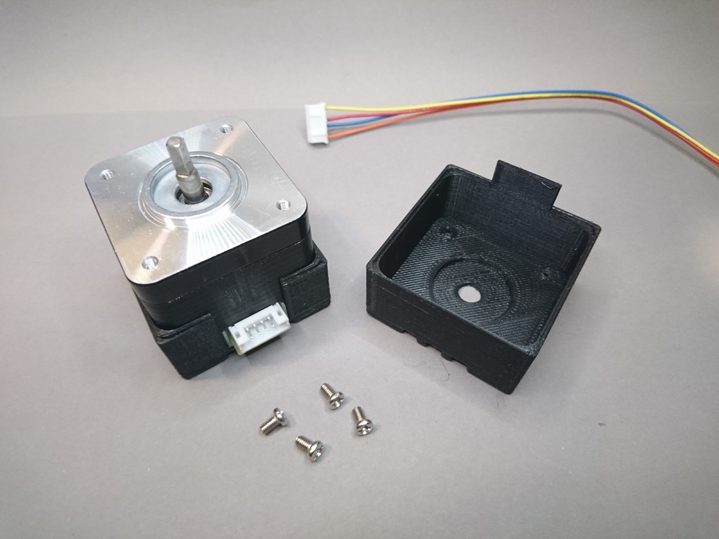 Vỏ cho động cơ bước Minebea 17PM-K374BN01CN 38mm NEMA 17, hiện đang được bán bởi Pollin với giá dưới 5 €. Hộp có kích thước 45x45x45mm giúp động cơ bước tương thích với hệ thống đồ chơi lắp ráp fischertechnik. Nó cũng có thể phù hợp với các động cơ bước NEMA 17 khác có chiều cao 38mm.
