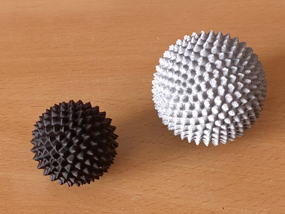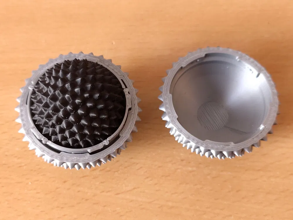 Tui mới làm mấy cái hộp tròn (hộp bóng), với lại cái spike ball, cái này có thể dùng làm đồ chơi kích thích (stim toy) - đây là phiên bản nhỏ của nó đó. Đồ chơi kích thích thì nó tạo ra một chút đau nhẹ, mà trong một số trường hợp (như ADHD) có thể giúp tập trung tốt hơn. Không gian bên trong nó nhỏ lắm, nên tui cũng không biết để làm gì được, nhưng cái spike ball lớn hơn thì đủ chỗ để chứa cái spike ball mini này. In ấn: In hai nửa với một cái vòng. Tui xài đầu phun 0.4mm và độ cao lớp in 0.17mm. Lắp ráp: Đặt cái vòng vô một nửa, đặt nửa còn lại úp lên trên cho thẳng rồi xoay theo chiều kim đồng hồ cho đến khi nghe hai tiếng click để khóa hai cái khớp nối ngàm (bayonet lock). Mở ra đóng vô chỉ cần một tiếng click, lúc đó cái vòng nó vẫn còn dính một nửa. Nếu bạn xoay tiếp tới tiếng click thứ hai, cái vòng có thể rớt ra. Nếu thấy phiền quá thì có thể dán keo nó dính vô một nửa. Mà do có mấy cái gai này nè, chắc cầm vô cũng hơi khó chịu ha.