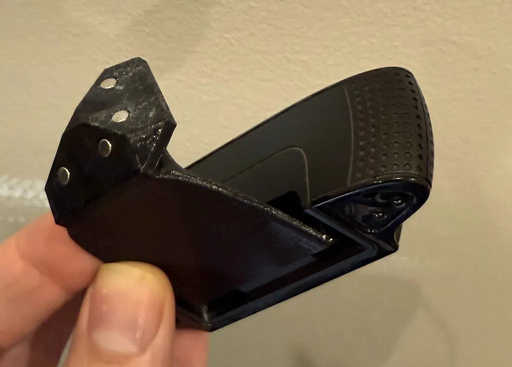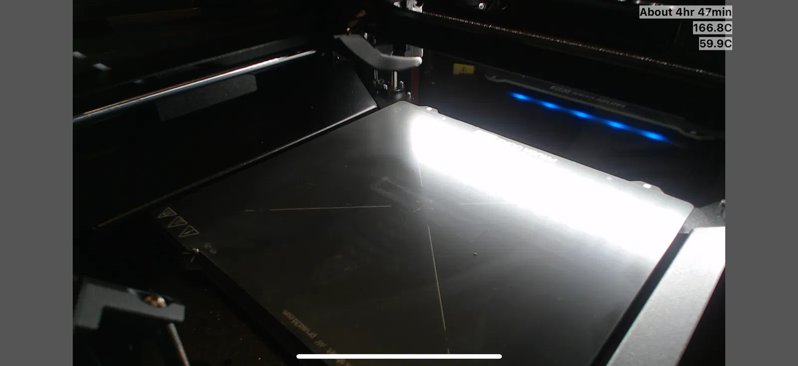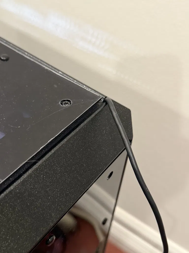 Đi dây cáp khá là khó với cái camera này; có một cái lỗ trên đế giữ filament của Core One vừa với đầu USB-A, nhưng không vừa với lõi ferit trên dây cáp của camera; cũng có một cái lỗ bịt ở phía sau mà không hoàn toàn vừa với đầu USB-A. Có thể phóng to một trong hai cái đó nếu bạn muốn dùng Dremel, nhưng tui muốn tránh làm vậy. Thay vào đó, tui cho dây cáp chạy ra qua một trong những khe hở nơi các thanh ray trên cùng chụm lại (xem hình). Việc này hơi mạo hiểm vì dây cáp bị kẹp khá chặt nhưng có vẻ là cách dễ nhất mà không cần cắt vào các tấm thép hay mica.