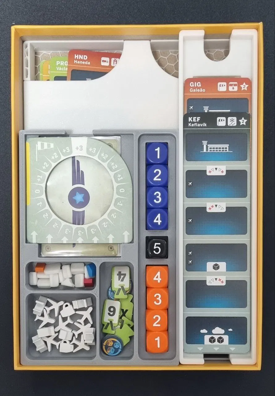 · tokens_tray.stl: Khay đựng 9 Xúc xắc (4 xanh + 4 cam + 1 đen) & 12 token Máy bay & 3 token Cà phê & 3 marker Đồng hồ đo (xanh/cam/đỏ) & 10 marker Công tắc & marker Nhiên liệu & 6 token Nội bộ & 3 token Bật lại & đĩa Trục máy bay & token Máy bay & 6 lá bài (đã bọc) & Vòng gió.