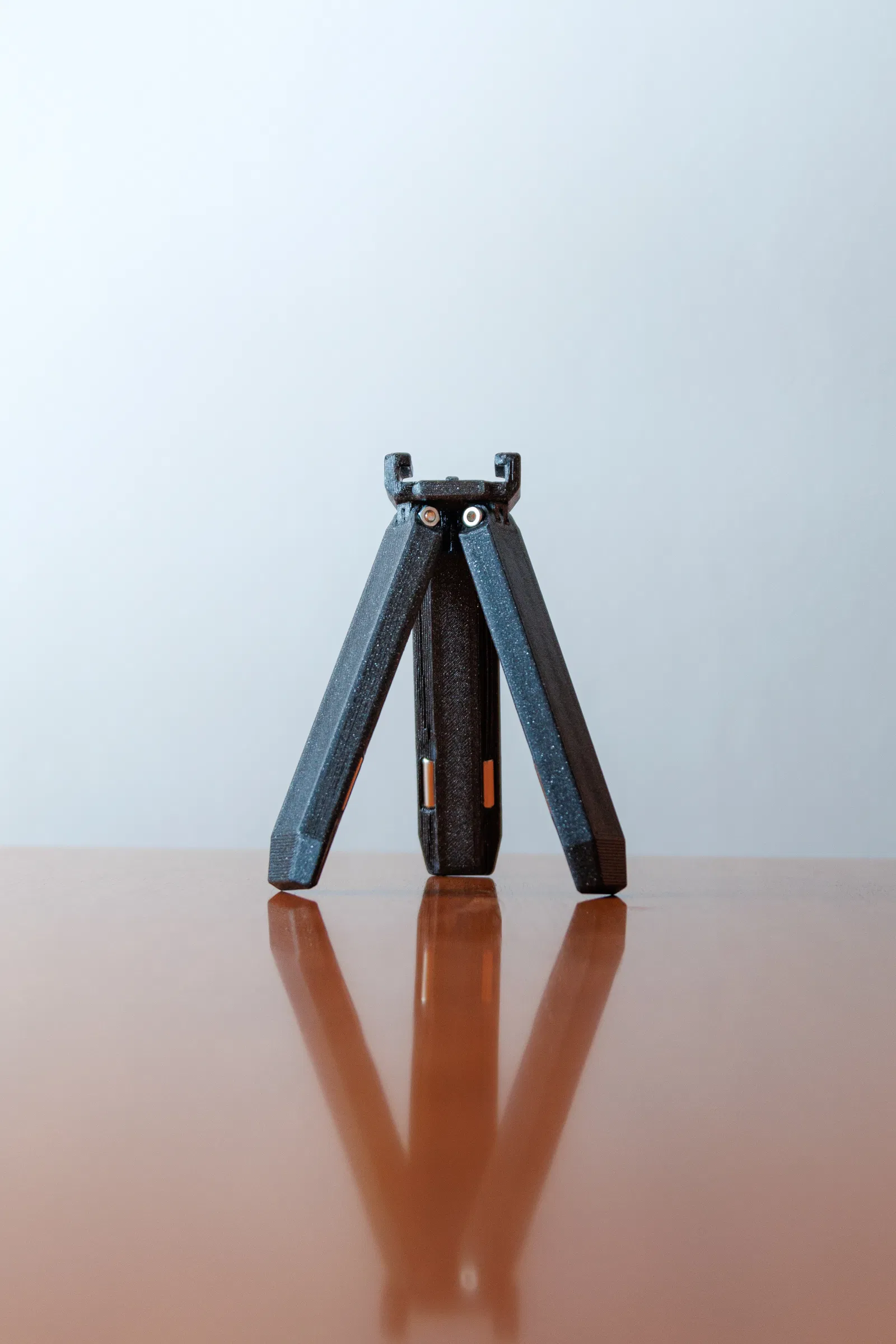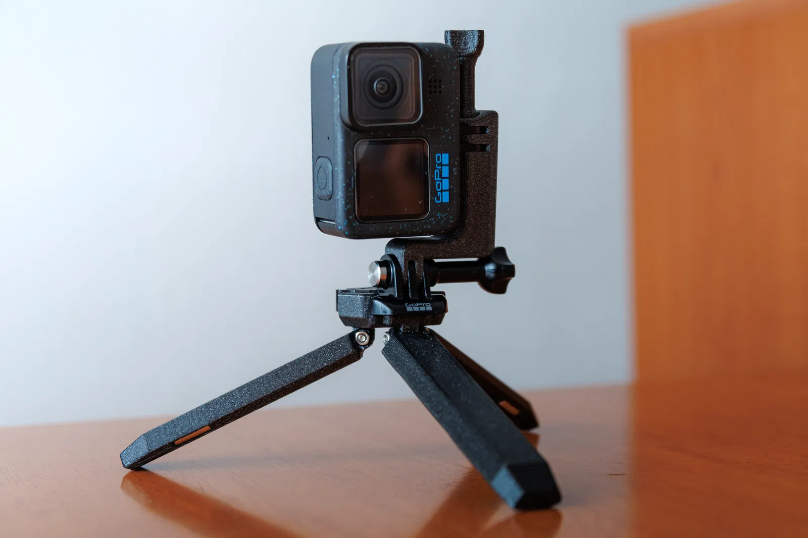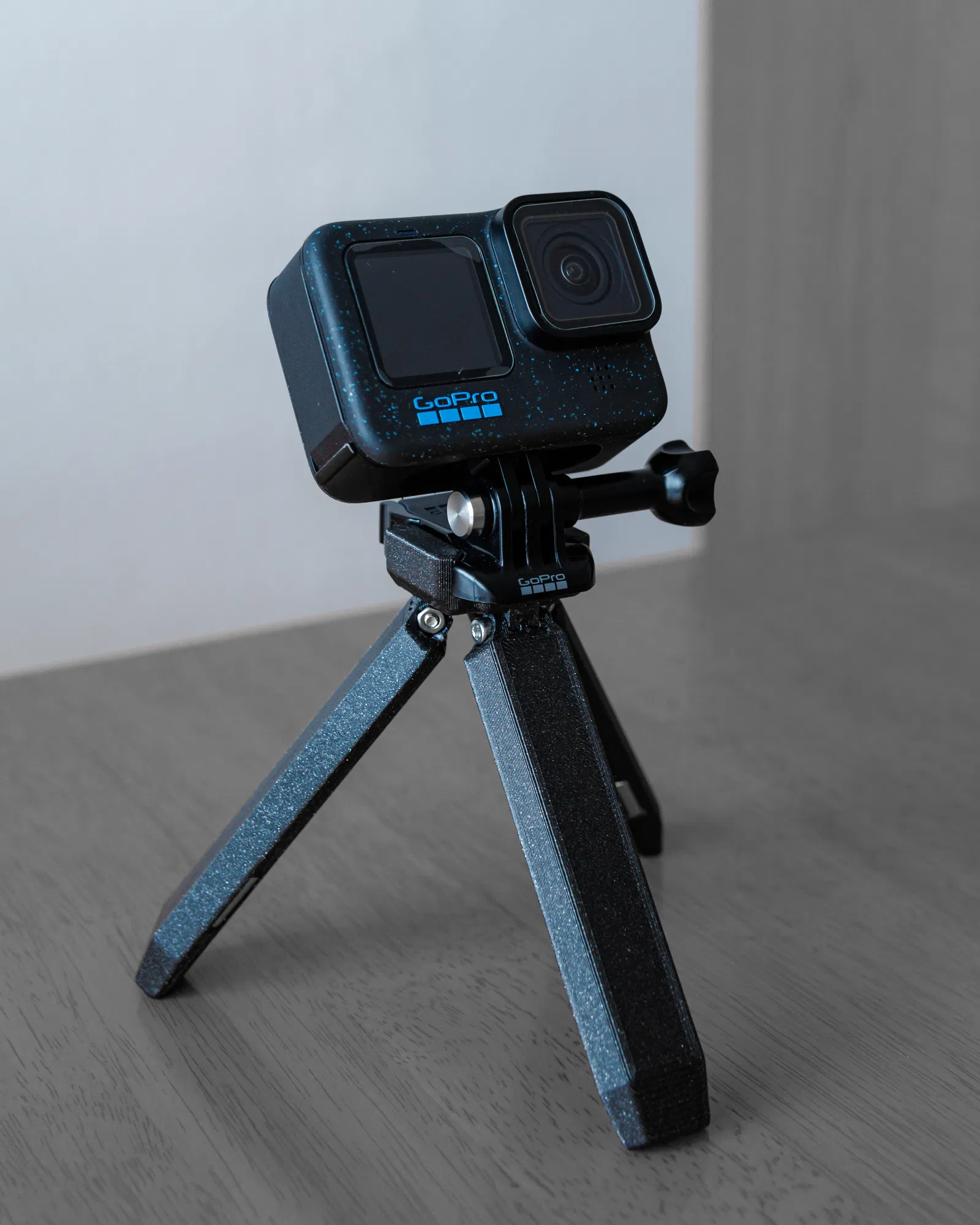 Chân máy GoPro nhỏ gọn, có thể in 3D, kèm ngàm kết nối nhanh GoPro. Có tùy chọn nam châm cho cảm giác bấm đã tay. Khuyến khích in bằng PLA với giá đỡ để tăng độ bền. Kích thước: cao 11cm, đường kính tay cầm 3.5cm. Cần ốc và đai ốc M3, có thể thêm nam châm.