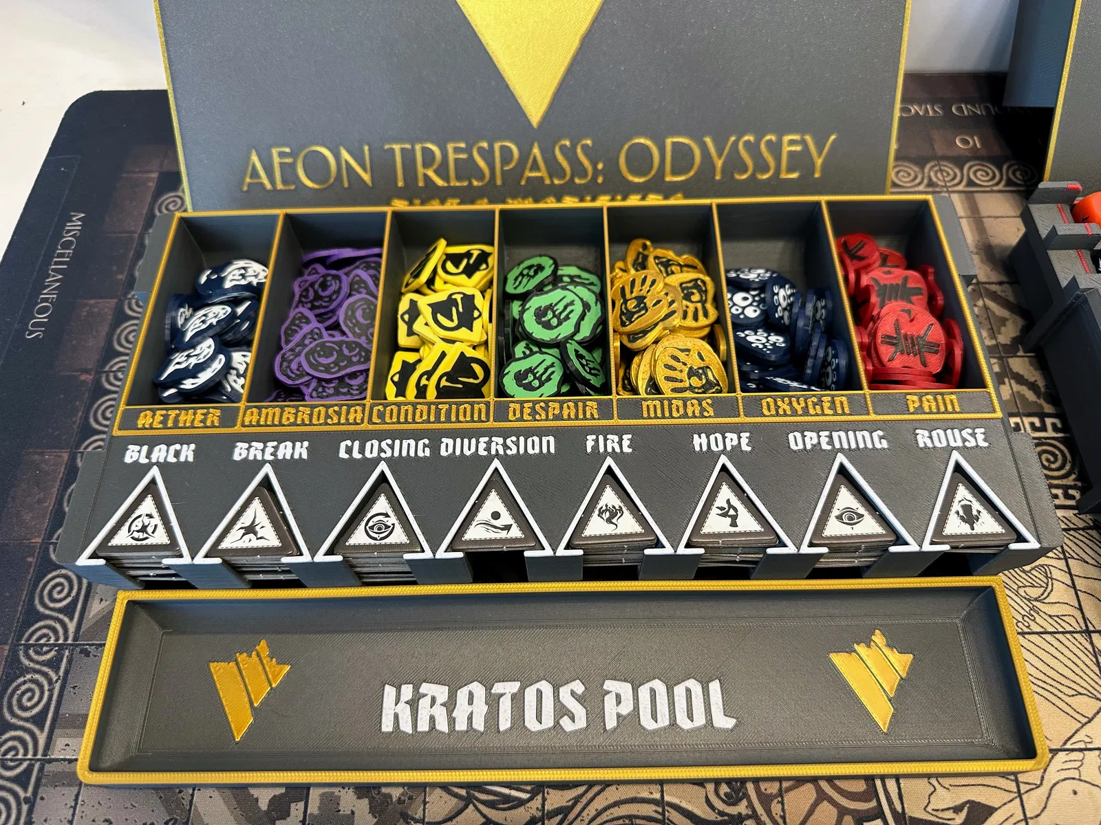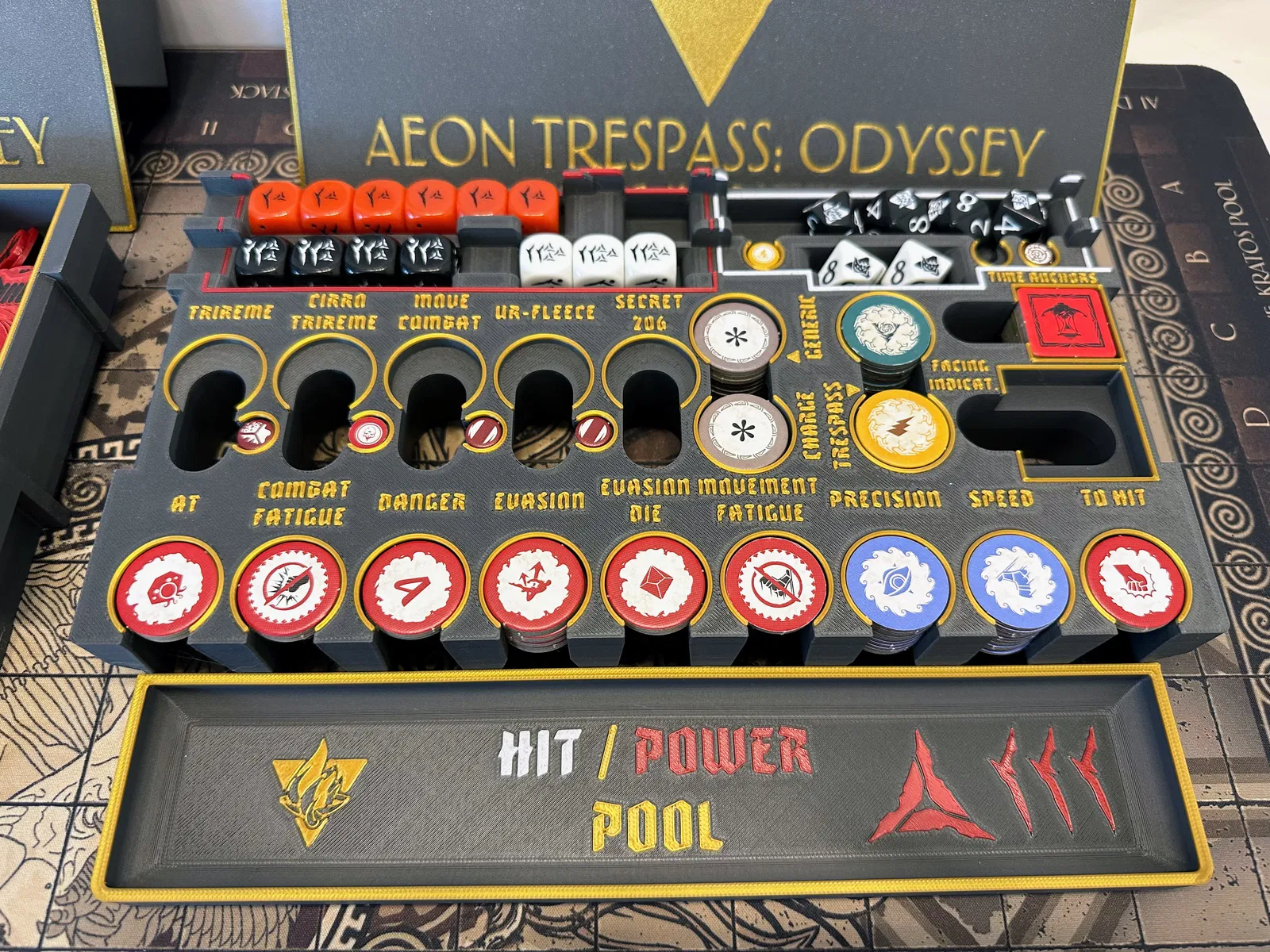 Thiết kế khay đựng tất cả token và xúc xắc cho game Aeon Trespass, từ cycle 1 đến 5. Khay được sắp xếp gọn gàng, dễ nhìn, có chỗ cho các pool khác nhau. Có khay riêng cho Kratos và token Condition, khay cho xúc xắc To Hit, Power và modifier. Bao gồm cả nắp đậy. Kích thước lớn, yêu cầu máy in khổ lớn. Có các lưu ý in ấn chi tiết.
