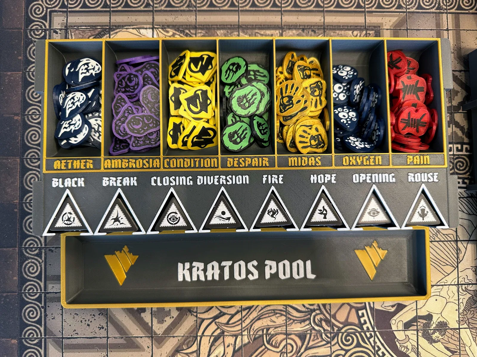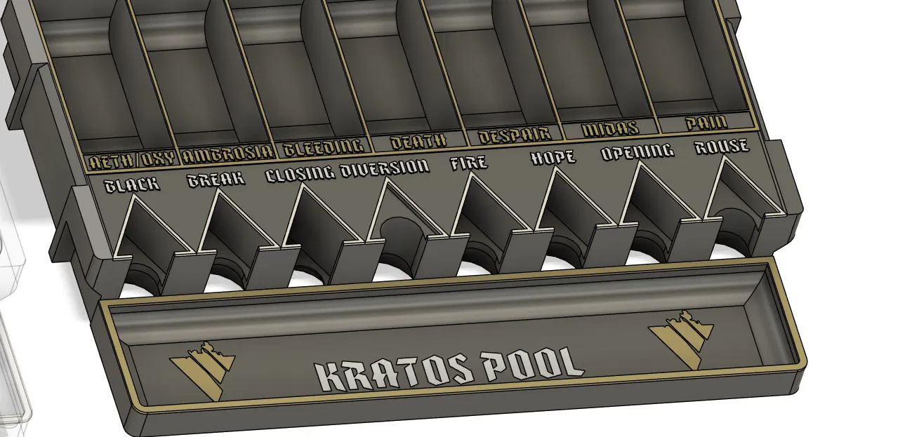 Aeon Trespass đúng là một game cực kỳ hoành tráng và tuyệt vời nhưng… QUÁ NHIỀU TOKEN! A khách có nhờ mình làm một cái khay duy nhất để chứa TẤT CẢ các token và xúc xắc dùng trong trận đấu, xuyên suốt tất cả các cycle, sắp xếp gọn gàng, dễ nhìn, có chỗ cho các pool khác nhau (to hit, power, kratos). Đây là thiết kế mình nghĩ ra và… mình thấy nó đẹp bá cháy. Và RẤT LỚN! Thiết kế đi kèm: Một khay cho Kratos Pool, 8 token Kratos, và 7 loại token Condition khác nhau (xem các mẫu Condition của mình tại đây). Khay có kích thước 284x211x40mm. Khay thay thế với 5 ô đựng condition, nếu bạn không muốn dùng token riêng cho Midas, Pain, Death và Bleeding.