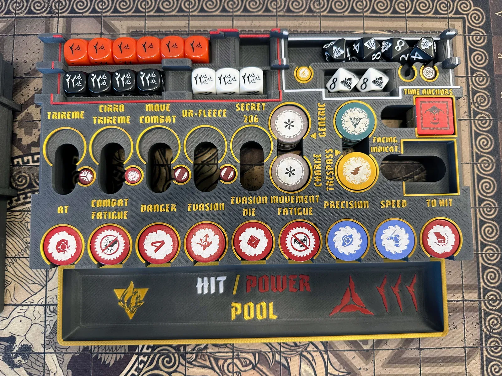 - Một khay cho pool xúc xắc To Hit và Power cùng TẤT CẢ token modifier (ví dụ: speed, to hit), kể cả những cái bí mật. Khay có kích thước 286x188x40mm.