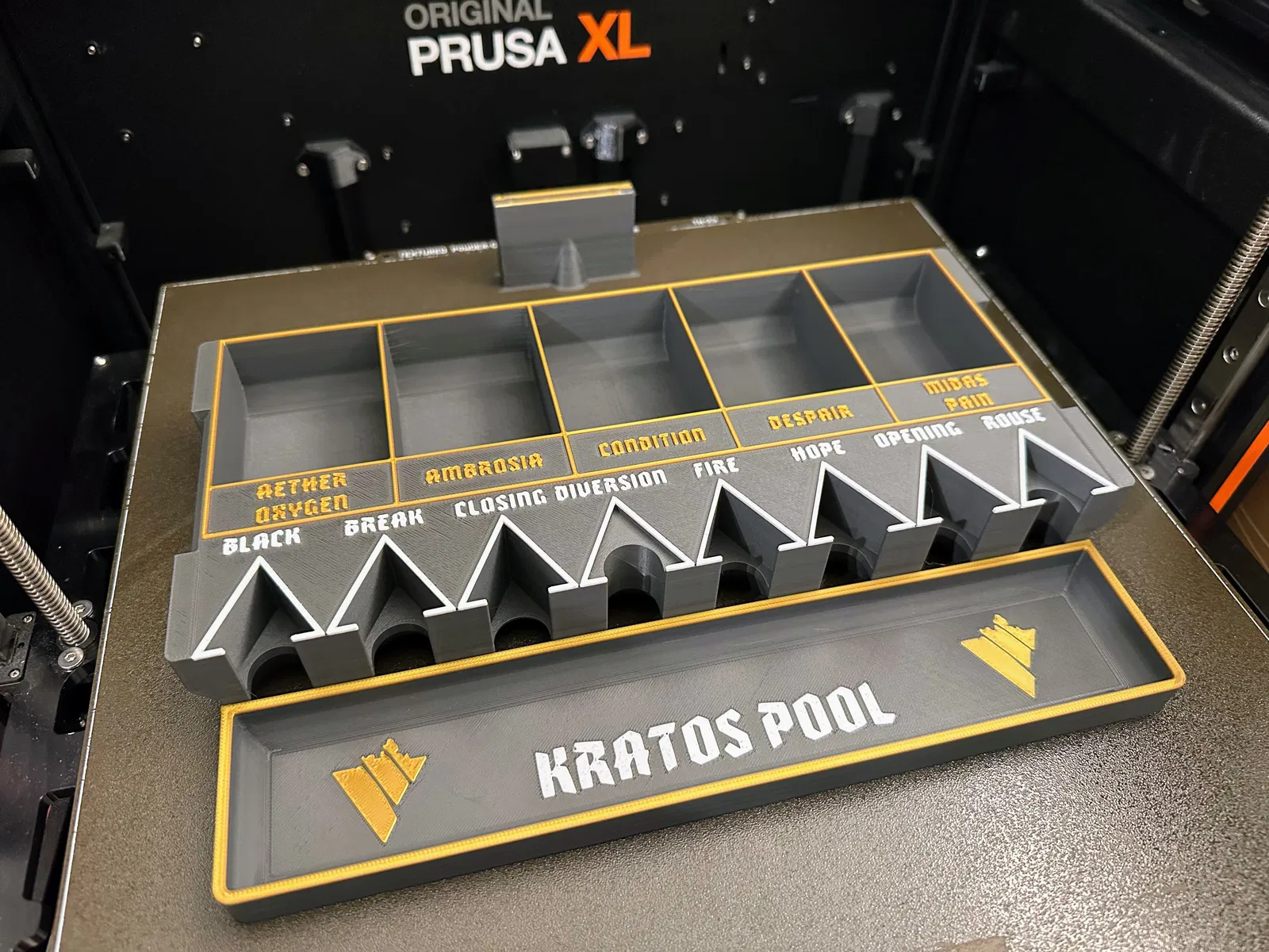 - 2 nắp đậy cho mỗi khay. Tất cả các khay đều có độ sâu vừa đủ trong các ô để chứa hết số lượng token trong game và khi đầy thì các token đều ngang bằng nhau. Lưu ý khi in: Cũng có các thiết lập in sẵn với màu sắc được gán. Kích thước khá lớn (lớn nhất là 286mm) nên chỉ in được trên máy in khổ lớn như XL. 2 thiết lập in đa vùng (multi bed print) yêu cầu Prusa Slicer 2.9 trở lên.