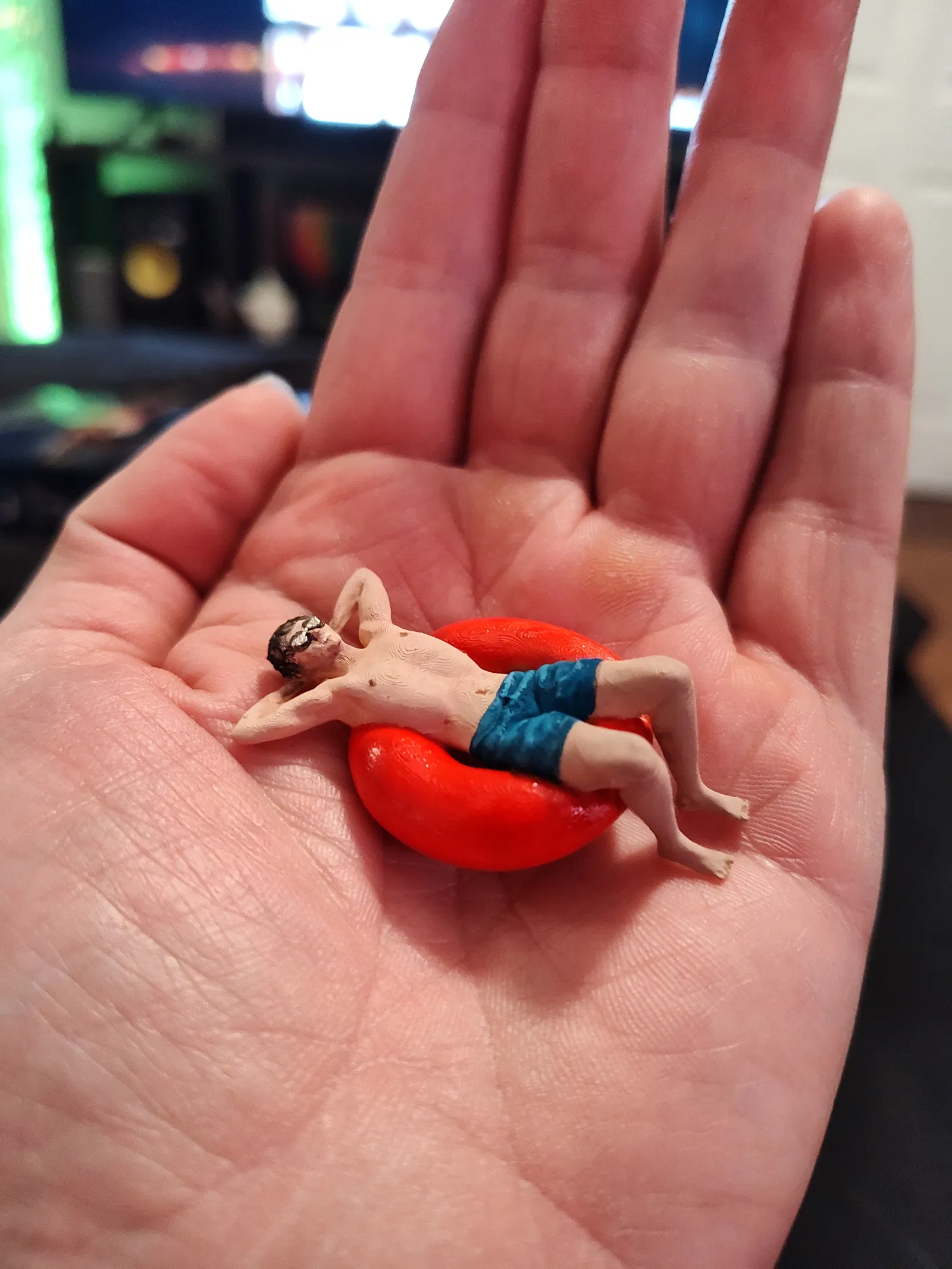 Thằng bé này dường như không có gì phải lo lắng hết trơn á. Hôm nay nó được nghỉ, và tất cả những gì nó muốn làm là thư giãn ở bất cứ đâu bạn thấy hợp lý. Tôi đã tạo ra nó bằng Blender để in ra xài trong một bức tranh tôi vẽ, có tên là "Baewatch", nhưng tôi nghĩ nó có thể là một người bạn rất hay ho để có bên mình đó... Nó có "vibe" (tinh thần) tuyệt vời lắm!
