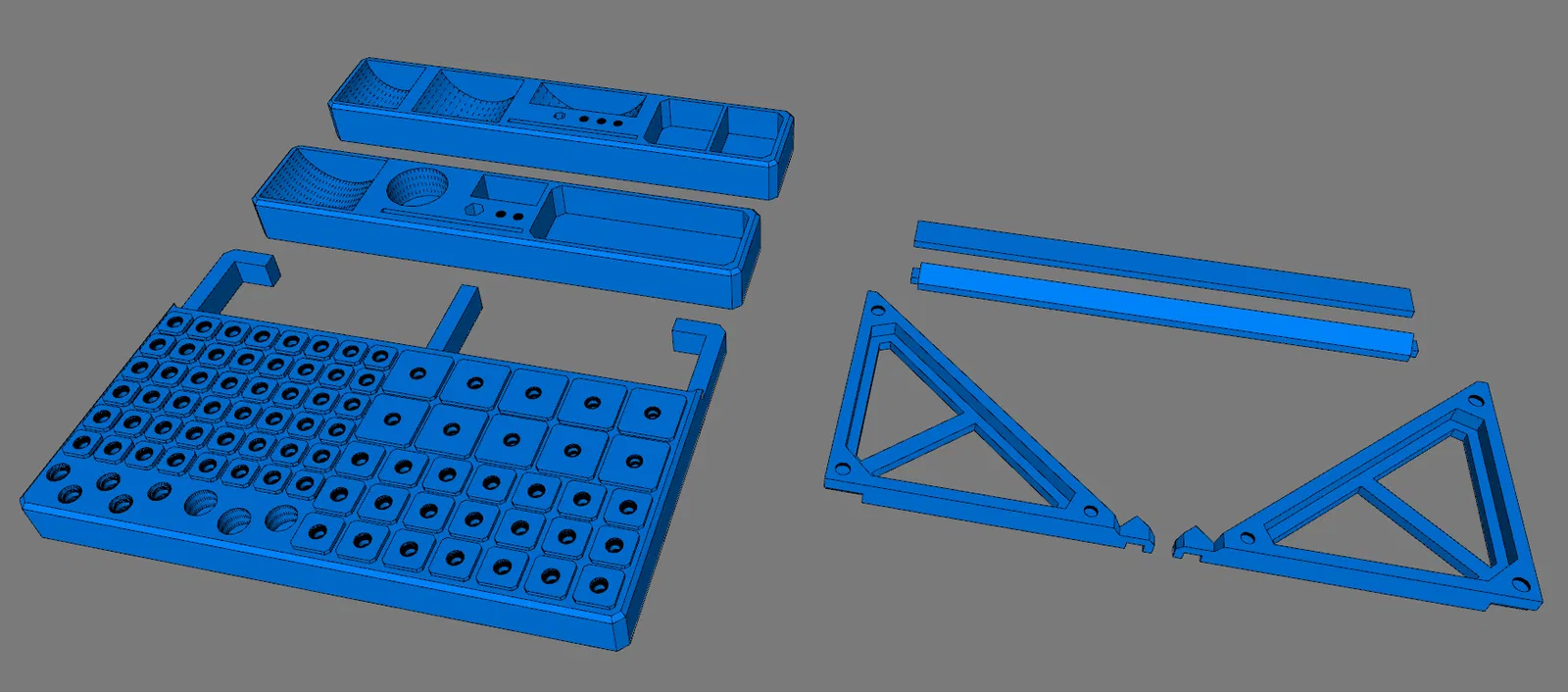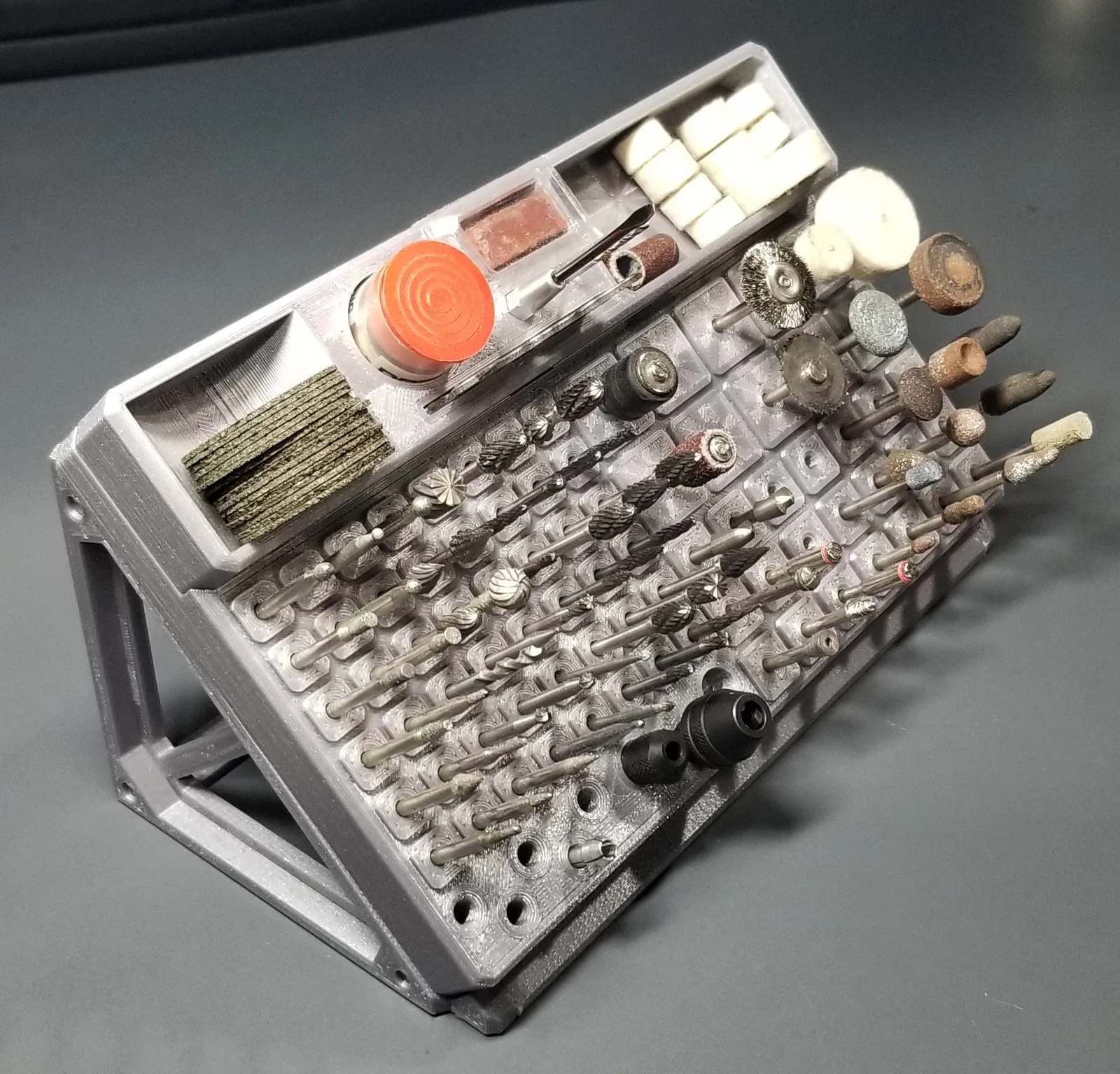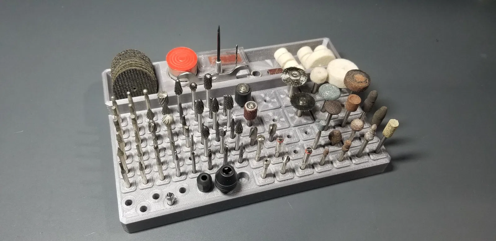 Khay và chân đế giúp sắp xếp và phân loại mũi khoan, dụng cụ Dremel một cách dễ dàng. Kích thước đế 7.5" x 5", không cần hỗ trợ khi in. Dùng keo siêu dính Gorilla và in bằng PLA.