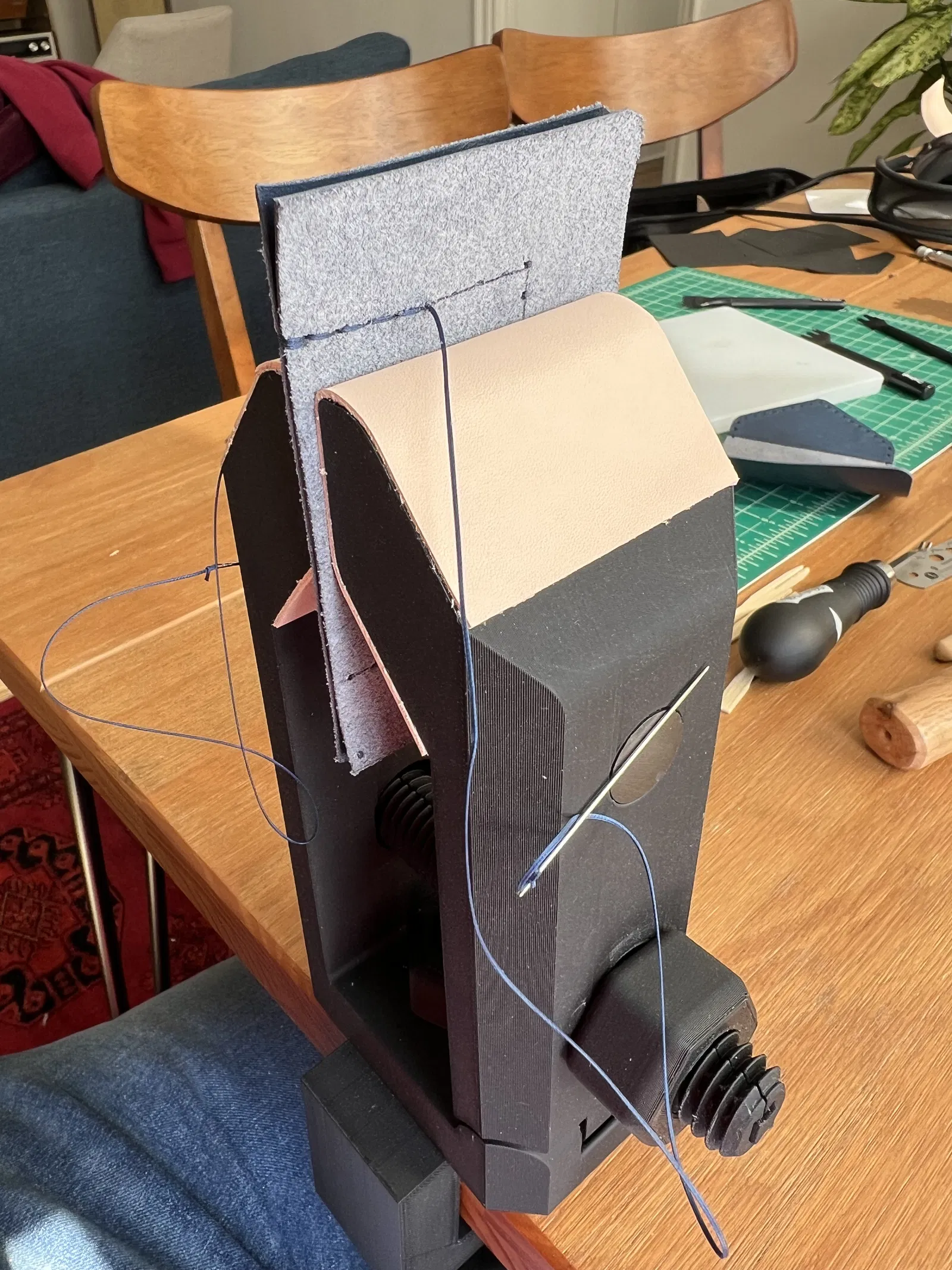 Đây là con ngựa khâu da 3D, không cần phần cứng, chỉ kẹp được đồ da nhỏ như ví. Phiên bản đầu nên có vài lỗi, bu lông khó siết. Cần in 2 mảnh kẹp chính cùng nhau, dùng hỗ trợ và làm sạch bằng nhíp. Bu lông in nằm ngang cho chắc.