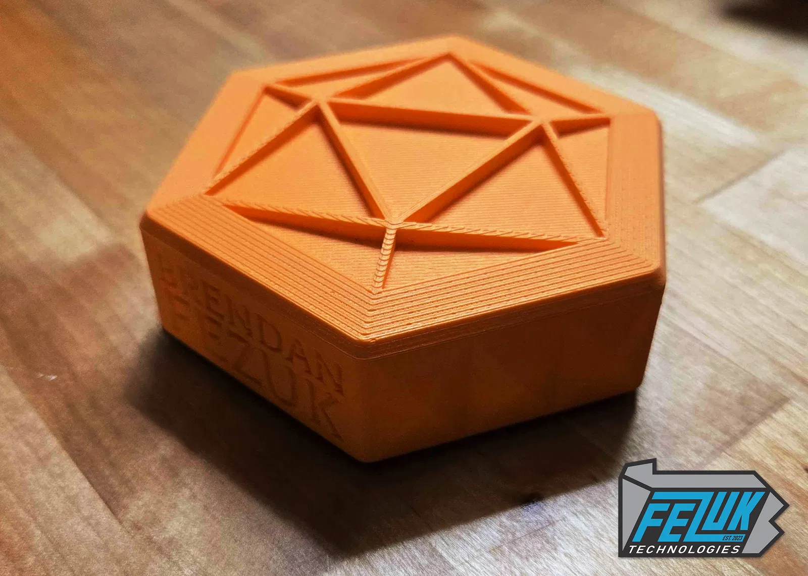 - Biểu tượng D20 nổi trên nắp, đồng thời là tính năng khóa cho khay tung xúc xắc.