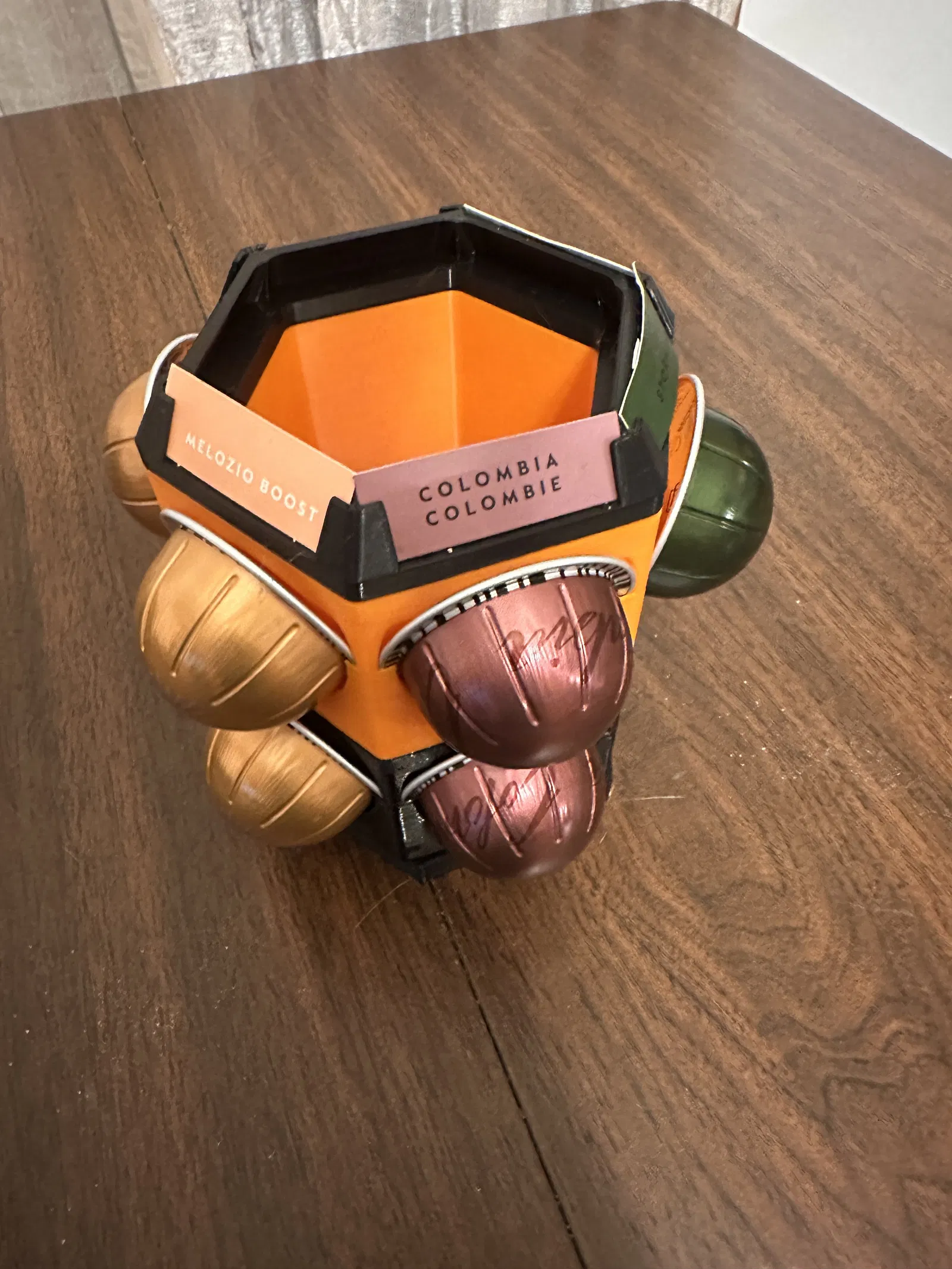 Một tòa tháp xoay dạng module dành cho cốc Nespresso Vertuo. Tôi cũng đã thêm một cái nắp cho phép bạn dán nhãn cho các cột của mình. Bạn cần cắt khoảng 1/16" ở cạnh nhãn nếu bạn sử dụng hộp đựng vỏ như tôi.