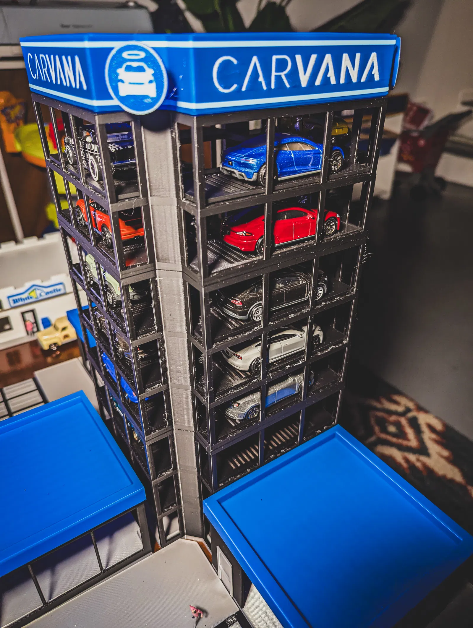 Tôi muốn có một tòa tháp Carvana của riêng mình để cất giữ những chiếc xe Hot Wheels của tôi, và tôi đã tìm kiếm một mô hình trưng bày Carvana nhưng không tìm thấy gì. Thứ gần nhất tôi tìm thấy là bộ trưng bày Menards, trông rất tuyệt nhưng sai tỷ lệ, hoặc quá lớn hoặc quá nhỏ đối với Hot Wheels. Vì vậy, tôi quyết định tự thiết kế mô hình của mình ở tỷ lệ 1:64.