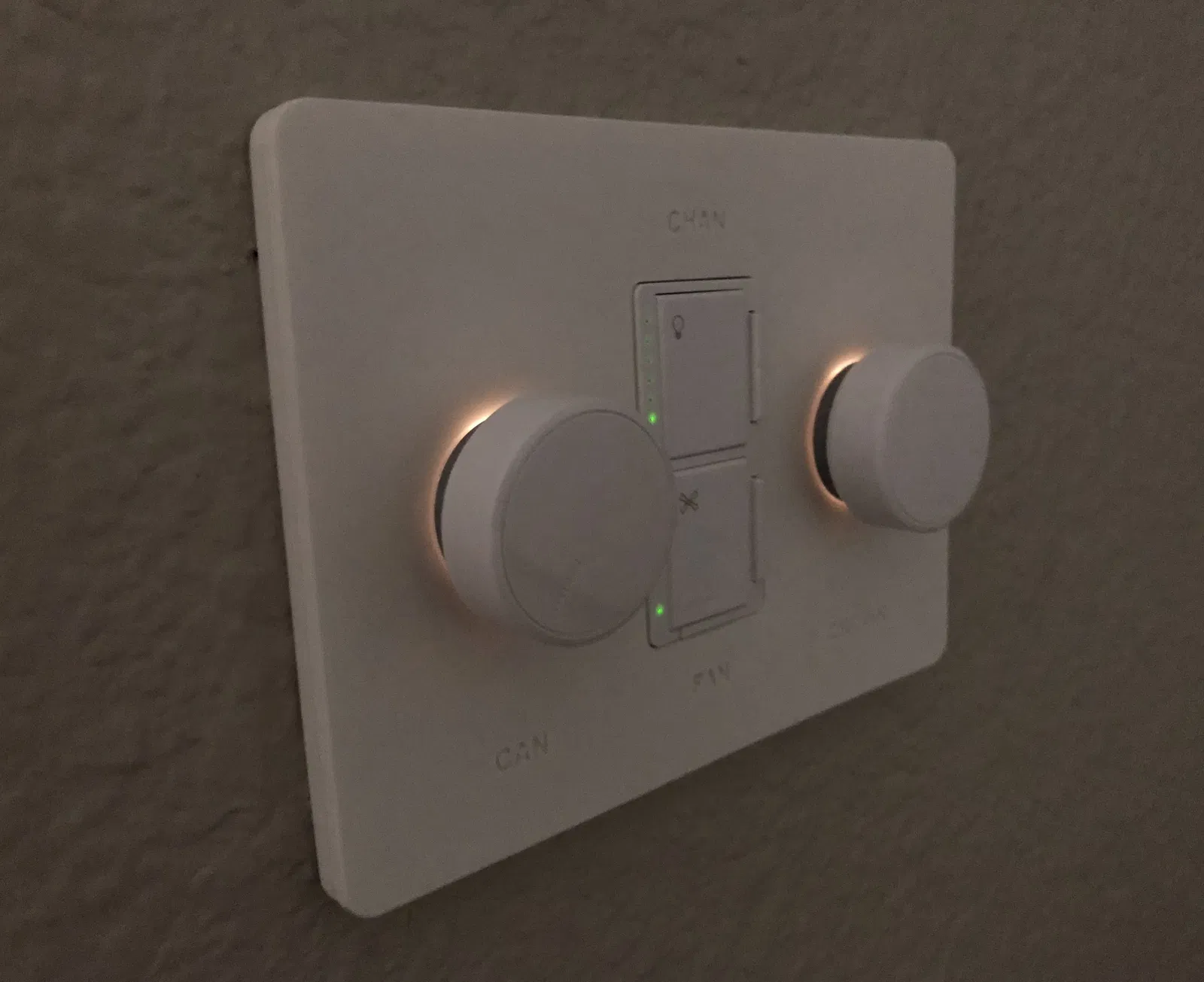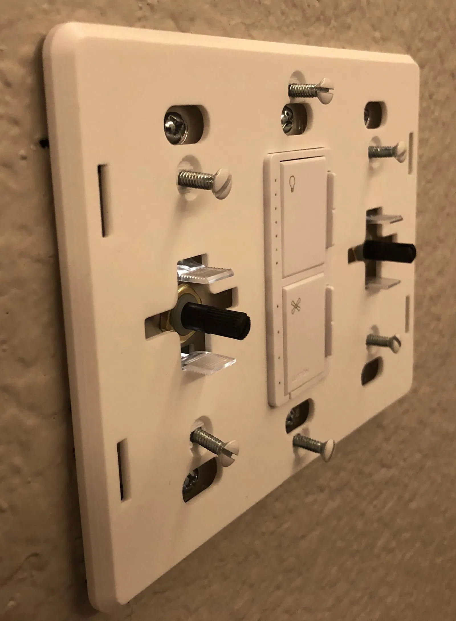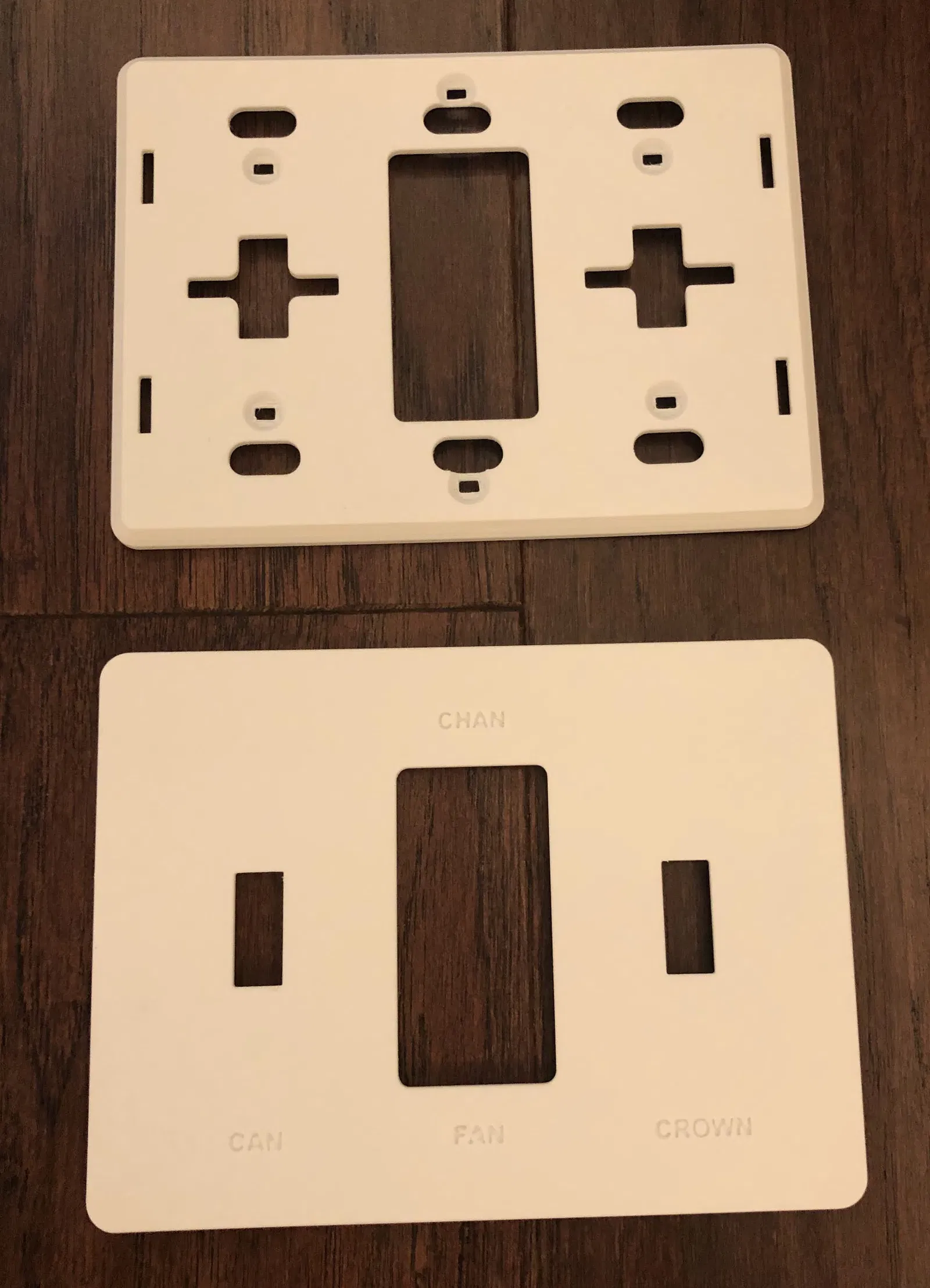 Tấm ốp tường không cần vít tùy chỉnh. Tôi cần một tấm ốp tường 3-gang có công tắc bập bênh ở giữa và các công tắc bật/tắt ở hai bên. Ban đầu tôi đã xem xét sử dụng WALLY - Wall Plate Customizer, nhưng tôi muốn có vẻ ngoài không cần vít, vì vậy tôi đã tạo ra những thiết kế này.