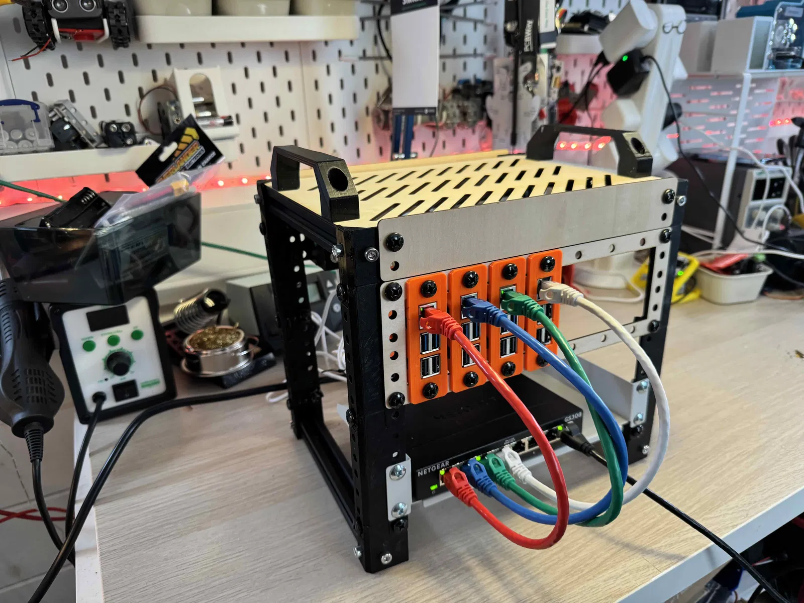 Đây là giá đỡ Mini 10" cho Raspberry Pi, kết hợp các tấm mặt trước và mặt trên cắt laser với các góc in 3D. Tủ rack nhỏ này lý tưởng cho phòng lab tại nhà hoặc văn phòng nhỏ, giúp tổ chức thiết bị mạng và Raspberry Pi một cách gọn gàng, hiệu quả.