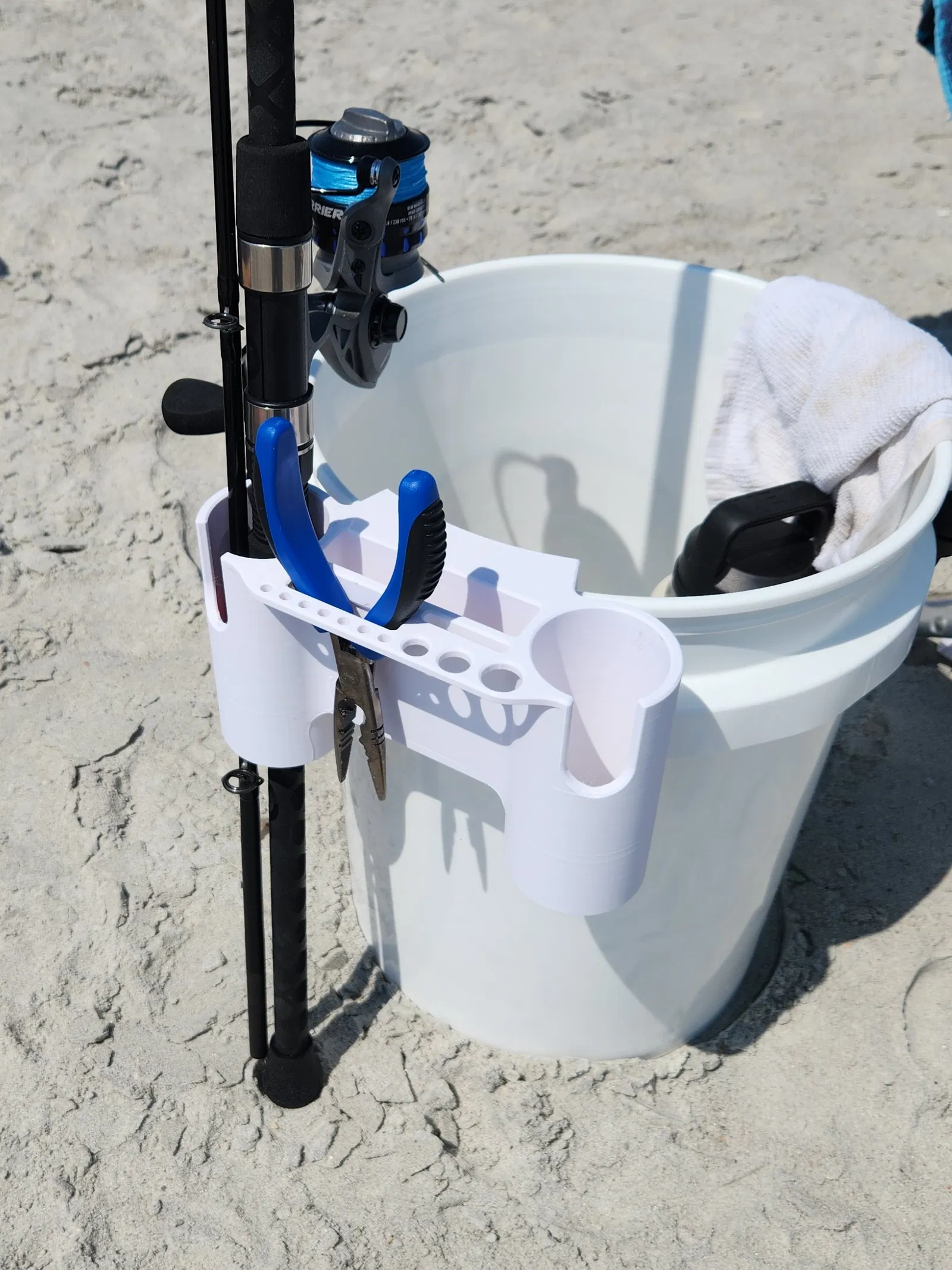 Hệ thống caddy đựng kềm, cần câu, kéo và các vật dụng khác. Sản phẩm này chỉ vừa với xô nhựa 5 gallon có tay cầm bằng dây của Basspro/Offshore Angler. Khuyến khích dùng PETG/ABS vì PLA dễ chảy trong thời tiết nóng.
