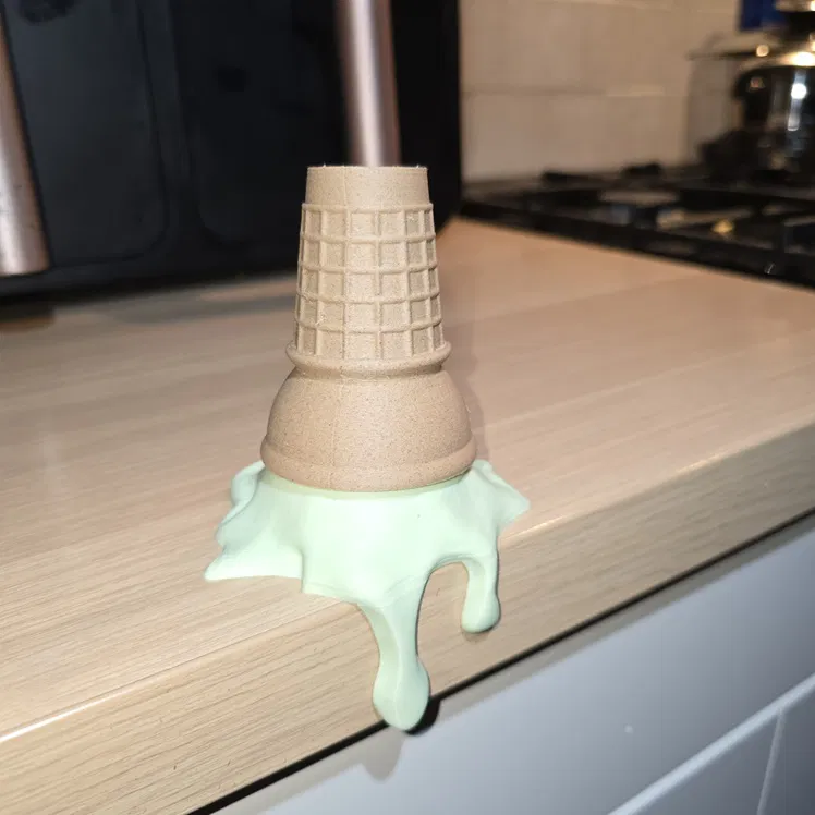 Mô hình kem ốc quế đang tan chảy, một món đồ trang trí độc đáo cho không gian của bạn. Dễ dàng in ấn mà không cần "support", chỉ cần dán các bộ phận lại với nhau. Thích hợp làm đồ trang trí, vật phẩm decor, mang đậm không khí mùa hè.