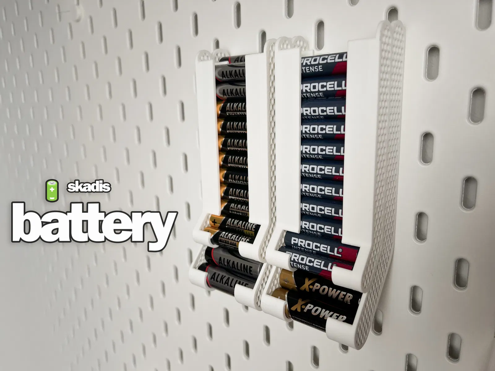 Ngăn nắp hơn, tiết kiệm không gian hơn! Giá đỡ pin AA/AAA này được tối ưu hóa, có thể xếp chồng và tương thích với IKEA Skadis. Lắp đặt dễ dàng và giữ cho pin của bạn luôn gọn gàng.