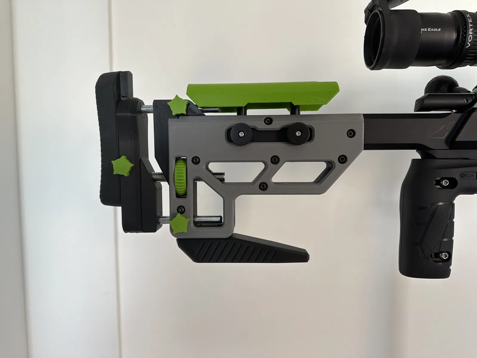 Bản nâng cấp in 3D cho khung gầm MDT Oryx, cho phép điều chỉnh không cần dụng cụ và bổ sung các điểm gắn kết phía trước. Dự án bao gồm báng súng điều chỉnh độ cao và chiều dài, kê má dài hơn, trọng lượng cân bằng phía trước và các tính năng khác. Yêu cầu phần cứng bổ sung và một số công việc lắp ráp. In bằng PETG, khuyến nghị sử dụng đầu phun lớn và nhiều lớp vỏ.