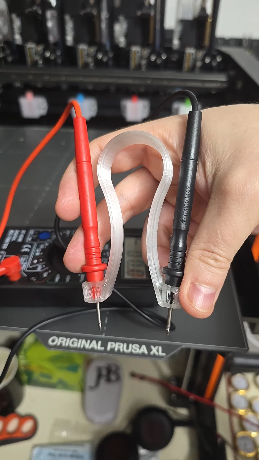 Kẹp đo đồng hồ vạn năng được tối ưu hóa cho việc in 3D. Các cài đặt in đề xuất bao gồm zero top/bottom layers, zero infill, 3 perimeters, nozzle 0.4, layer height 0.2 và không cần supports. Chất liệu PLA được khuyến nghị.
