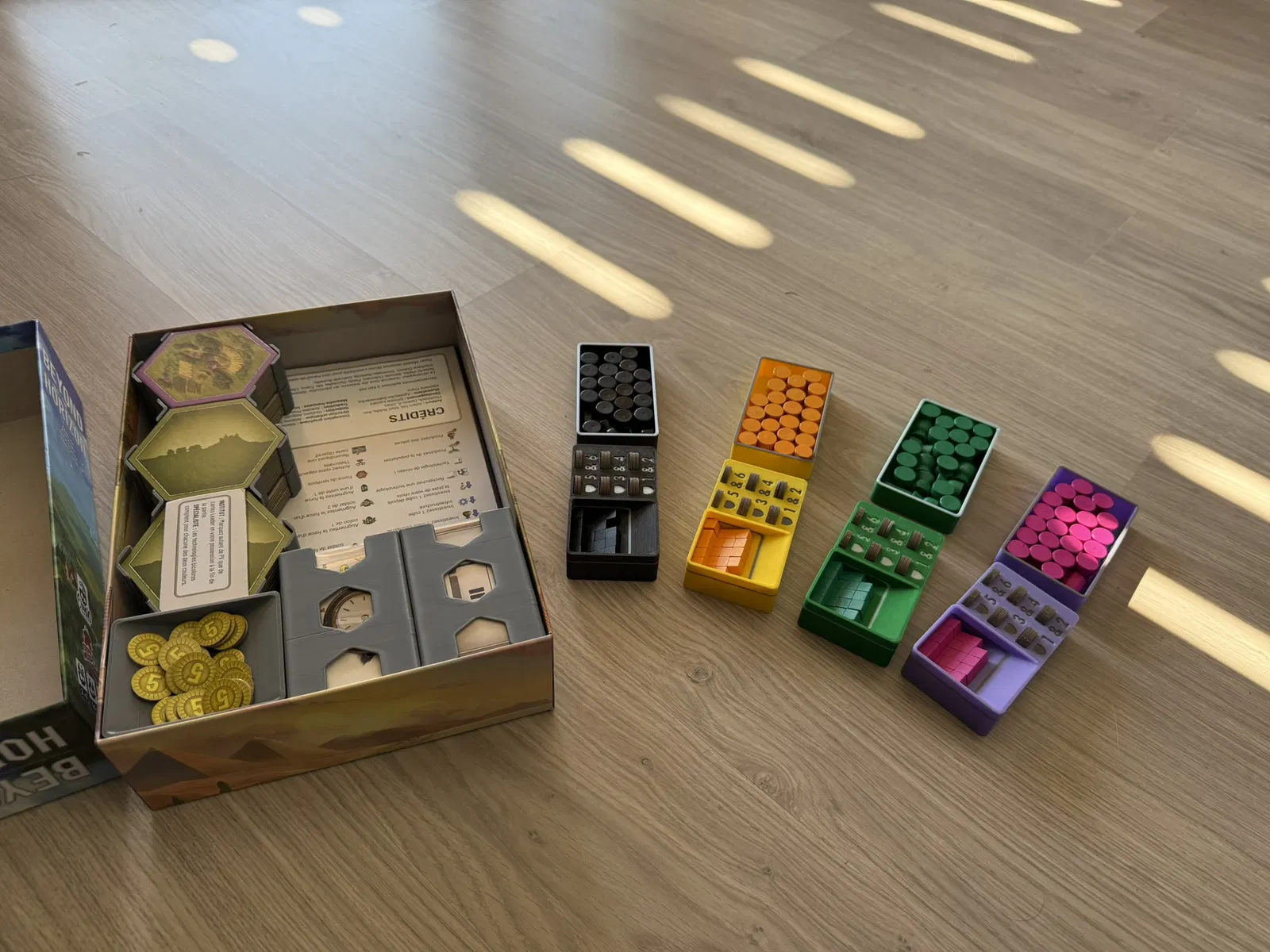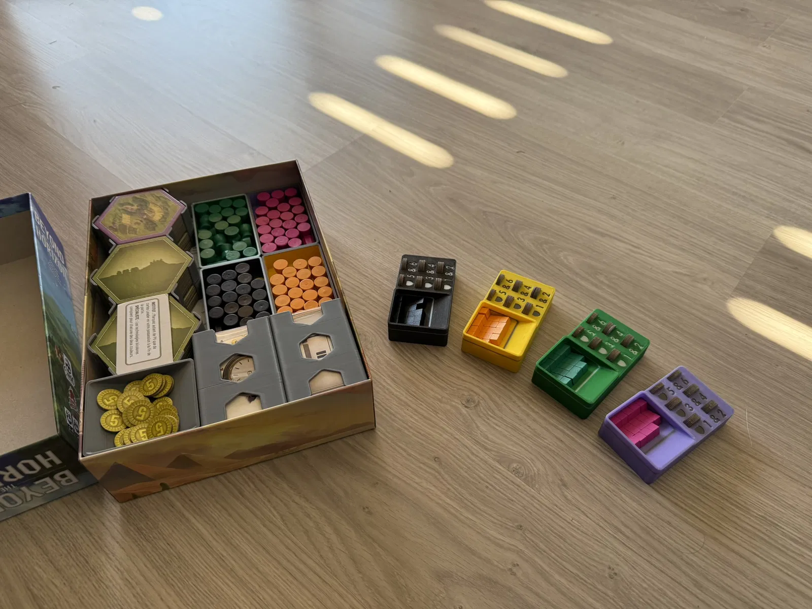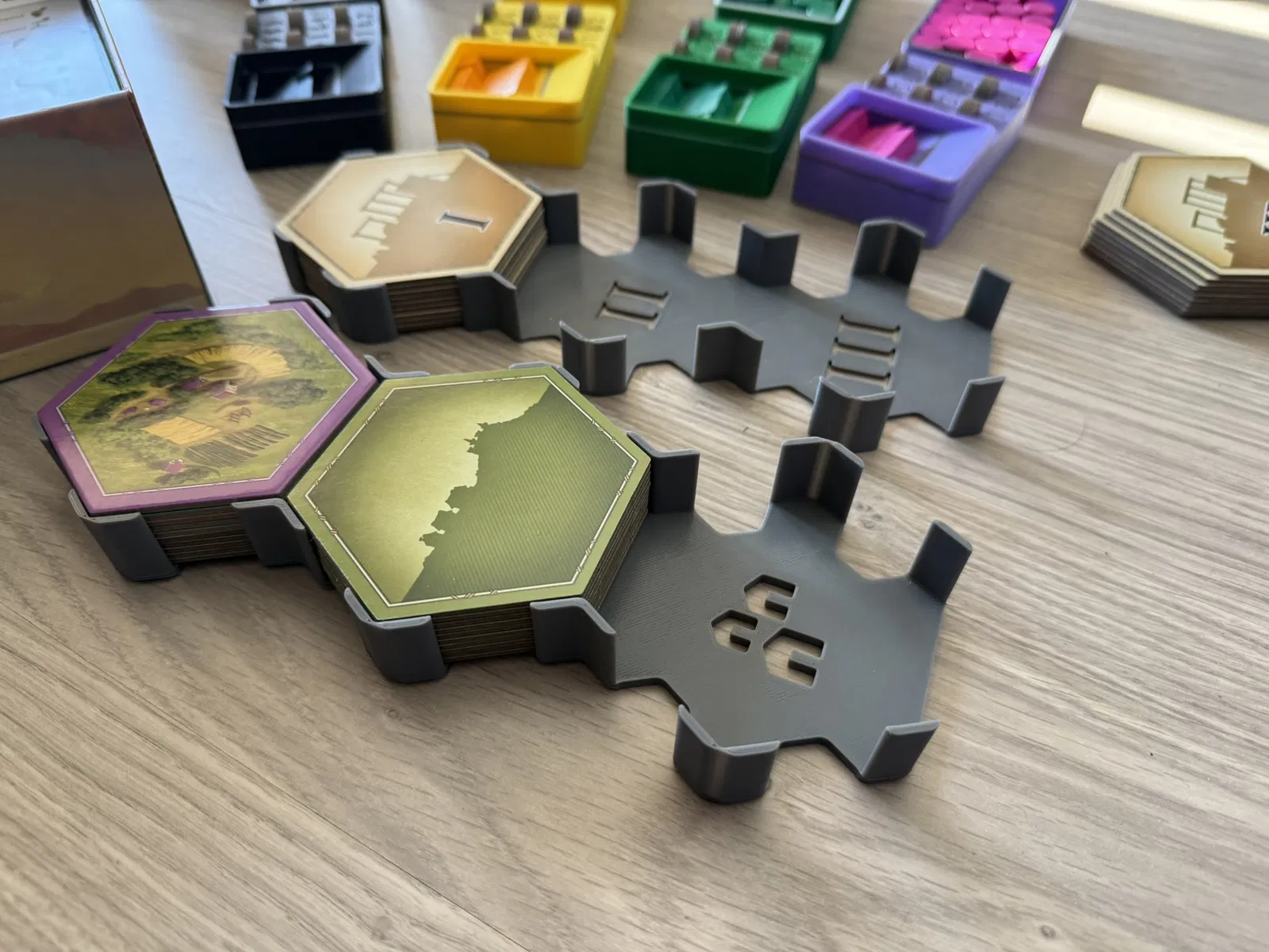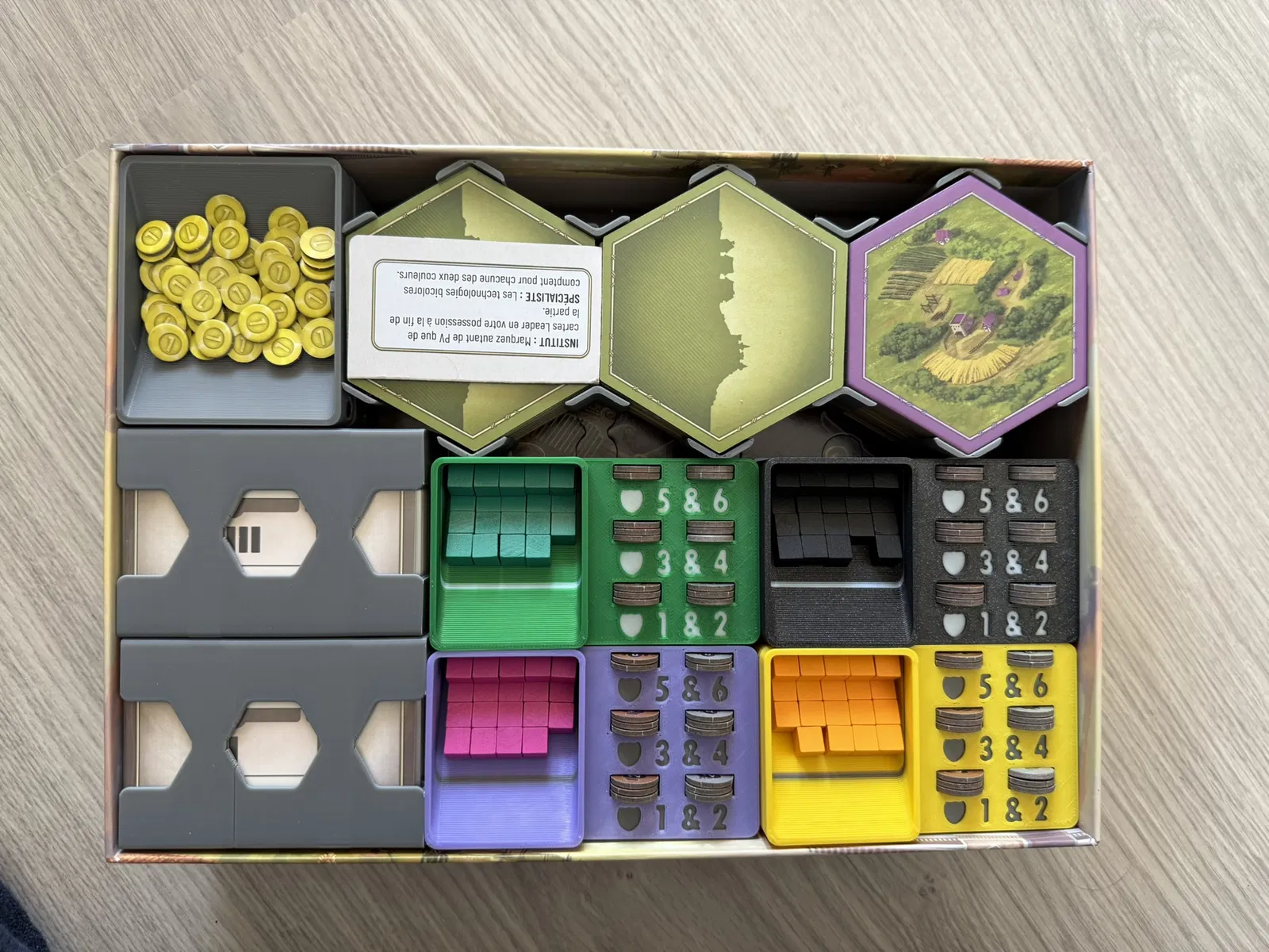 Cái insert này xài tốt cho bài có bọc sleeve, nhưng bài không sleeve cũng được. In ra dễ, không cần support. Có thể tùy chỉnh in kèm nam châm cho mấy khay tiền/token. Bản mini mở rộng cũng có sẵn.