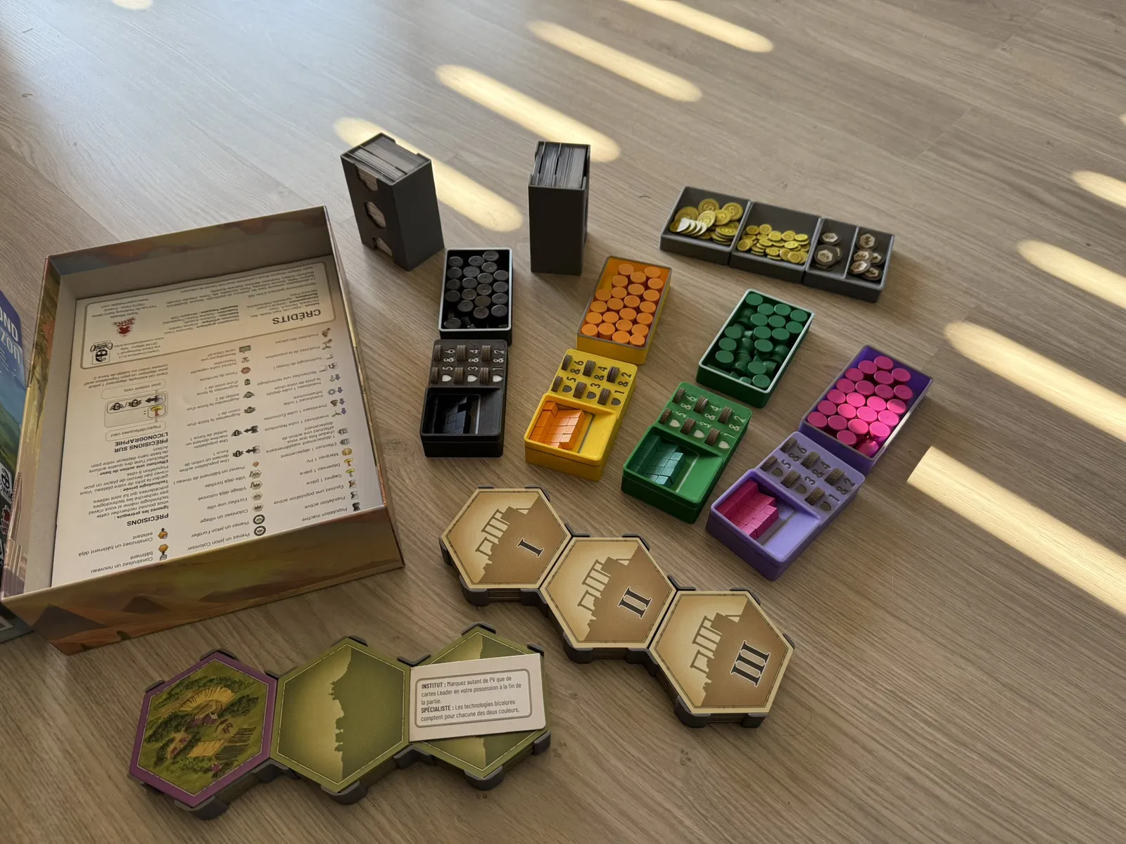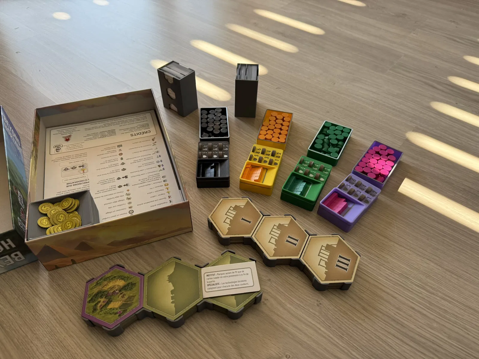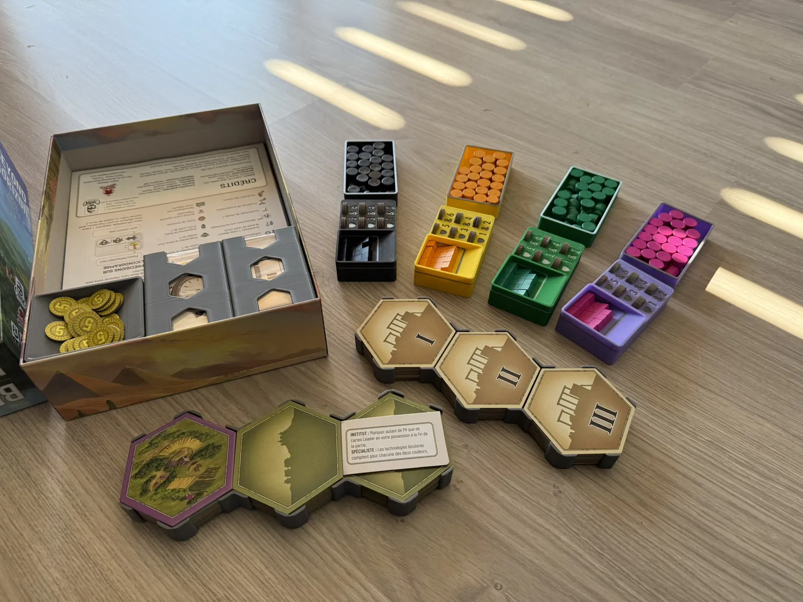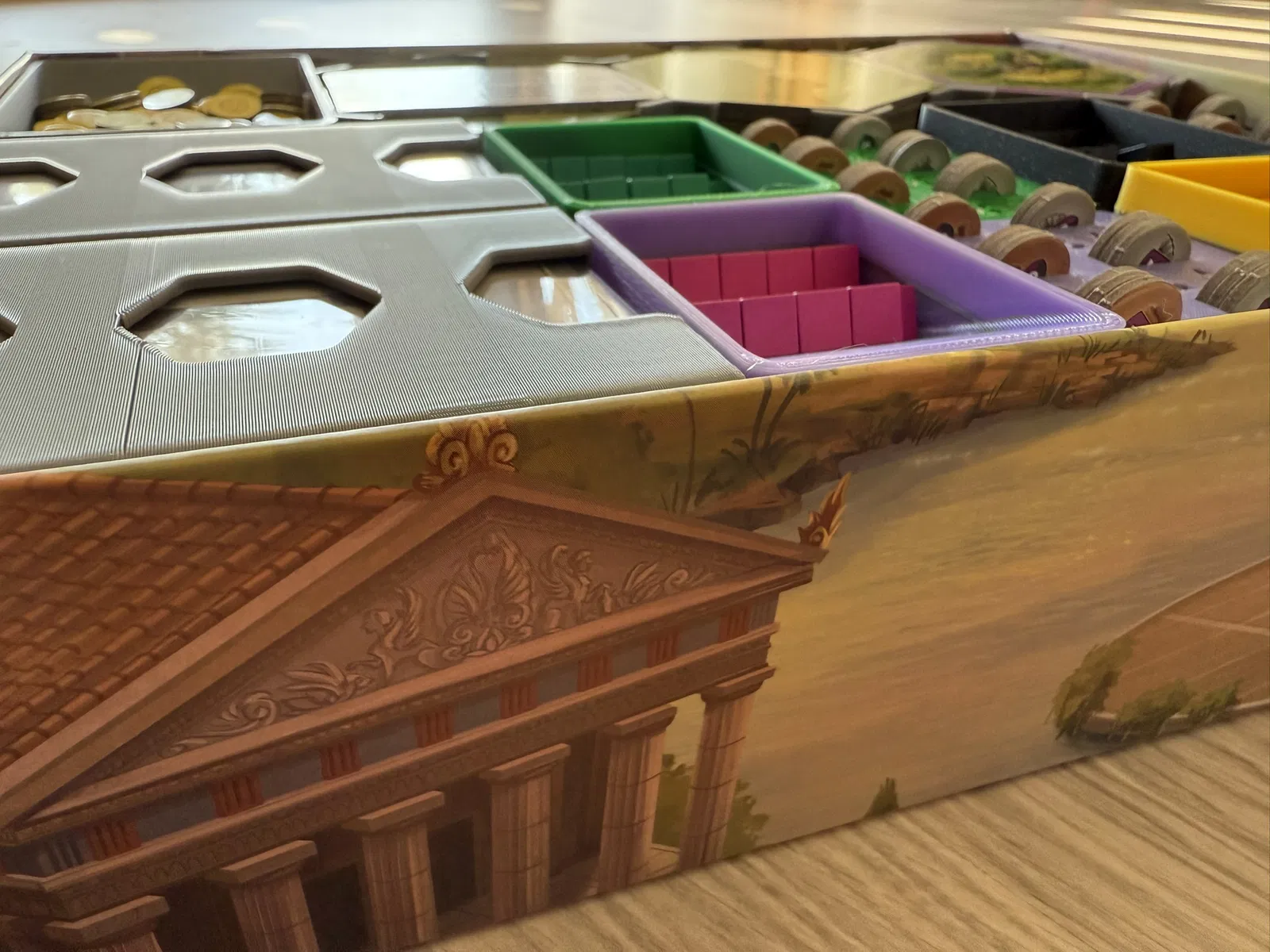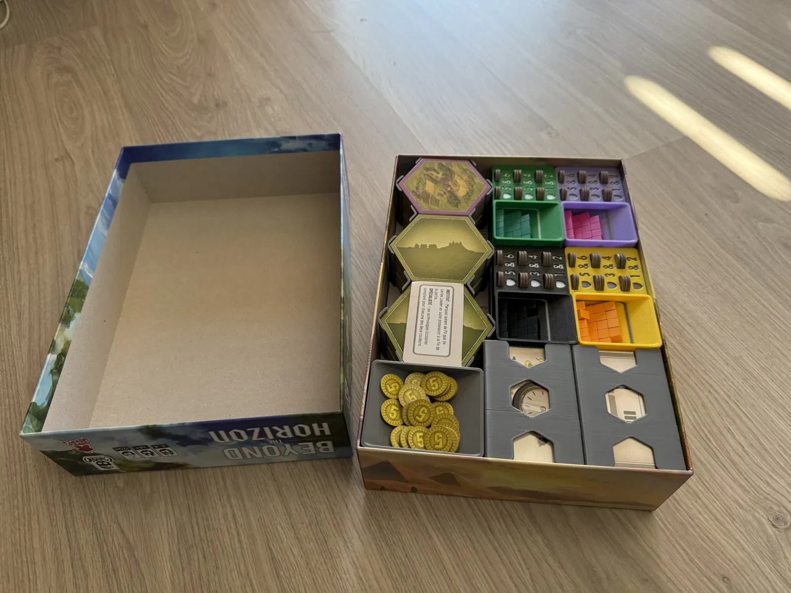 Cái insert này xài tốt cho bài có bọc sleeve, nhưng bài không sleeve cũng được. In ra dễ, không cần support. Có thể tùy chỉnh in kèm nam châm cho mấy khay tiền/token. Bản mini mở rộng cũng có sẵn.