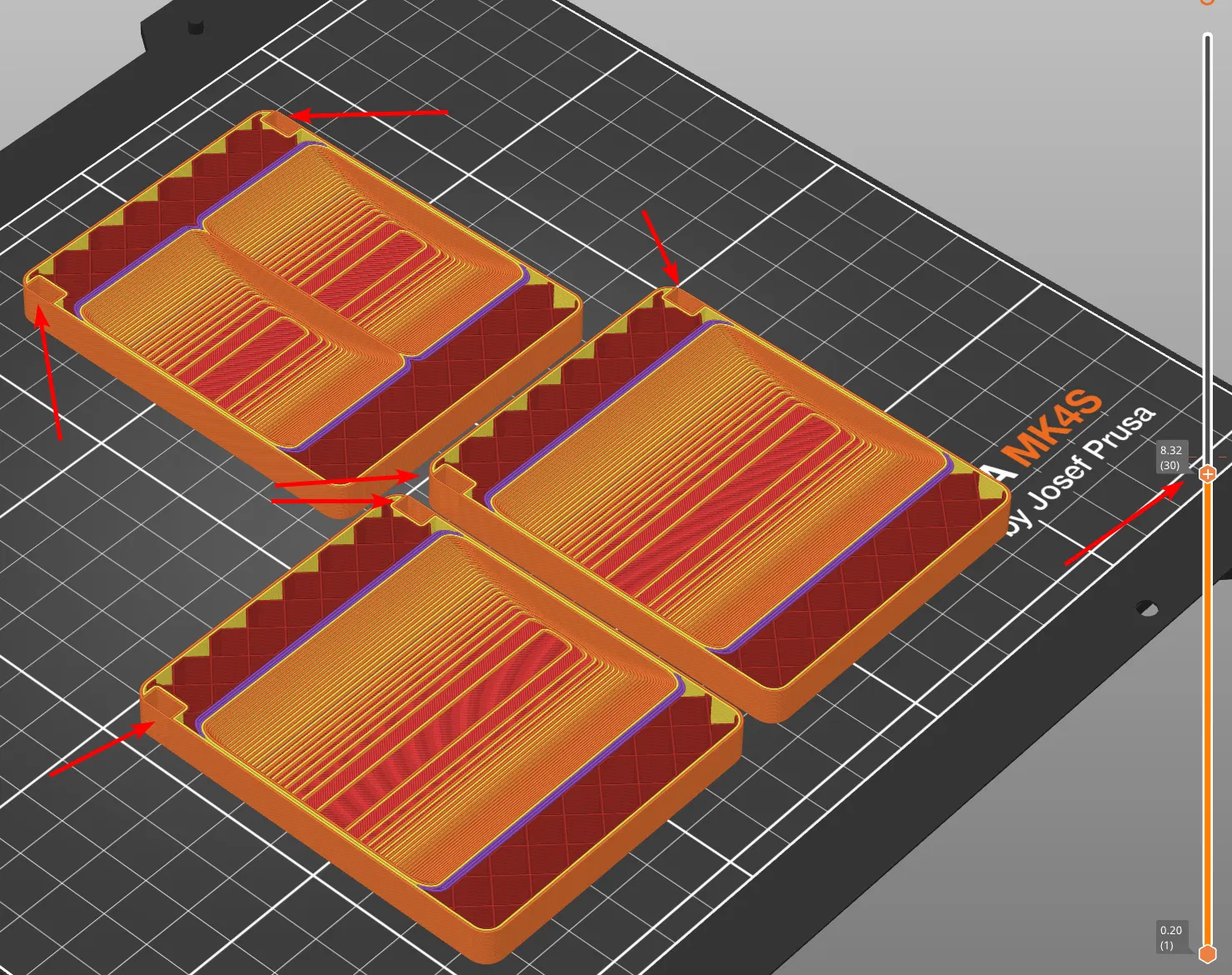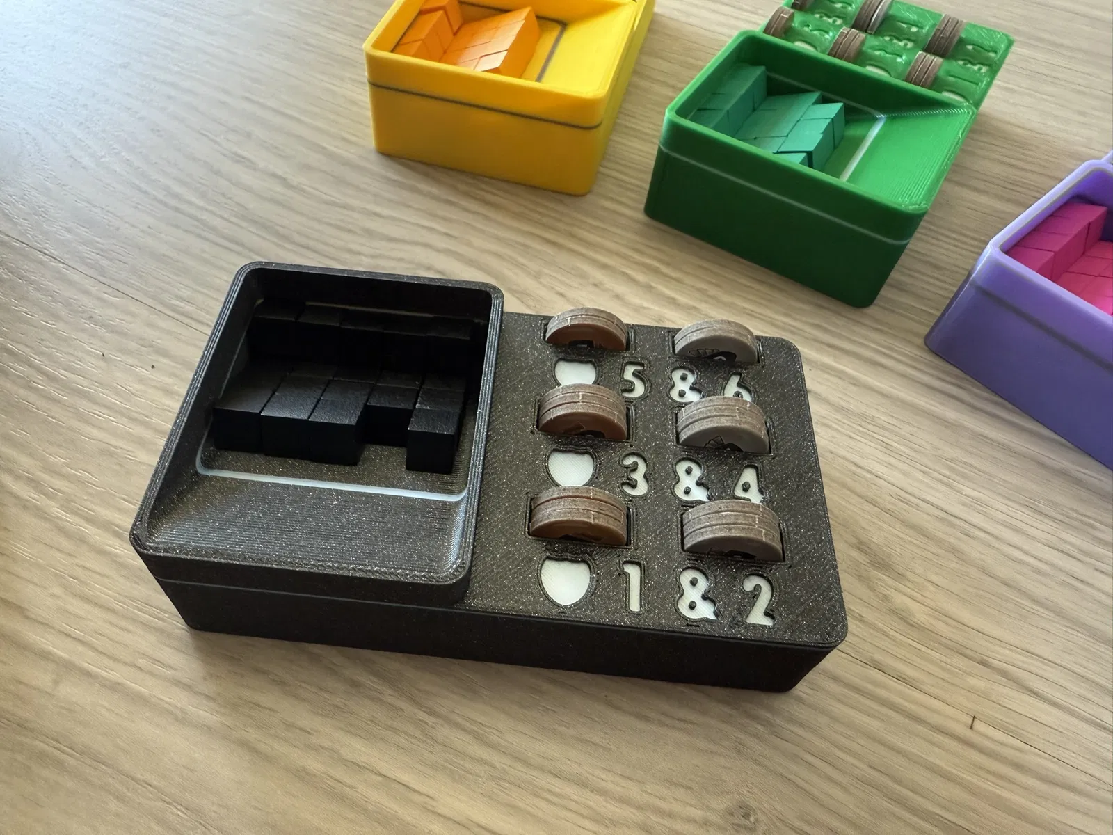 - Mấy cái khay đựng tiền với token có thể in kèm nam châm (hình trụ 6mm x 3mm) vô trong luôn, để lúc chơi mấy cái khay nó dính lại với nhau. Xem hình đính kèm để biết vị trí và lúc nào cần dừng in để thêm nam châm vô nha.