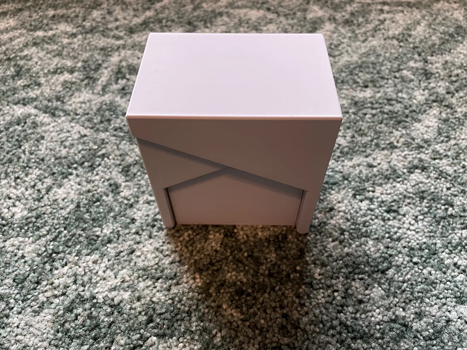 Hai nắp ở hai bên gập lên để giữ bài. Nhờ ma sát giữa các nắp và hộp, hộp đóng lại rất chắc chắn mà không cần thêm phụ kiện.