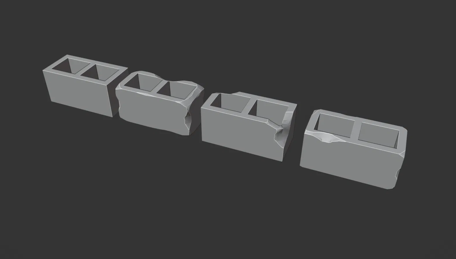 Bộ gồm 4 mẫu gạch lỗ, có 1 mẫu mới và 3 mẫu hư hỏng. Thích hợp làm vật liệu trang trí, mô hình thu nhỏ, tỉ lệ 1:1 có thể scale tùy ý.